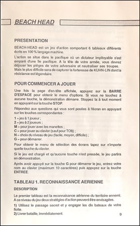 Beach-Head Ce jeu d'action (bataille navale et aérienne) a été créé par Acess Software en 1983 et adapté par D&L Research pour la version française en 1985. Il comporte 6 tableaux différents écrits en langage machine et se joue à un ou deux joueurs au clavier (sauf TO9) ou à la manette.