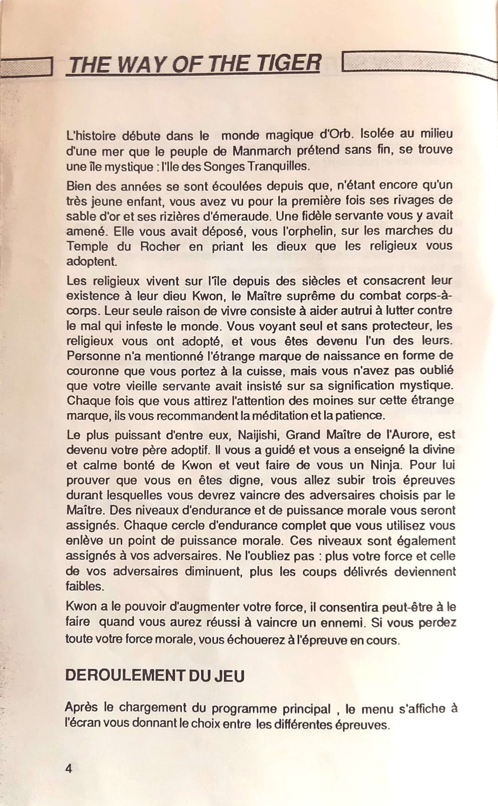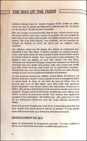 The Way Of Tiger Ce jeu de combat a été créé par Gremlin Graphics en 1986 pour les micro-ordinateurs Thomson. Pour MO5, MO6, le clavier ou la manette peuvent être utilisés. Pour TO7-70, TO8, TO9 et TO9+, seule la manette de jeu est disponible. Ce logiciel a obtenu le "Tilt d'or" de 1986 dans la catégorie "jeux de combat".