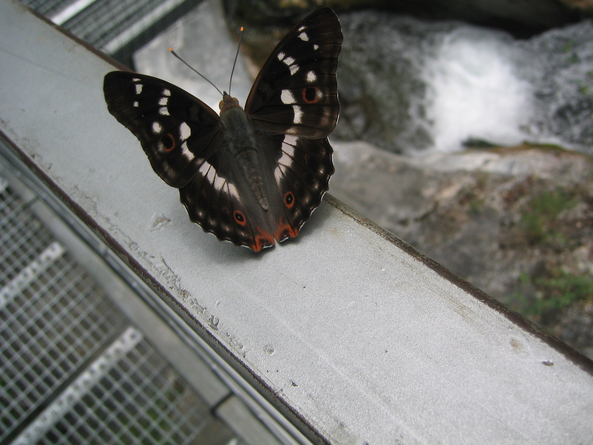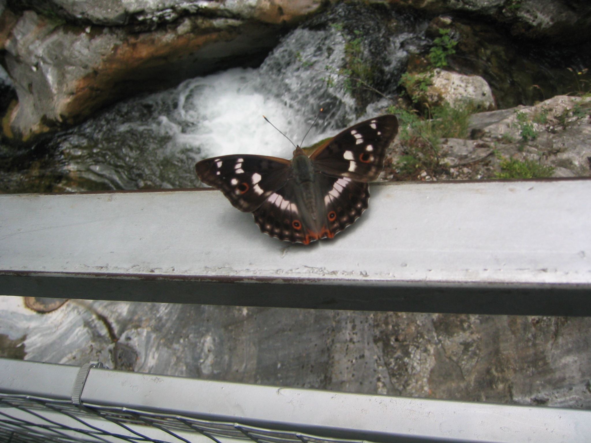 Le Grand mars changeant (Apatura iris) de la famille des Nymphalidés est un grand papillon brun bordé de noir avec des traits blancs sur les ailes antérieures et une sorte de "V" blanc sur les ailles postérieures. Le male a des reflets bleu violacé Ce papillon a été photographié dans les gorges de La Fou (Arles sur Tech) avant la fermeture en 2018. On le rencontre partout en France (sauf en Corse), en Europe et en Asie tempérée. Il aime les forêts de feuillus et les lieux humides. |