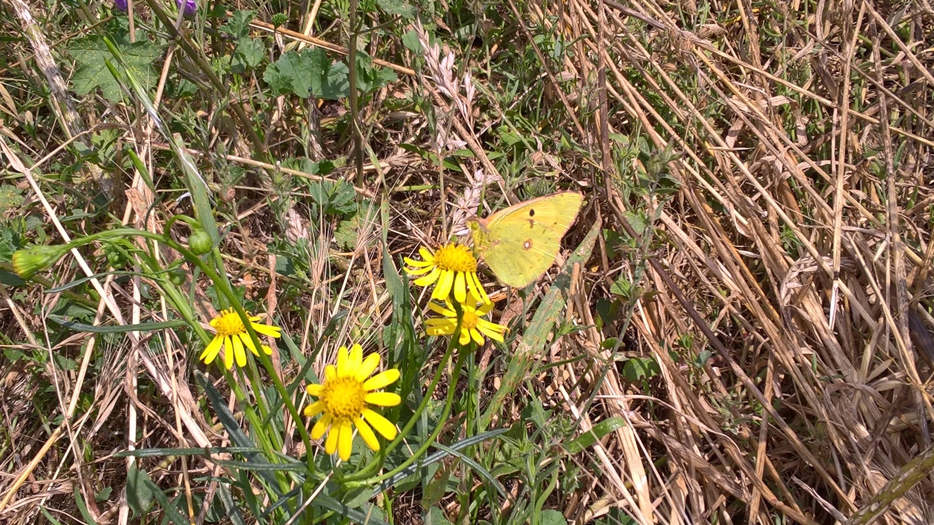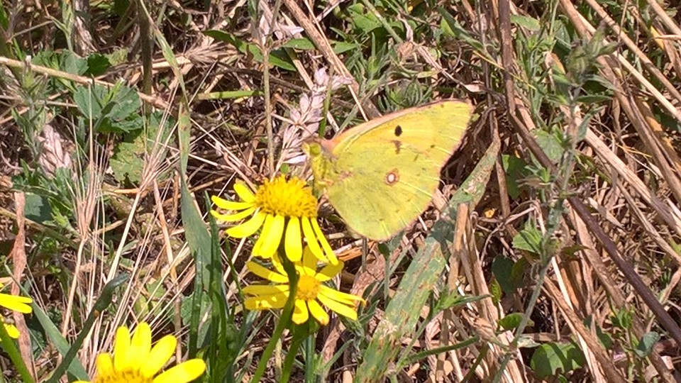 Le Souci (Colias crocea ou Colias croceus) est une espèce paléarctique de lépidoptères (papillons) migrateurs de la famille des Pieridae et de la sous-famille des Coliadinae. Souci est un papillon de taille moyenne, dont l'envergure varie de 42 à 54 mm. Le dessus des ailes a un fond jaune orangé avec une tache discoïdale noire à l'aile antérieure, une tache discoïdale orangée à l'aile postérieure, et une épaisse bordure noire aux quatre ailes. Chez la femelle, cette bordure contient des taches jaunes. Le dessous des ailes est jaune avec des taches discoïdales et quelques taches postdiscales sombres. Le Souci se rencontre en Afrique du Nord, au Moyen-Orient jusqu'en Iran, et dans toute l'Europe sauf le Nord de la Scandinavie. Il est autochtone dans les régions tempérées du pourtour méditerranéen, et migre au printemps vers l'Europe. On le trouve dans tous les départements de France métropolitaine Ce papillon a été photographié aux environs d'Argelès (P.O.) |