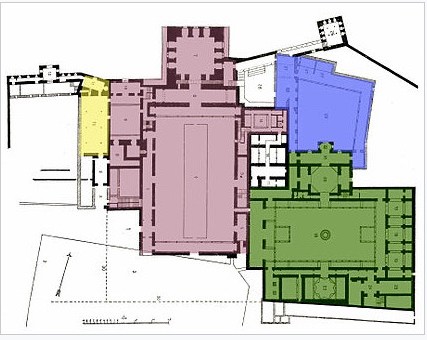Plan des palais Nasrides : - en jaune, le Mexuar ; - en rouge, le palais de Comares ; - en vert, le palais des Lions ; - en bleu, les logis de l'empereur. |