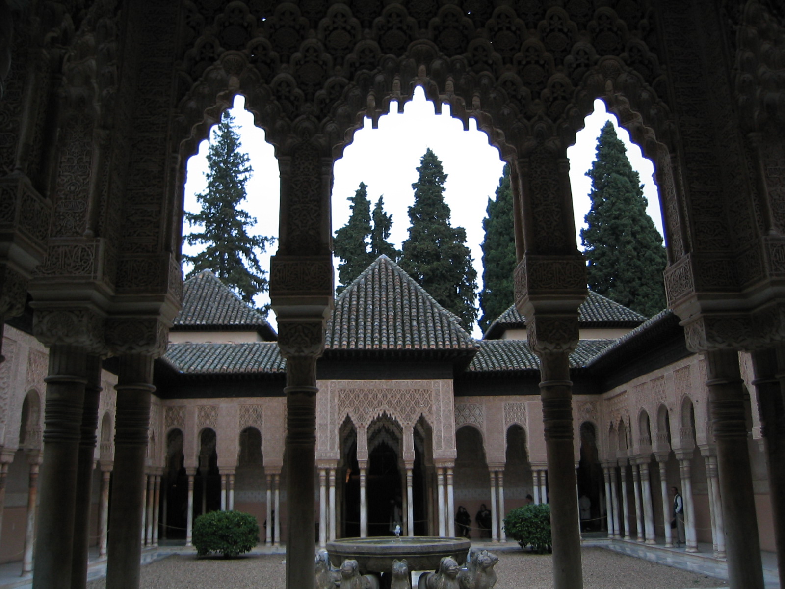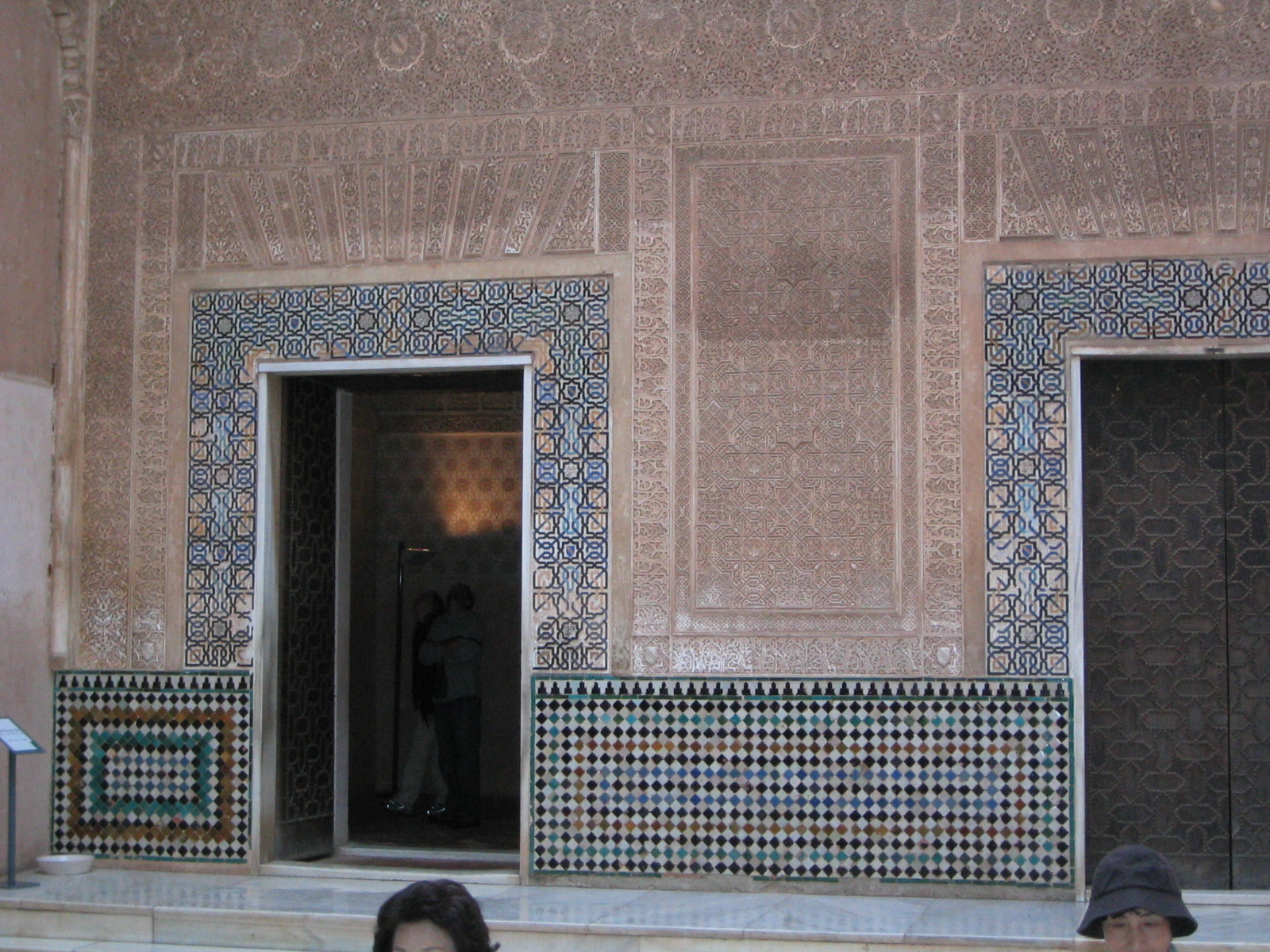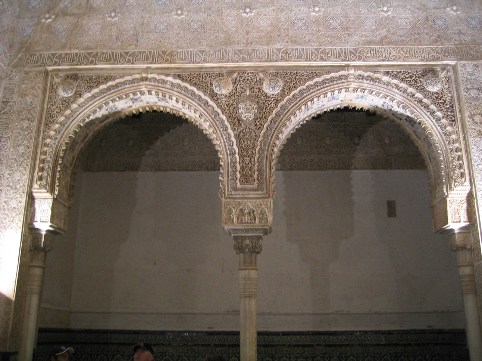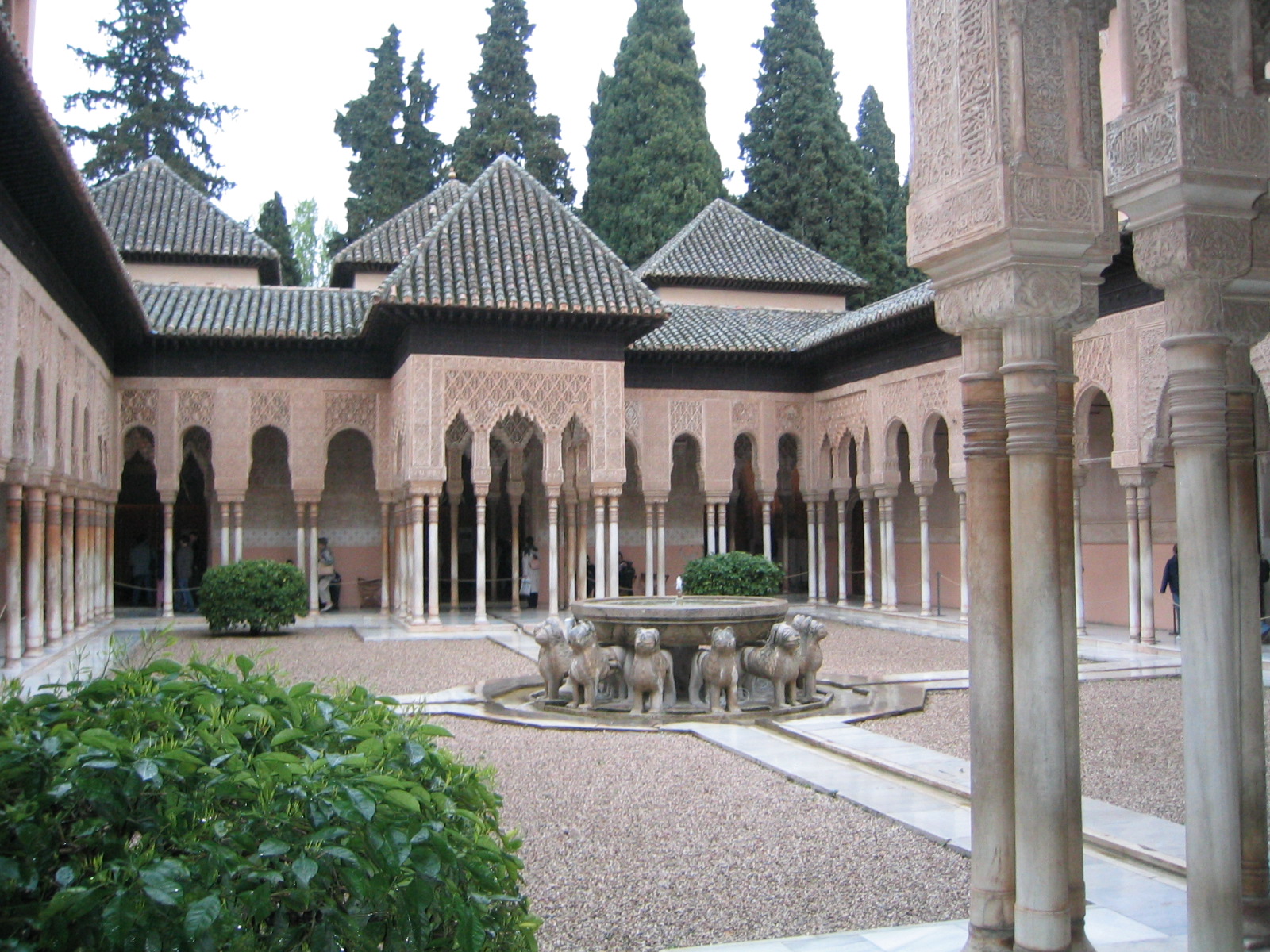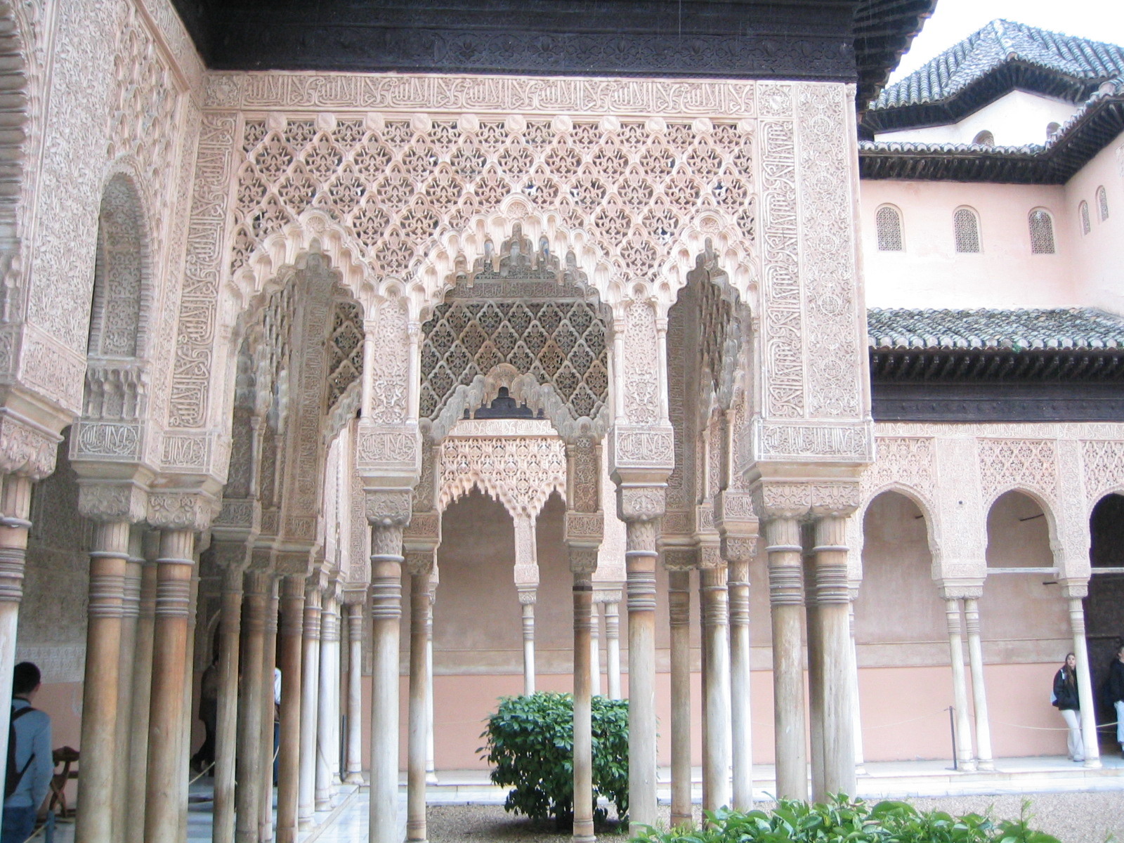 Les palais nasrides de l'Alhambra constituent un complexe de bâtiments ornementaux bâtis sur plusieurs générations. Les salles sont communicantes et donnent sur des cours intérieures ; elles suivent un tracé orthogonal.