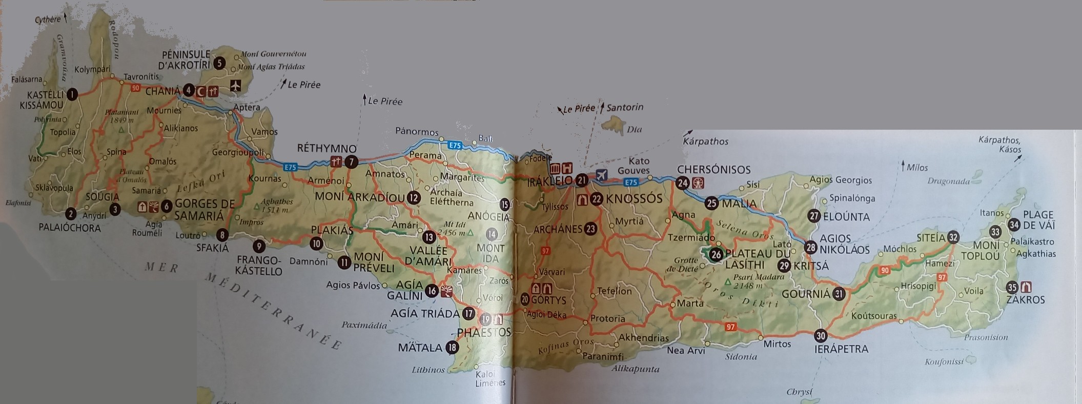 Géographie La Crète est la plus grande des îles grecques. Elle est située au sud de la Mer Egée à équidistance de l'Europe, de l'Asie Mineure et de l'Afrique. C'est une île montagneuse de 260 kilomètres de long et entre 17 et 70 kilomètres de large. Les Montagnes Blanches comprennent plus de 30 sommets de plus de 2000m d’altitude (point culminant 2453m). Ce relief se compose de quatre ensembles montagneux qui sont isolés les uns des autres par des plateaux et des dépressions. Ces reliefs sont plus élevés à l’Ouest de l’île qu’à l’Est et plus abrupts au Sud qu’au Nord. La Crète, paradis de la randonnée, cache des paysages sublimes et des gorges spectaculaires Un peu d'histoire Habitée au moins depuis le Néolithique, la Crète est le berceau de la civilisation minoenne qui domine la Méditerranée orientale du XXVème au Xème siècle av. J.-C., avant de s'effacer devant l'essor de la Grèce continentale. L'ïle, tout au long de son histoire, a subi l'occupation de cités-Etats grecques (Mycènes, Sparte, Athènes, ...) et de puissances étrangères : Doriens, Egyptiens, Romains, romains d'orient (Byzantins), arabes (d'Andalous), Vénitiens, Ottomans (persécution religieuse), Anglais, Allemands (Seconde Guerre mondiale) Pendant presque trois millénaires, les ruines de la civilisation minoenne sont restées enterrées, oubliées de tous. Ce n'est qu'au début du XXème siècle que les vestiges des grands palais de Knossos, Phaistos, Malia et Zakros furent mis au jour. Leur splendeur atteste le raffinement et la richesse artistique de la civilisation minoenne, considérée aujourd'hui comme la source de la culture européenne. L'éruption de Santorin vers 1400 av J.-C. porte un coup fatal à la civilisation minoenne. Le tremblement de terre provoqué par l'éruption et la destruction des cités qu'il engendre, favorise les incursions des Mycéniens. |