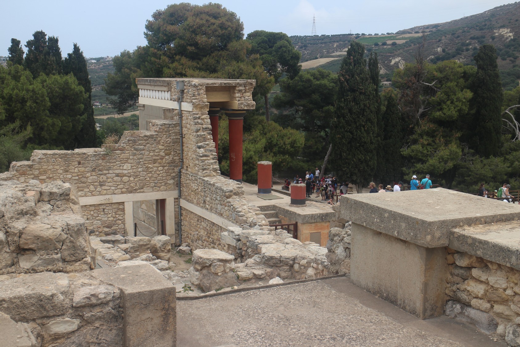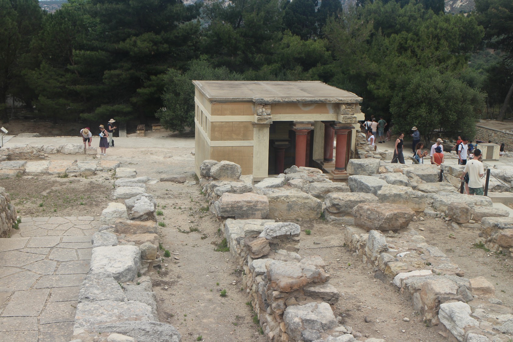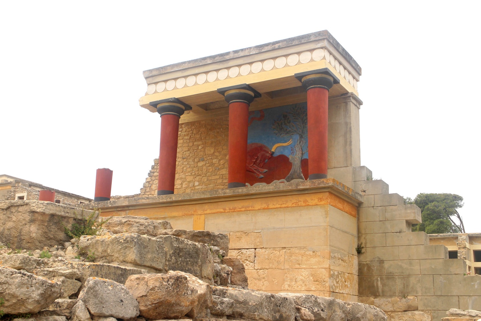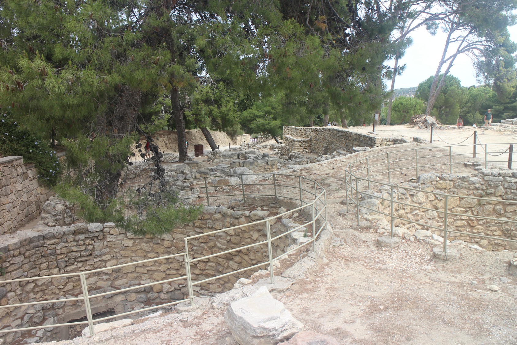 Site archéologique de Knossos (ou Cnossos) près d'Héraklion. C'est aujourd'hui le plus important des palais minoens crétois, il a été découvert en 1878. Associé à la légende du palais du roi Minos, le site, occupé depuis 7000 av. J.-C., fut probablement la capitale de la Crète lors de la période minoenne. Un archéologue britannique, Arthur Evans, achète l'ensemble du site et entame des fouilles de grande envergure. Utilisant des paysans locaux comme fouilleurs, Evans a mis au jour en quelques mois une partie importante d'un ensemble qu'il a considéré être le palais de Minos. En réalité, Cnossos est un ensemble complexe de plus de 1 000 pièces imbriquées et servait à la fois de centre administratif et religieux, mais aussi de centre de stockage de denrées. Plan du site