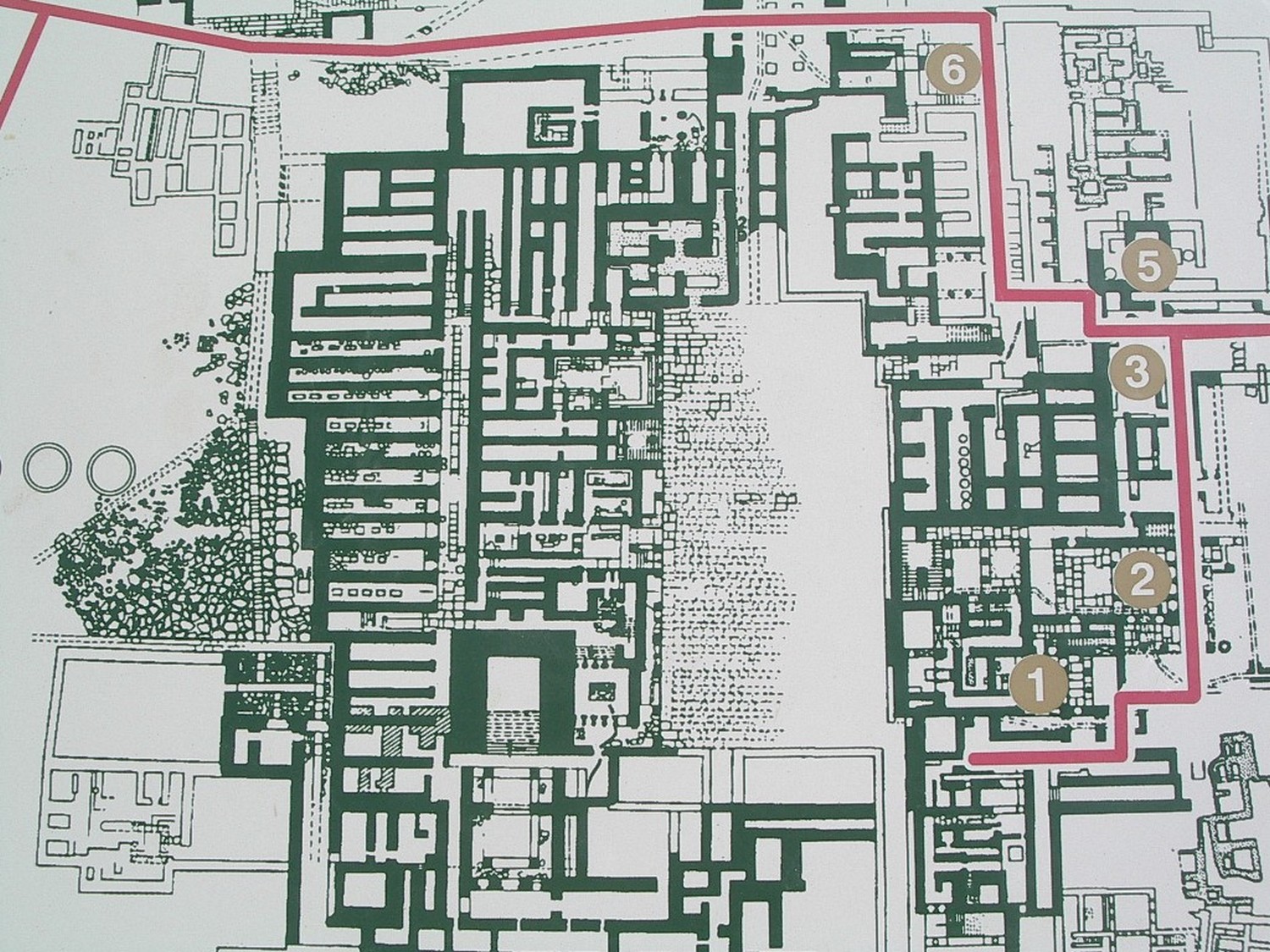 Structure du palais de Cnossos : 1-Place ouest. 2-Silos. 3-Rue royale 4-Propylées ouest. 5-Couloir des processions. 6-Couloir du prince des lys. |