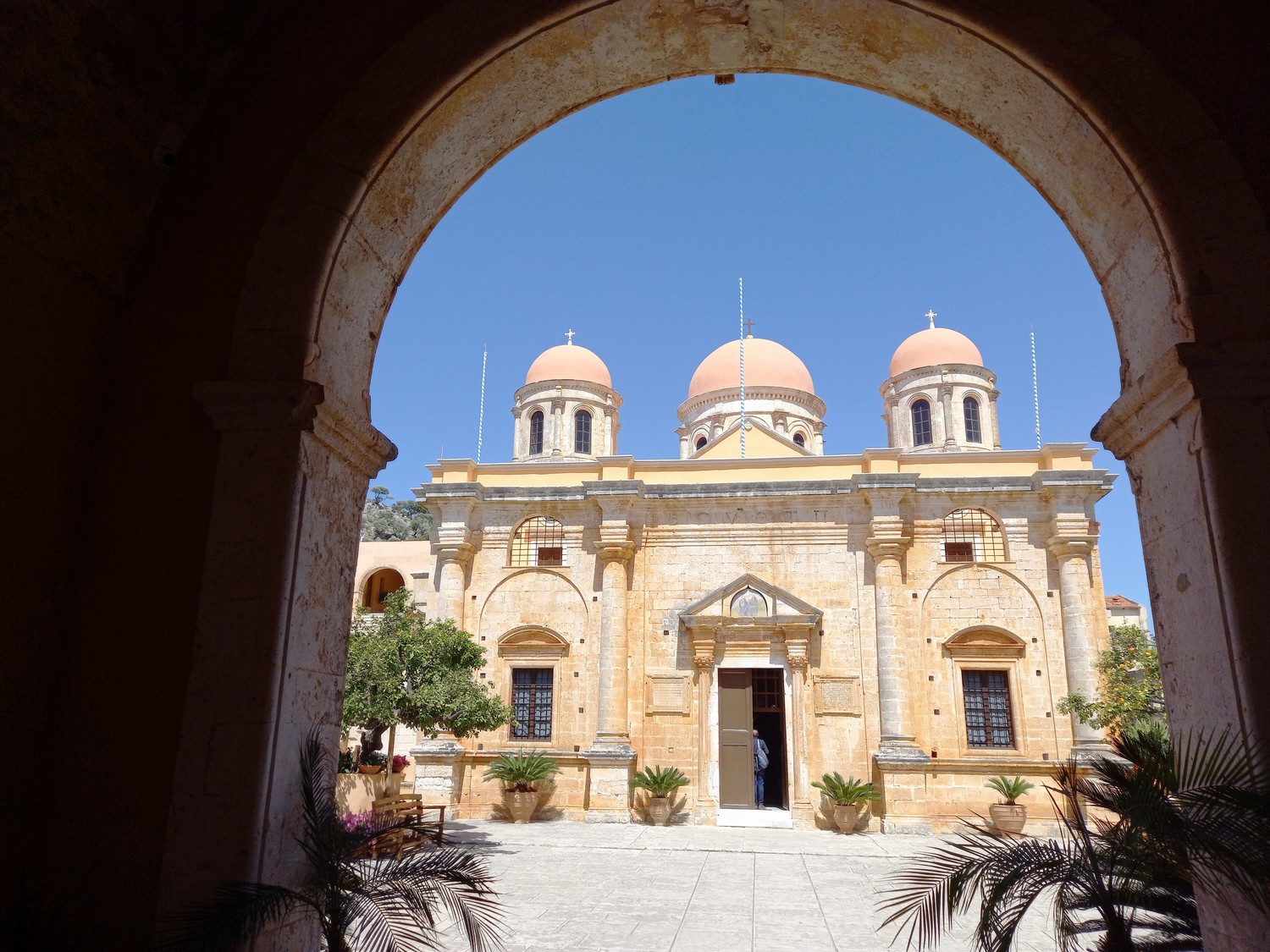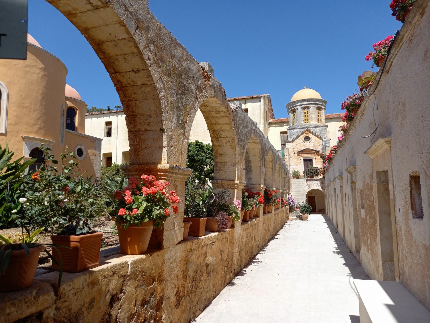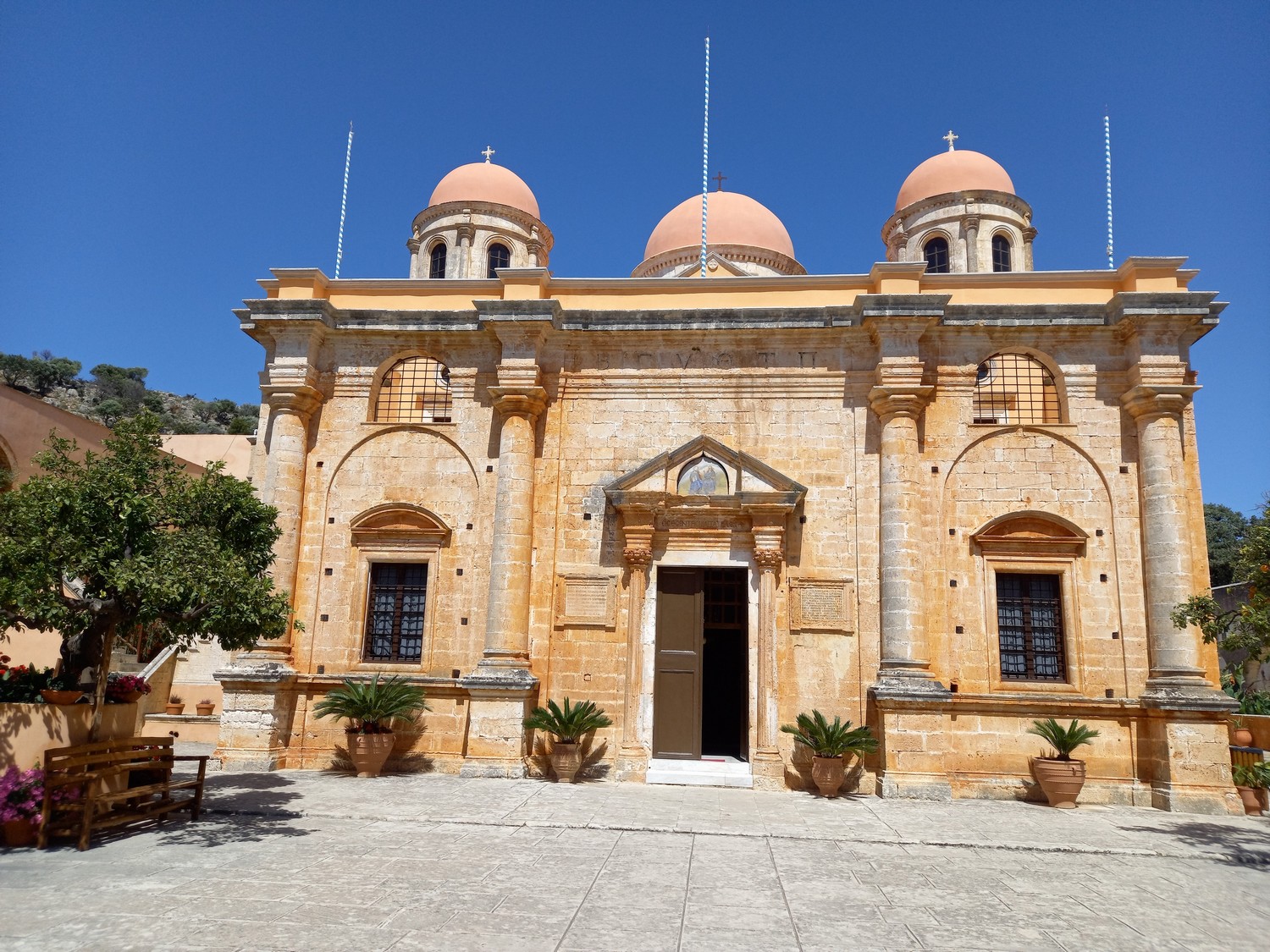 La péninsule d'Akrotiri Cette péninsule se situe à proximité de La Canée. Dans ses collines du nord-est, se trouve un des sites remarquables : le monastère d'Agias Triadas avec sa belle église à plusieurs dômes qui date du XVII ème siècle. Bâtiments du monastère