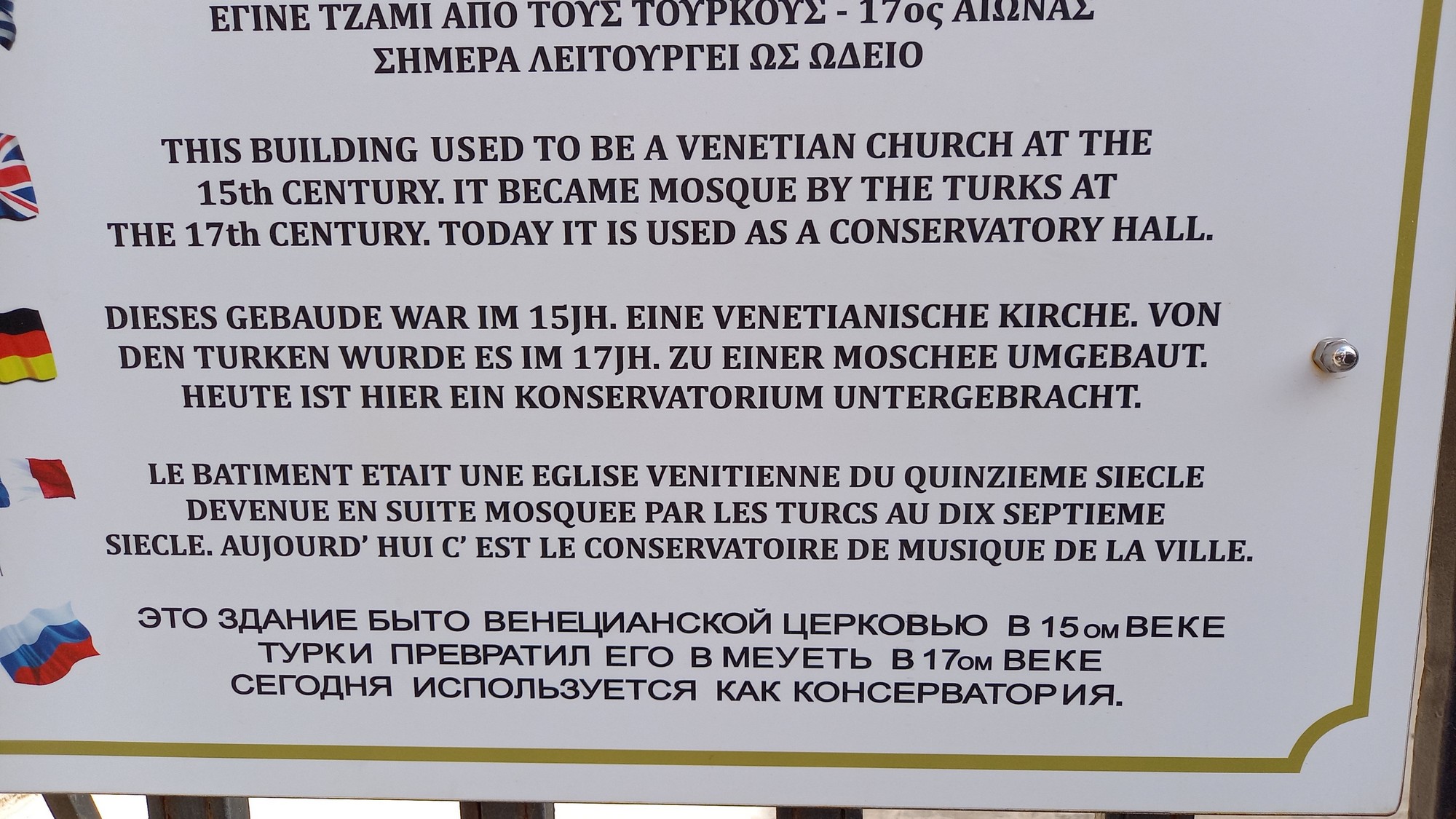 La mosquée NerantzesElle a été aménagée par les Turcs dans les murs de l'église Santa Maria au 17 ème siècle. En 1890, elle fut dotée d'un imposant minaret. Elle abrite maintenant l'école de musique municipale.