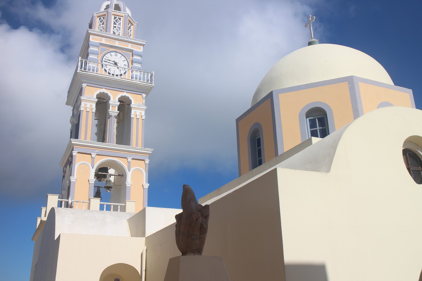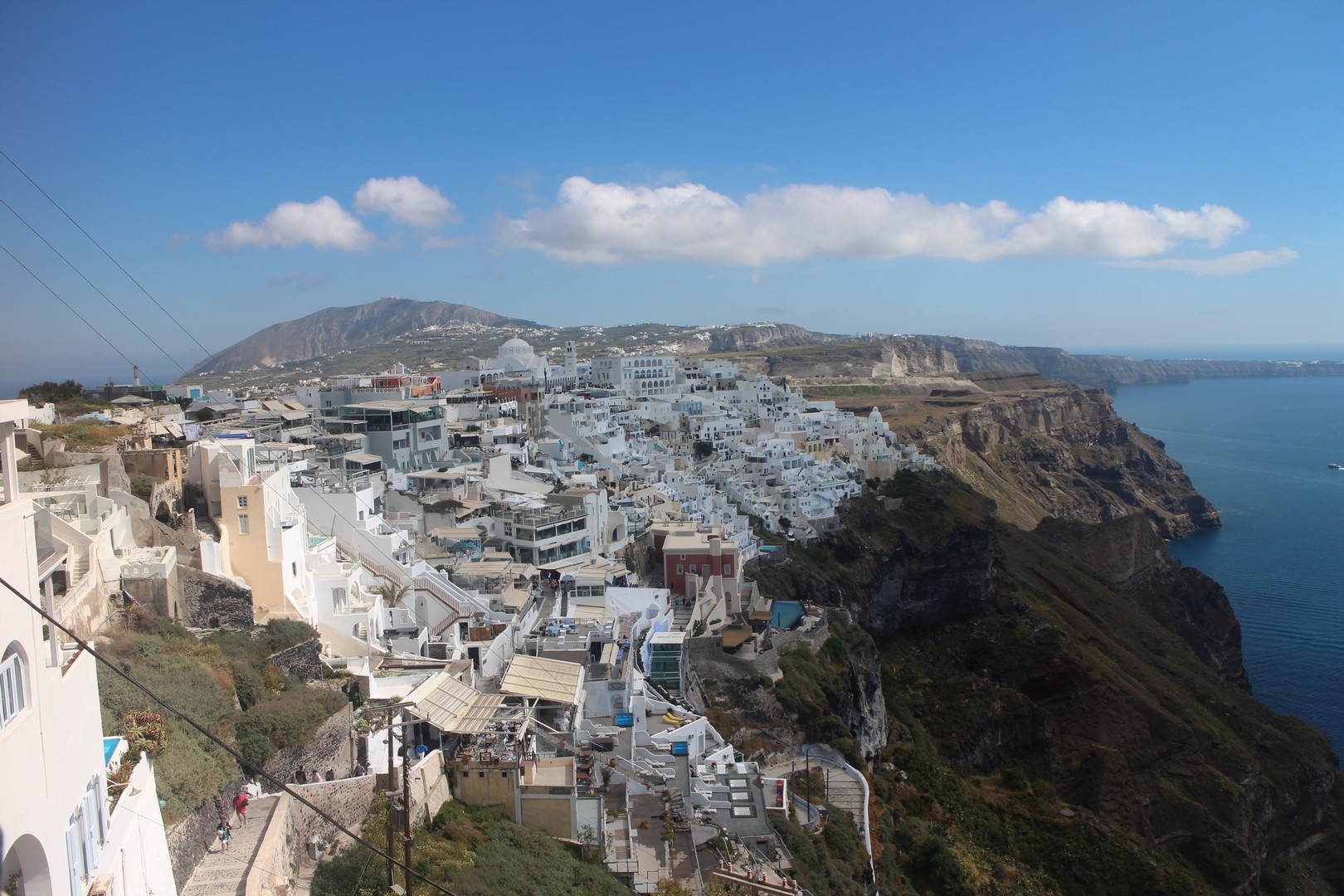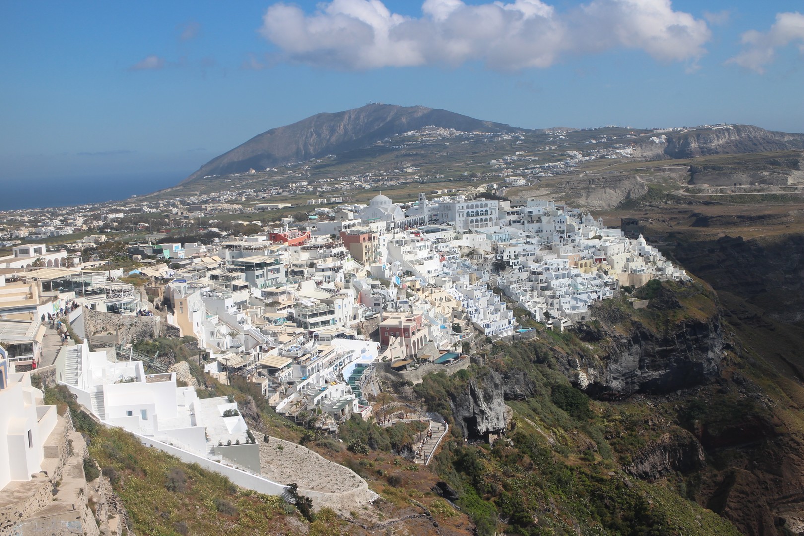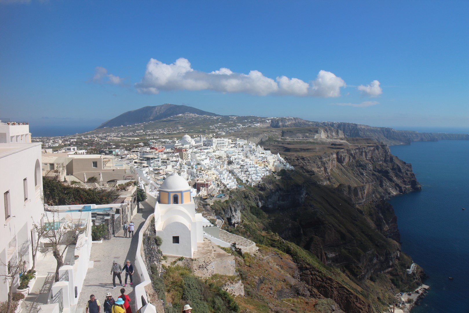 Fira est la ville principale de Santorin Elle est construite au bord de la falaise qui est issue de l'effondrement du cratère volcanique (caldéra) qui a anglouti le centre de l'ancienne île vers 1600 av. J.-C. au cours de l'éruption minoenne et a balayé cette civilisation. |