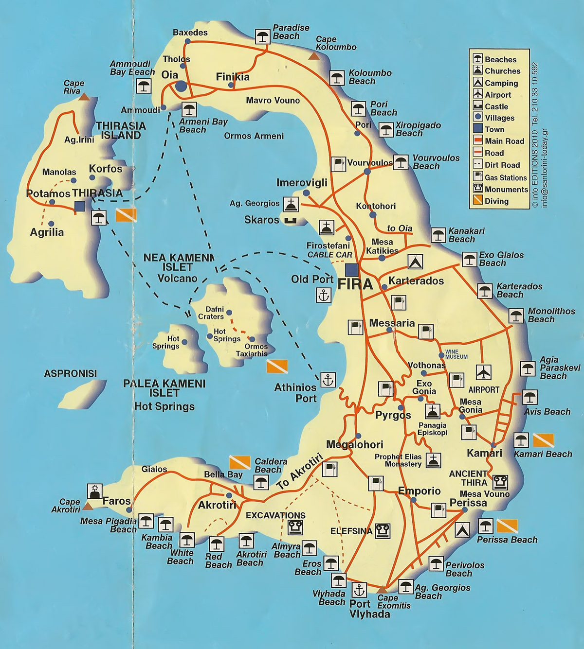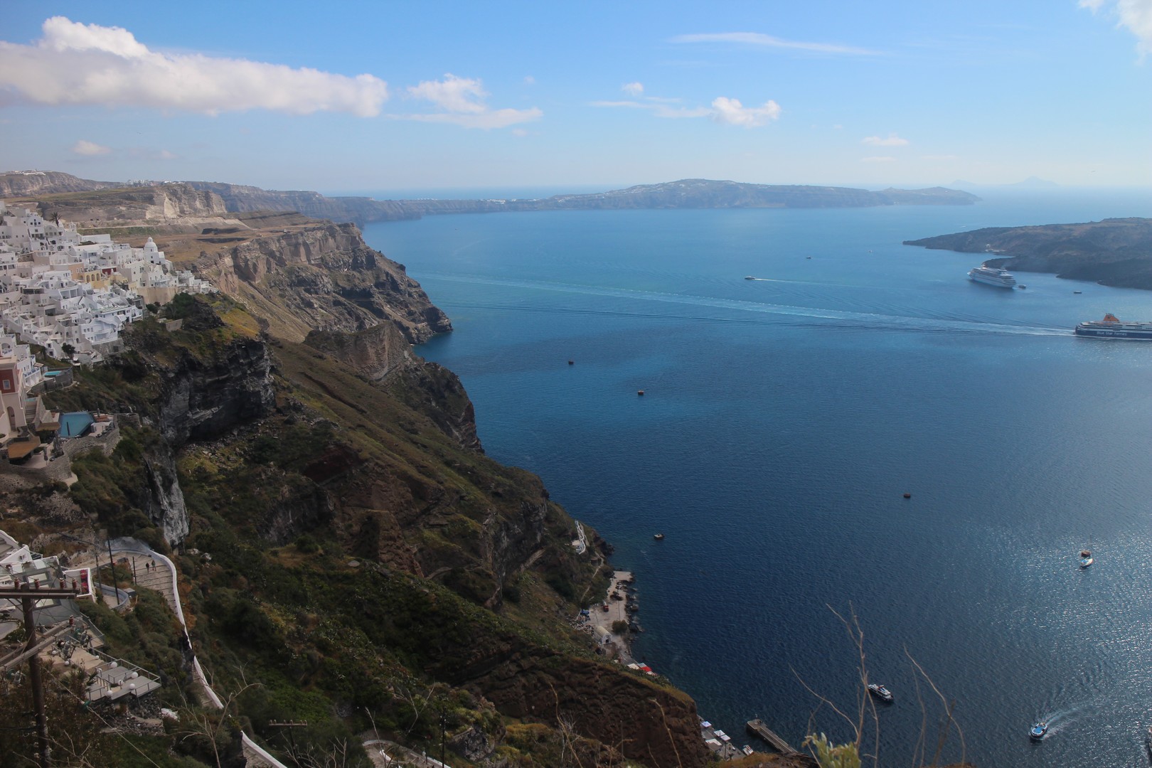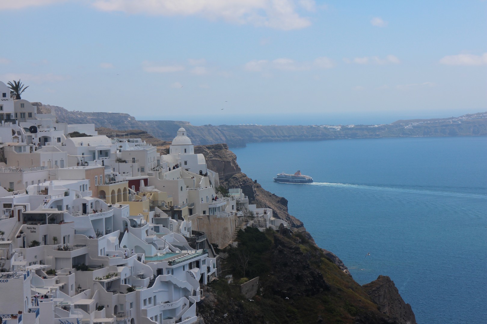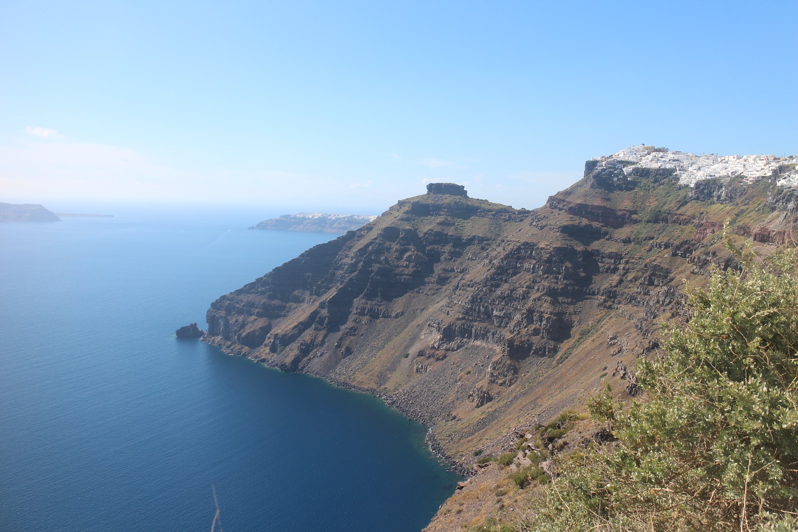 Fira est la ville principale de Santorin Elle est construite au bord de la falaise qui est issue de l'effondrement du cratère volcanique (caldéra) qui a anglouti le centre de l'ancienne île vers 1600 av. J.-C. au cours de l'éruption minoenne et a balayé cette civilisation. |