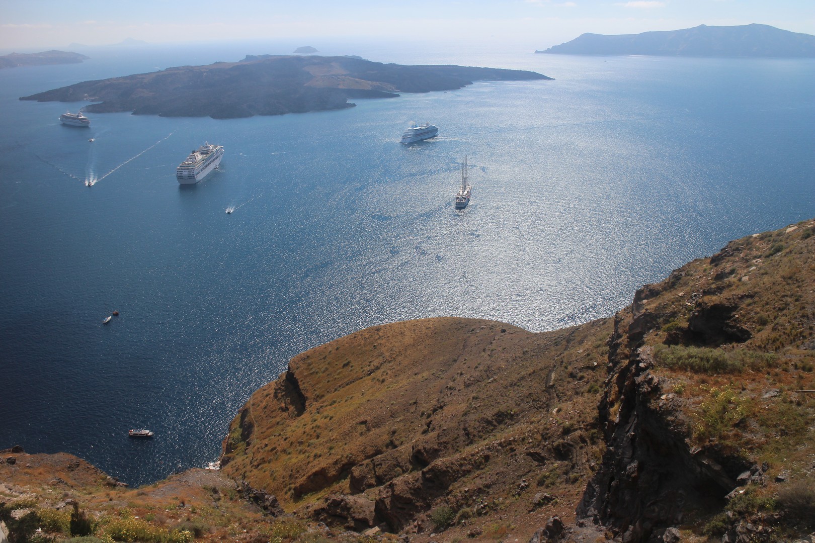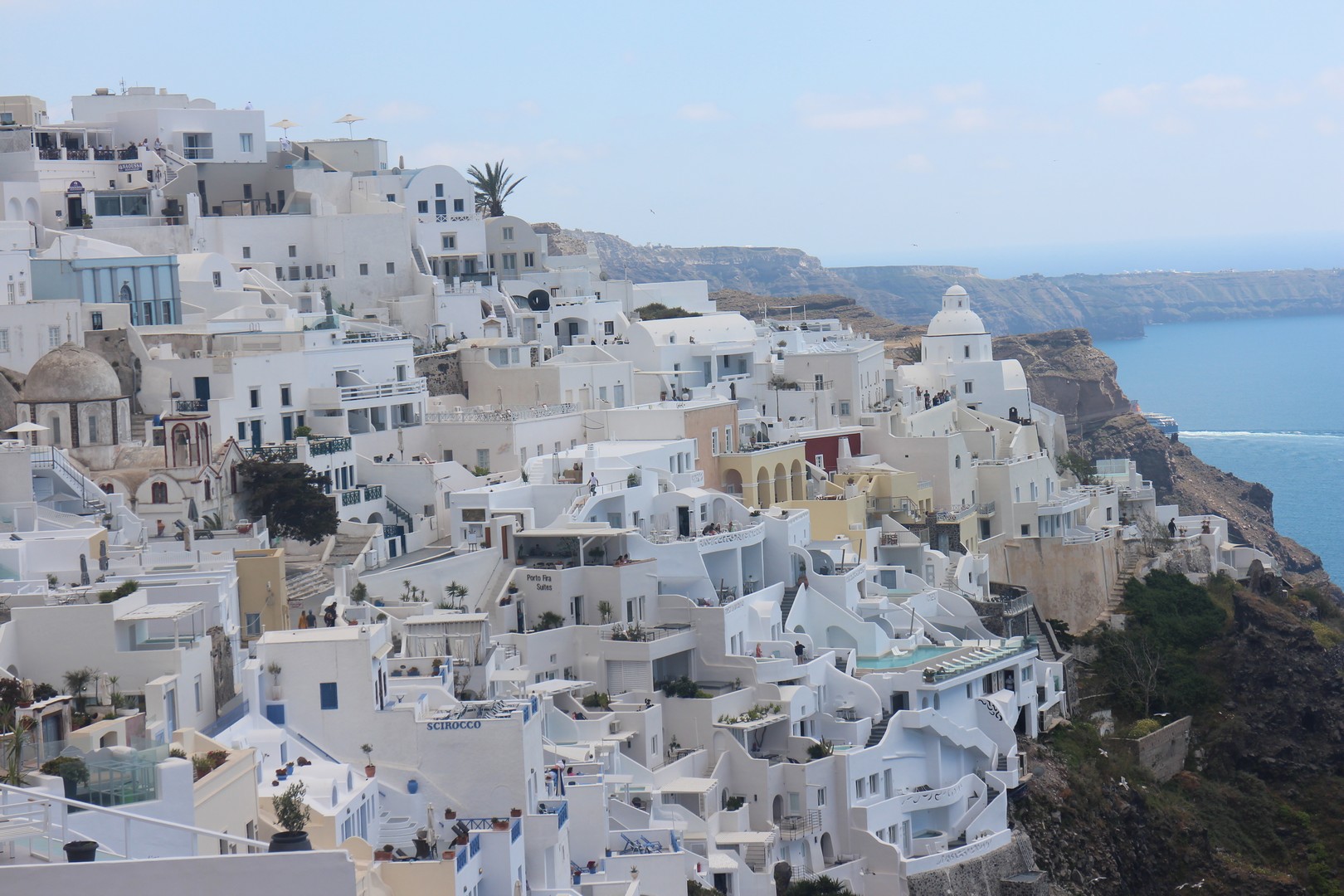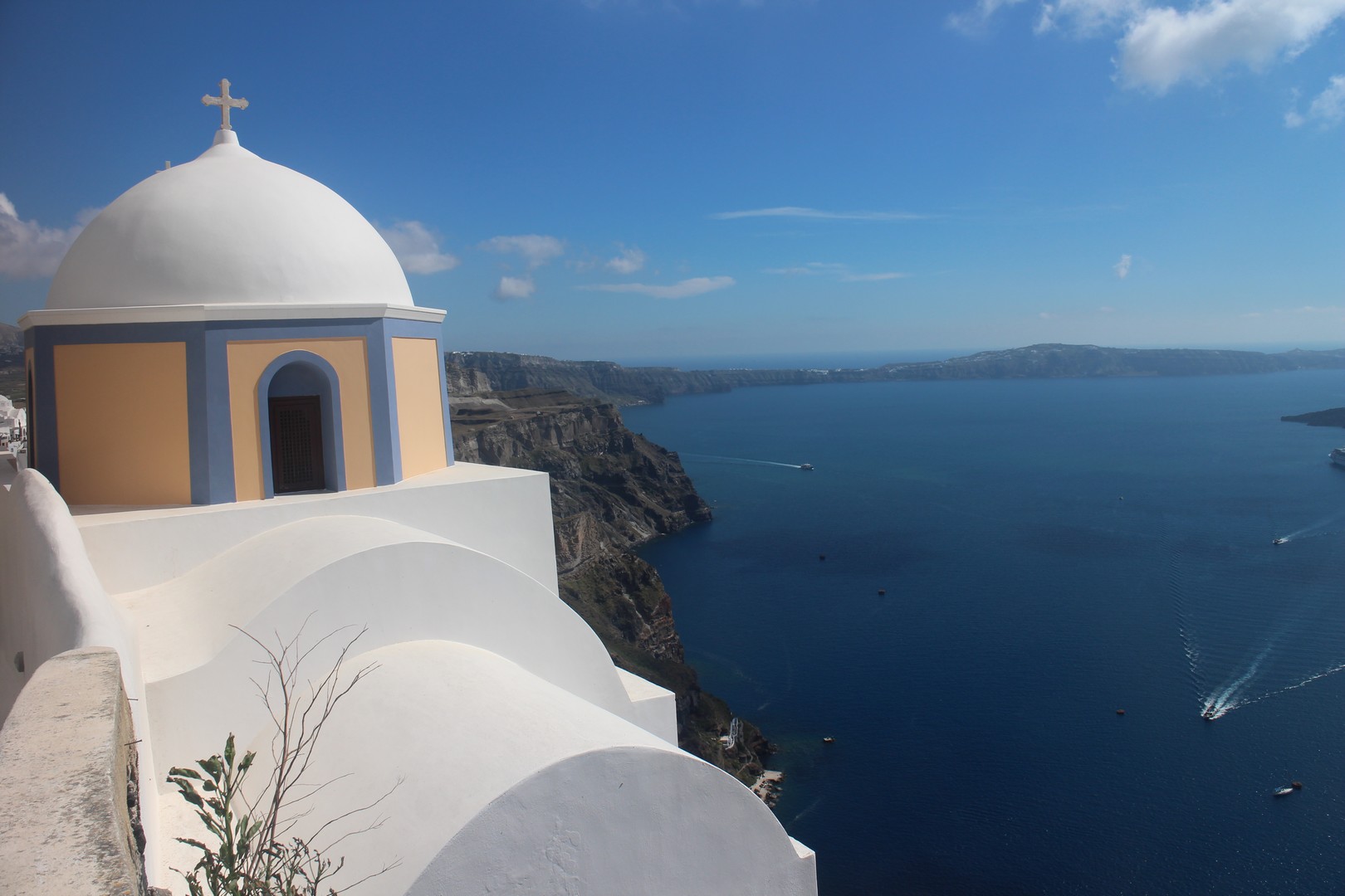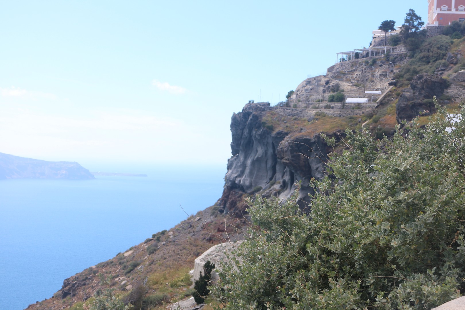 Fira est la ville principale de Santorin Elle est construite au bord de la falaise qui est issue de l'effondrement du cratère volcanique (caldéra) qui a anglouti le centre de l'ancienne île vers 1600 av. J.-C. au cours de l'éruption minoenne et a balayé cette civilisation. |