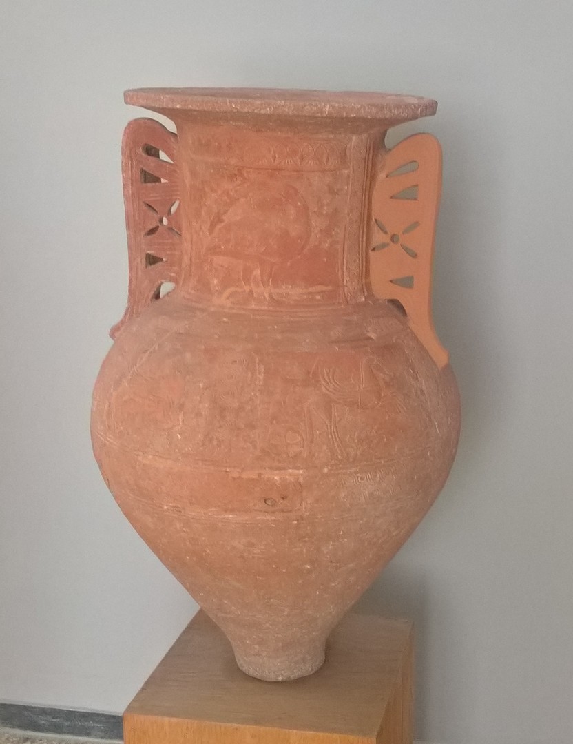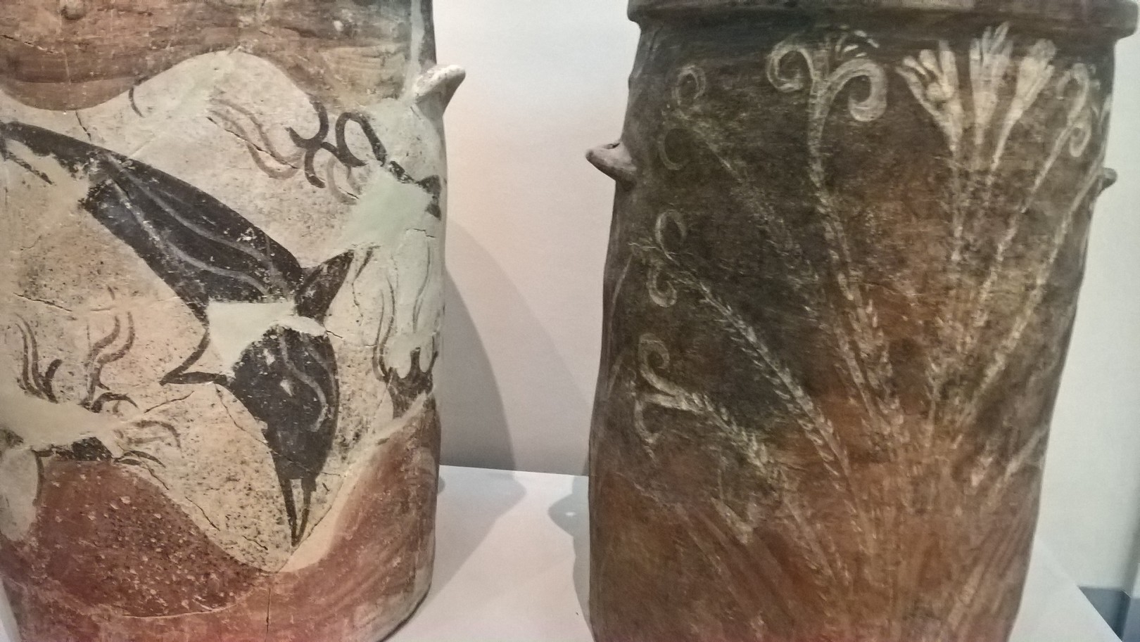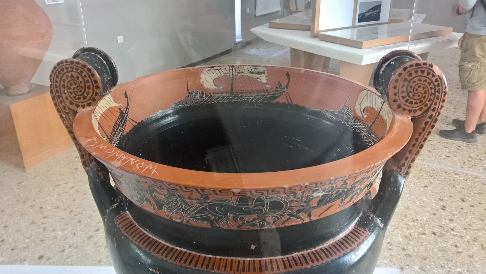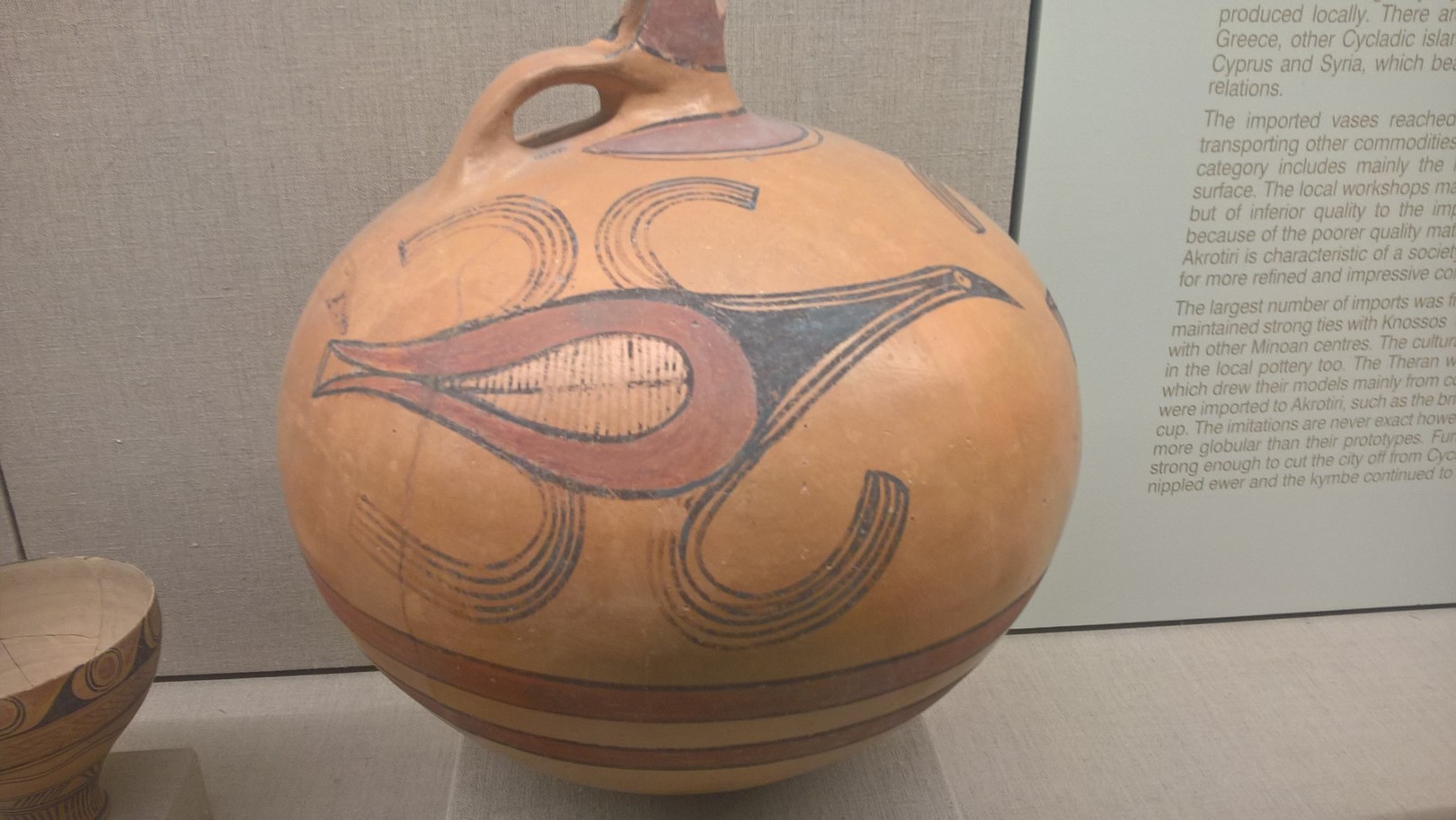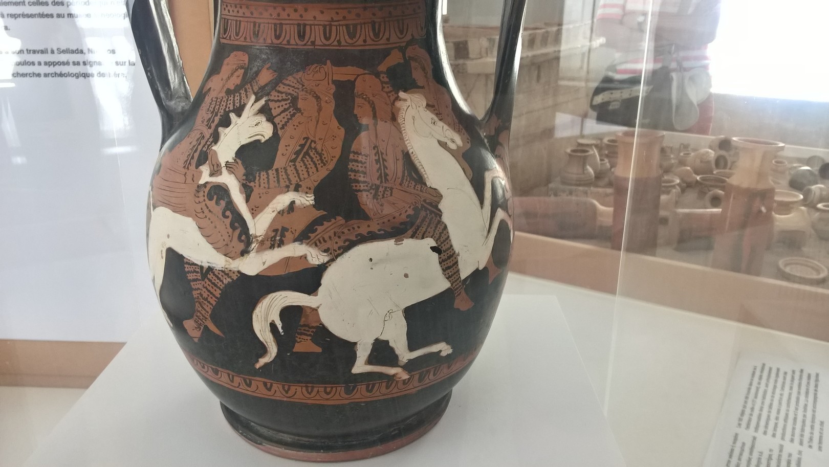 Amphore Cette amphore à anses ouvragées et décor sur la panse provient d'un atelier cycladique. Elle a été découverte en 1956 de manière fortuite dans le secteur nord-est de Sellada à l'occasion de la création de la voie carrossable conduisant à la cité antique de Théra. On y distingue un char antique (quadrige) tiré par des chevaux ailés. Vase avec scène de combat Cratère à volutes avec des figures noires C'est une offrande à Timosthène décédé, comme en témoigne l'inscription (en alphabet de Théra) sur la surface horizontale du bord. Dans la partie décorée du bord, sont représentés à l'intérieur quatre bateaux et à l'extérieur des scènes de combats autour de chars, avec la participation d'Athéna. Le musée préhistorique Figurines en marbre datant de 2800 à 2300 av-JC