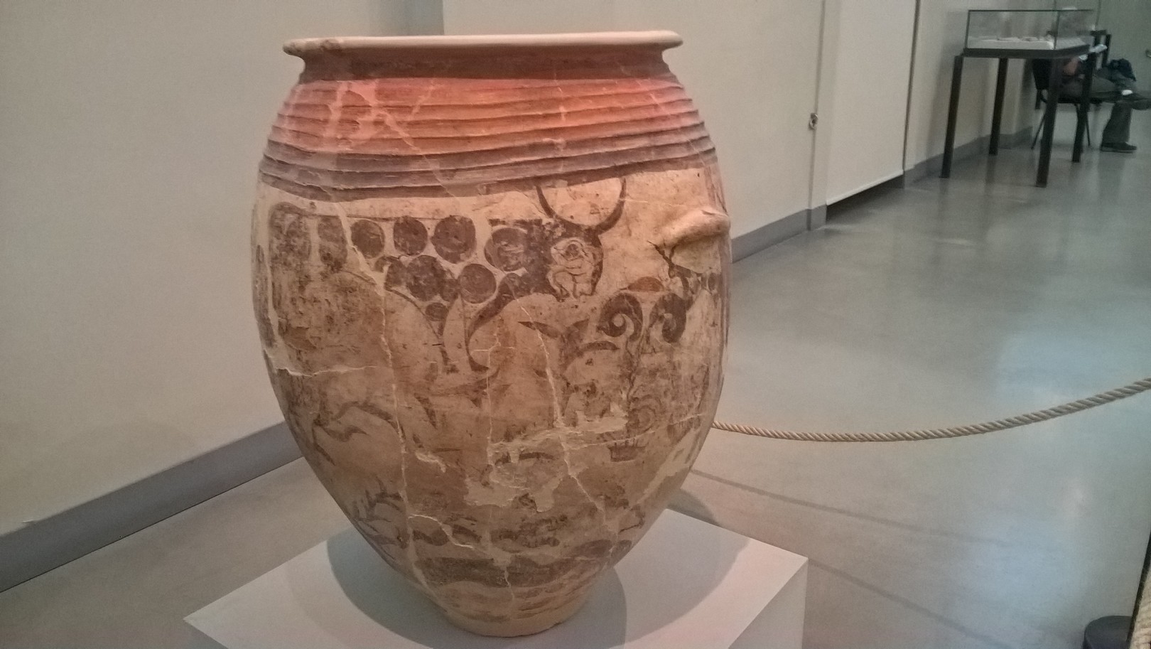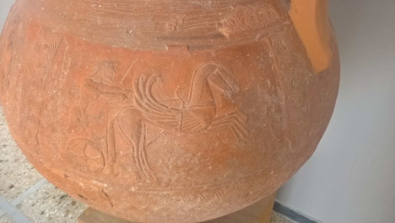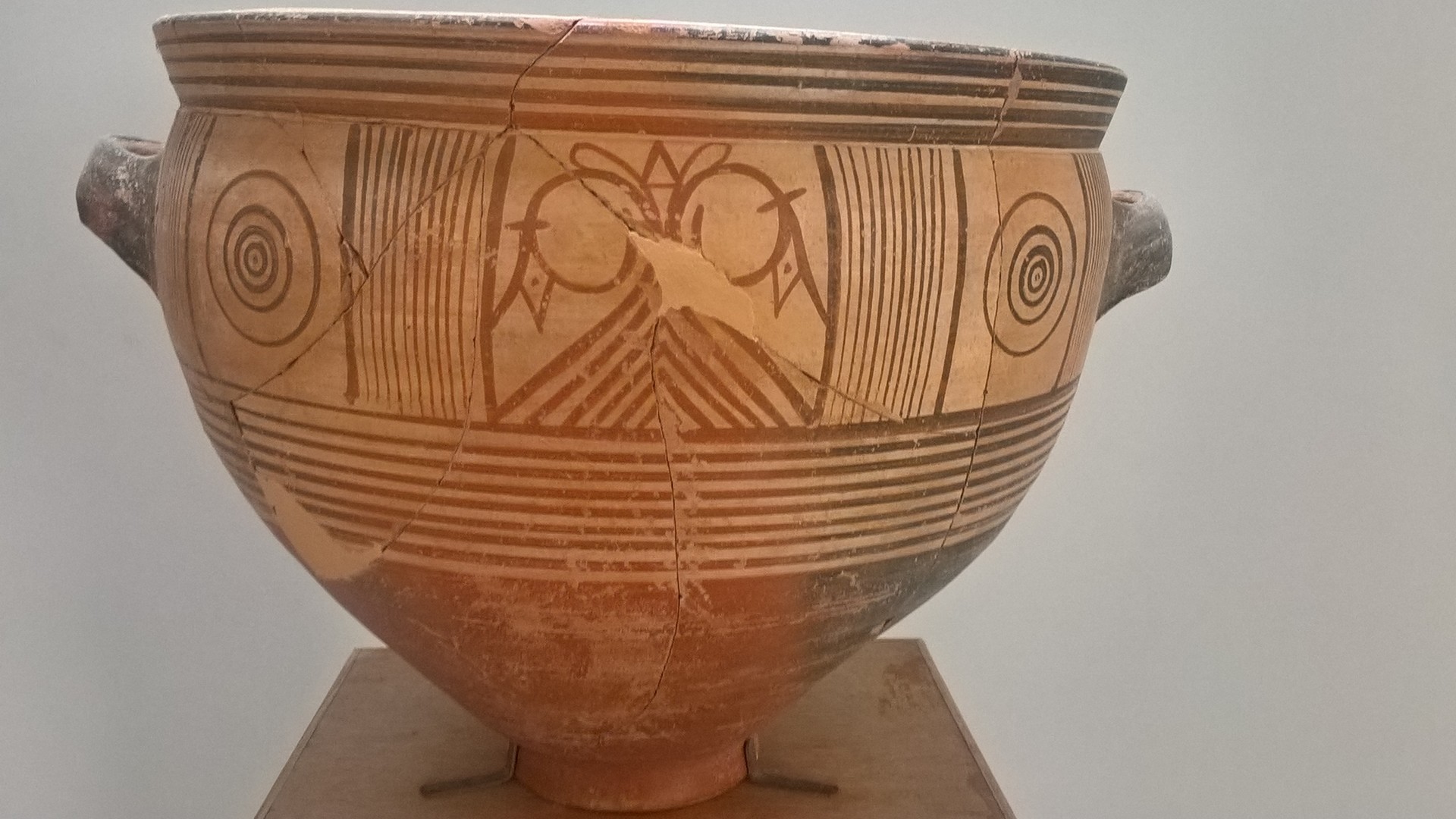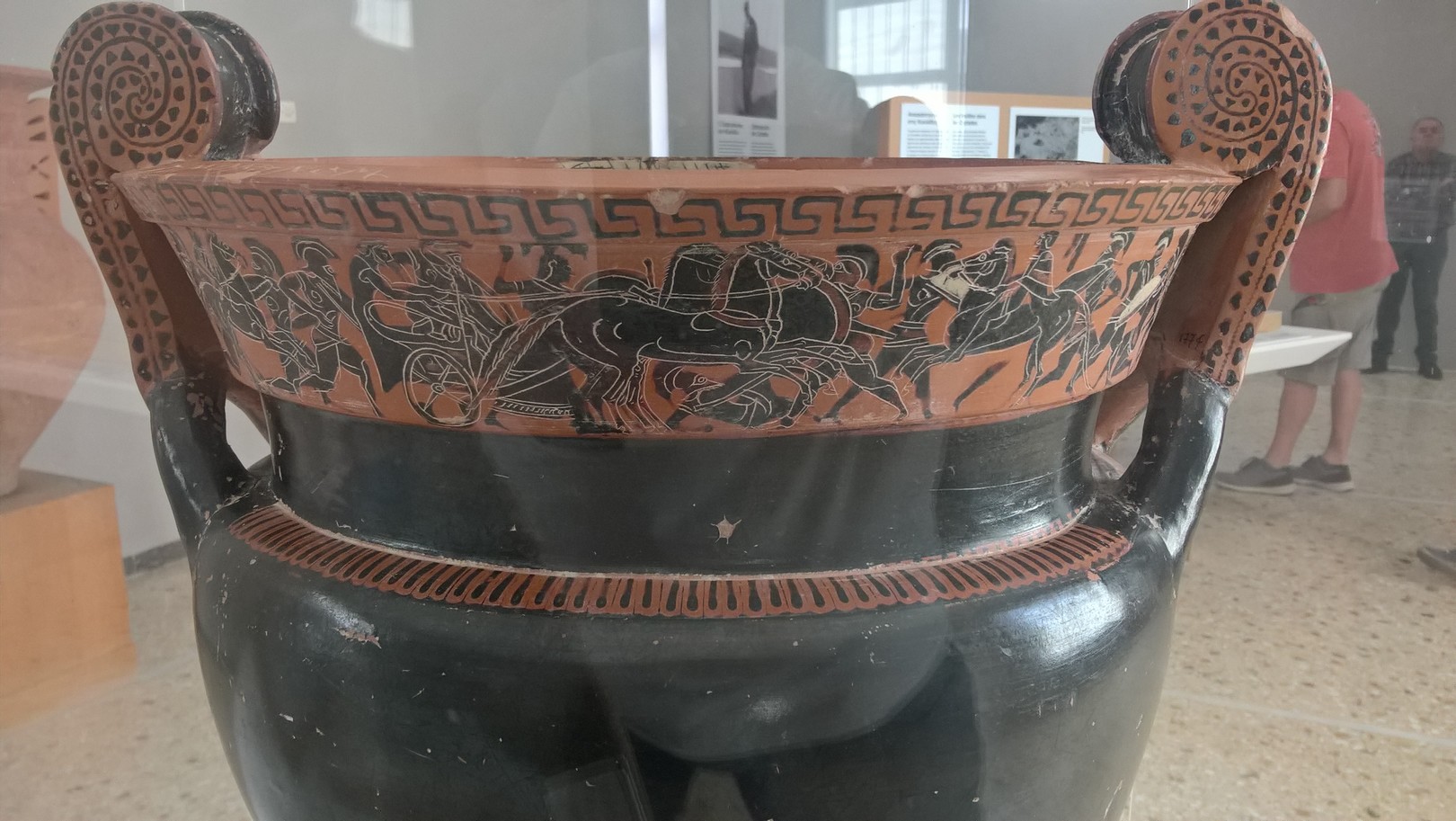 Amphore Cette amphore à anses ouvragées et décor sur la panse provient d'un atelier cycladique. Elle a été découverte en 1956 de manière fortuite dans le secteur nord-est de Sellada à l'occasion de la création de la voie carrossable conduisant à la cité antique de Théra. On y distingue un char antique (quadrige) tiré par des chevaux ailés. Vase avec scène de combat Cratère à volutes avec des figures noires C'est une offrande à Timosthène décédé, comme en témoigne l'inscription (en alphabet de Théra) sur la surface horizontale du bord. Dans la partie décorée du bord, sont représentés à l'intérieur quatre bateaux et à l'extérieur des scènes de combats autour de chars, avec la participation d'Athéna. Le musée préhistorique Figurines en marbre datant de 2800 à 2300 av-JC