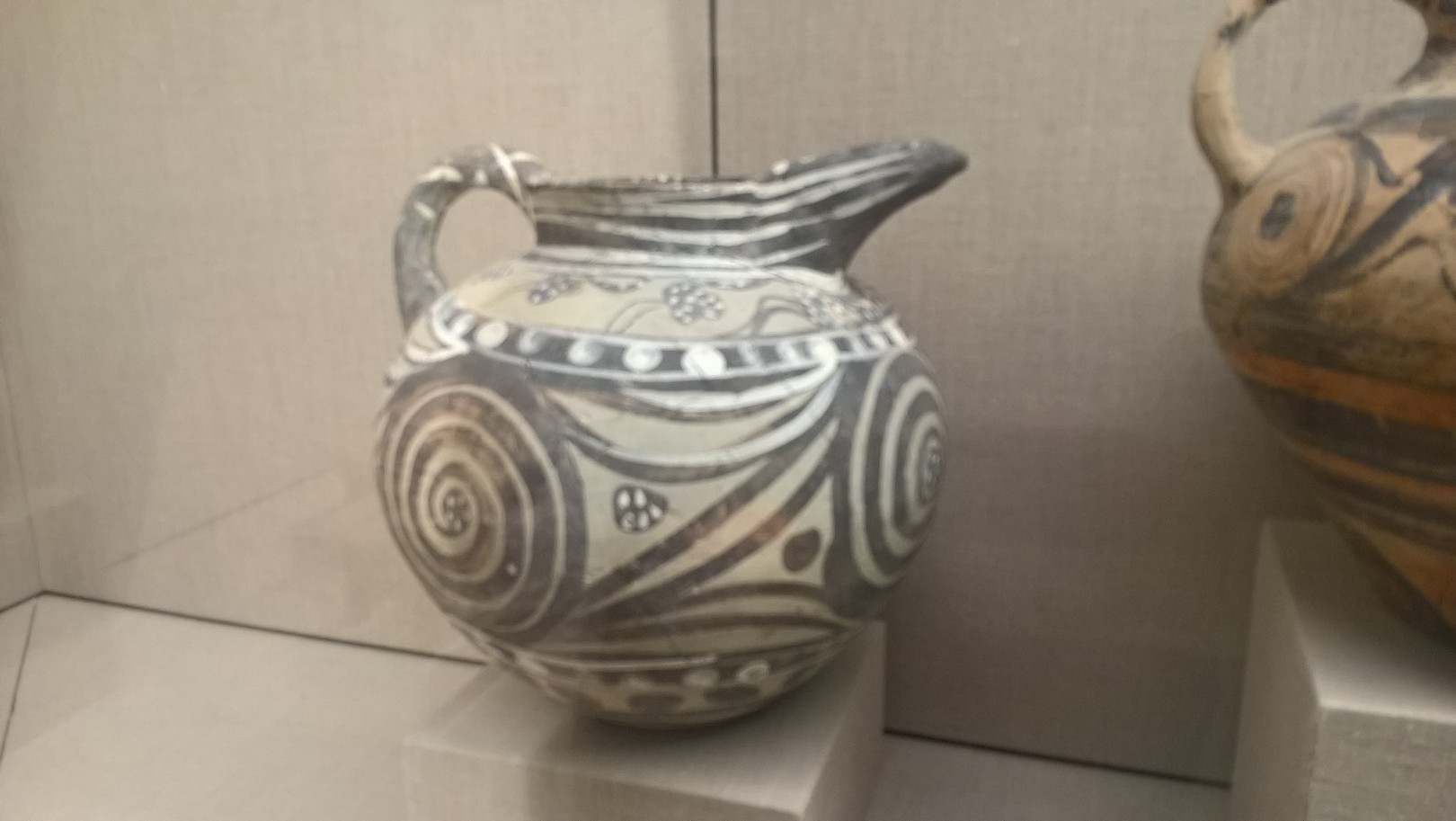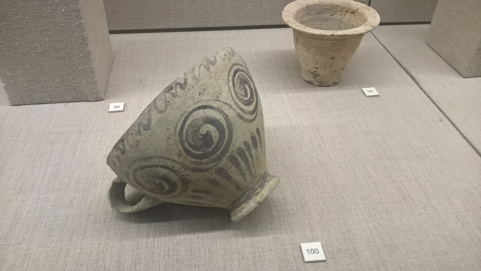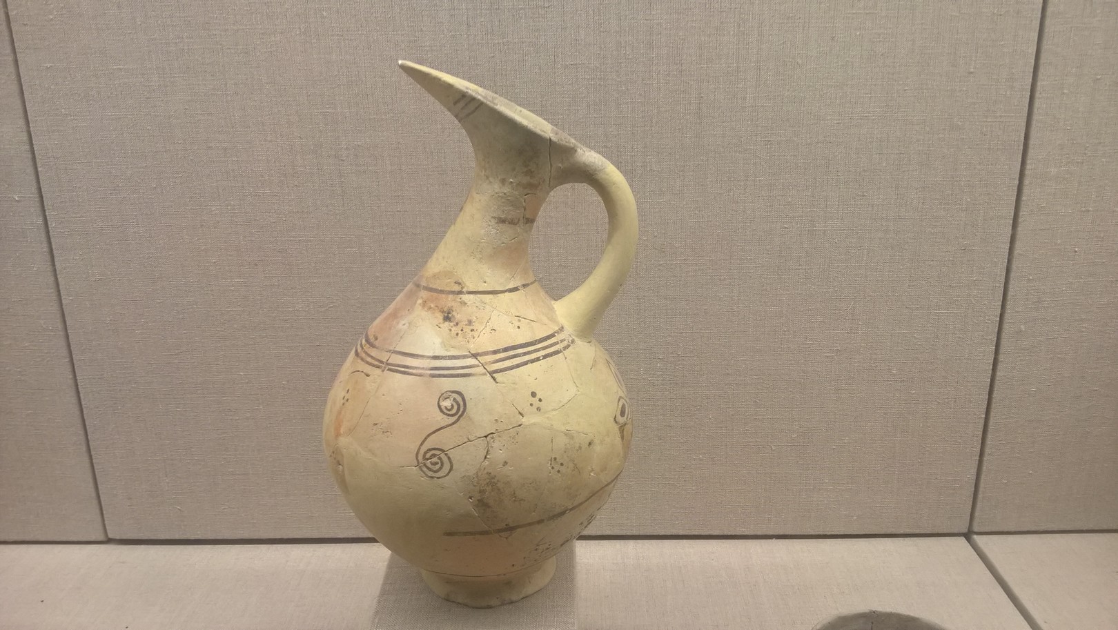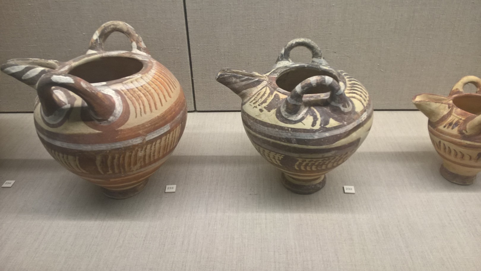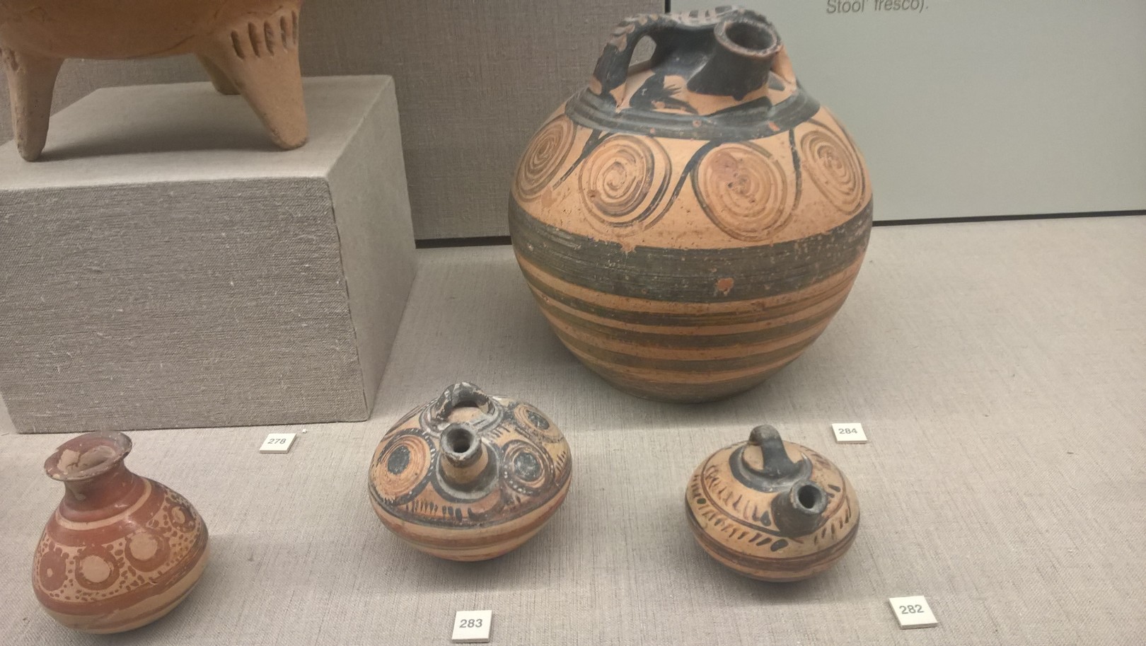 Amphore Cette amphore à anses ouvragées et décor sur la panse provient d'un atelier cycladique. Elle a été découverte en 1956 de manière fortuite dans le secteur nord-est de Sellada à l'occasion de la création de la voie carrossable conduisant à la cité antique de Théra. On y distingue un char antique (quadrige) tiré par des chevaux ailés. Vase avec scène de combat Cratère à volutes avec des figures noires C'est une offrande à Timosthène décédé, comme en témoigne l'inscription (en alphabet de Théra) sur la surface horizontale du bord. Dans la partie décorée du bord, sont représentés à l'intérieur quatre bateaux et à l'extérieur des scènes de combats autour de chars, avec la participation d'Athéna. Le musée préhistorique Figurines en marbre datant de 2800 à 2300 av-JC