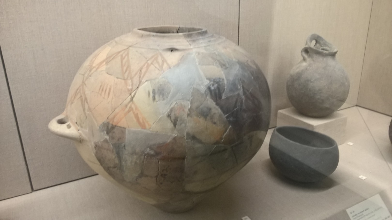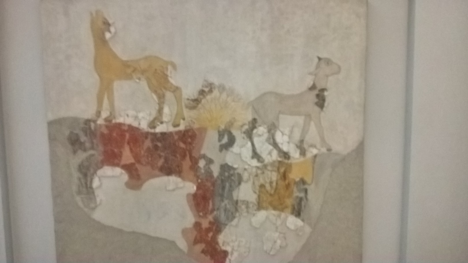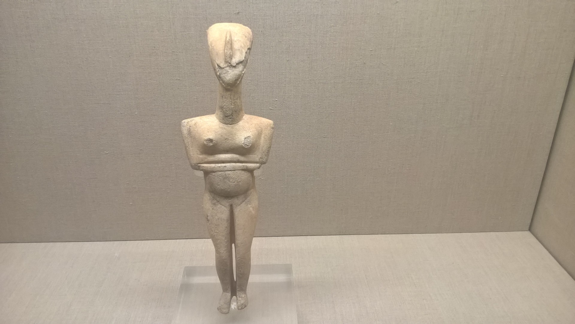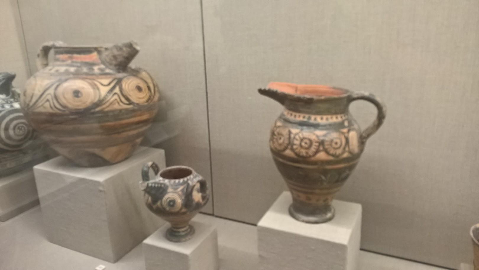 Amphore Cette amphore à anses ouvragées et décor sur la panse provient d'un atelier cycladique. Elle a été découverte en 1956 de manière fortuite dans le secteur nord-est de Sellada à l'occasion de la création de la voie carrossable conduisant à la cité antique de Théra. On y distingue un char antique (quadrige) tiré par des chevaux ailés. Vase avec scène de combat Cratère à volutes avec des figures noires C'est une offrande à Timosthène décédé, comme en témoigne l'inscription (en alphabet de Théra) sur la surface horizontale du bord. Dans la partie décorée du bord, sont représentés à l'intérieur quatre bateaux et à l'extérieur des scènes de combats autour de chars, avec la participation d'Athéna. Le musée préhistorique Figurines en marbre datant de 2800 à 2300 av-JC