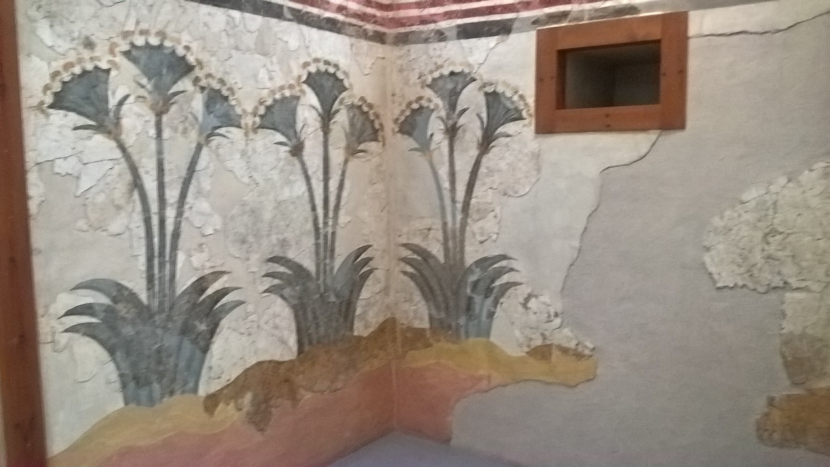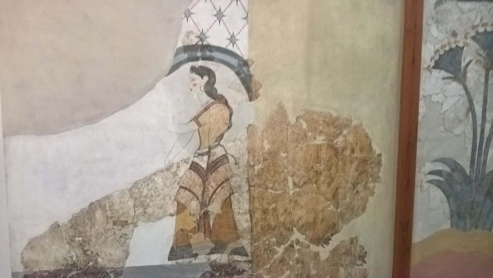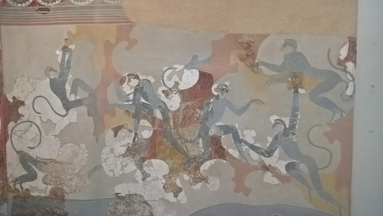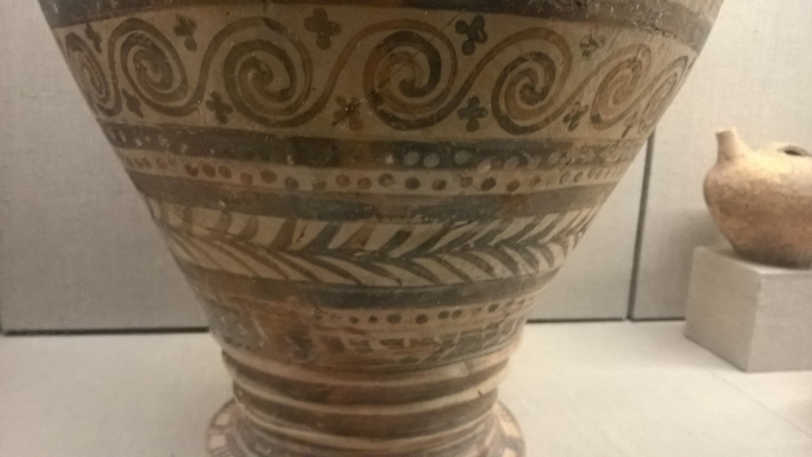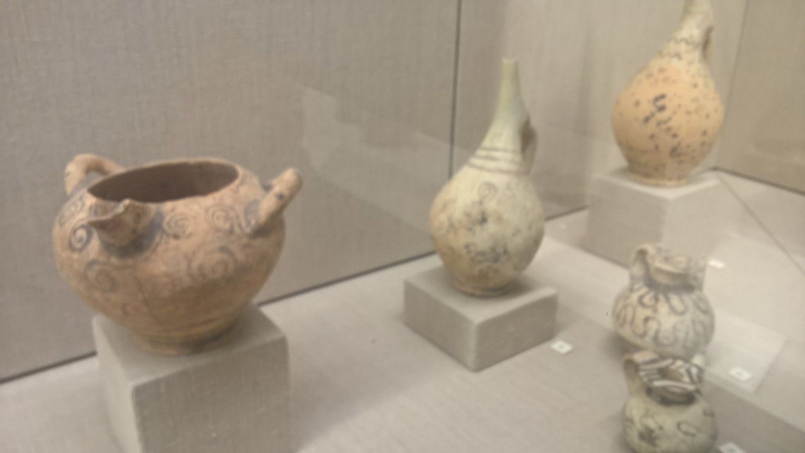 Amphore Cette amphore à anses ouvragées et décor sur la panse provient d'un atelier cycladique. Elle a été découverte en 1956 de manière fortuite dans le secteur nord-est de Sellada à l'occasion de la création de la voie carrossable conduisant à la cité antique de Théra. On y distingue un char antique (quadrige) tiré par des chevaux ailés. Vase avec scène de combat Cratère à volutes avec des figures noires C'est une offrande à Timosthène décédé, comme en témoigne l'inscription (en alphabet de Théra) sur la surface horizontale du bord. Dans la partie décorée du bord, sont représentés à l'intérieur quatre bateaux et à l'extérieur des scènes de combats autour de chars, avec la participation d'Athéna. Le musée préhistorique Figurines en marbre datant de 2800 à 2300 av-JC