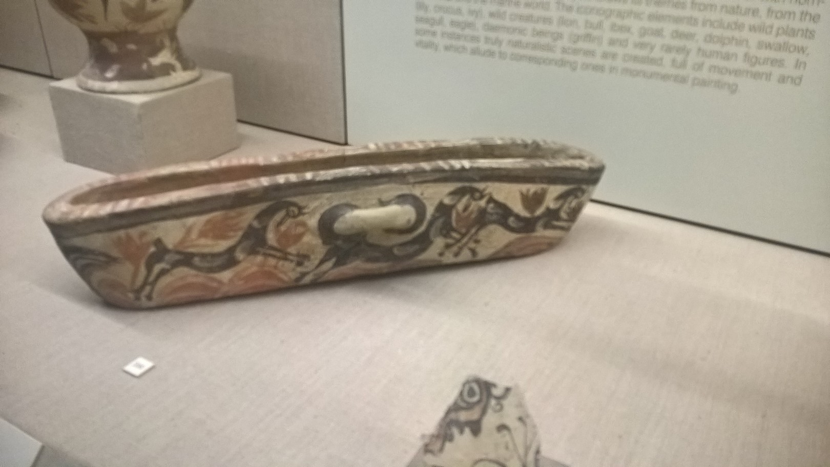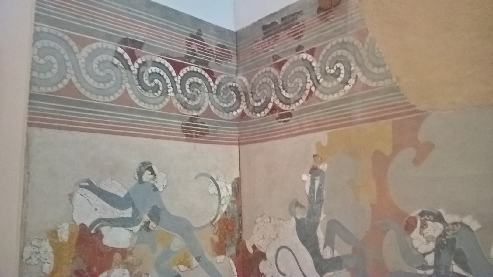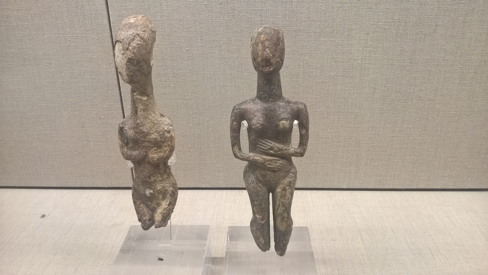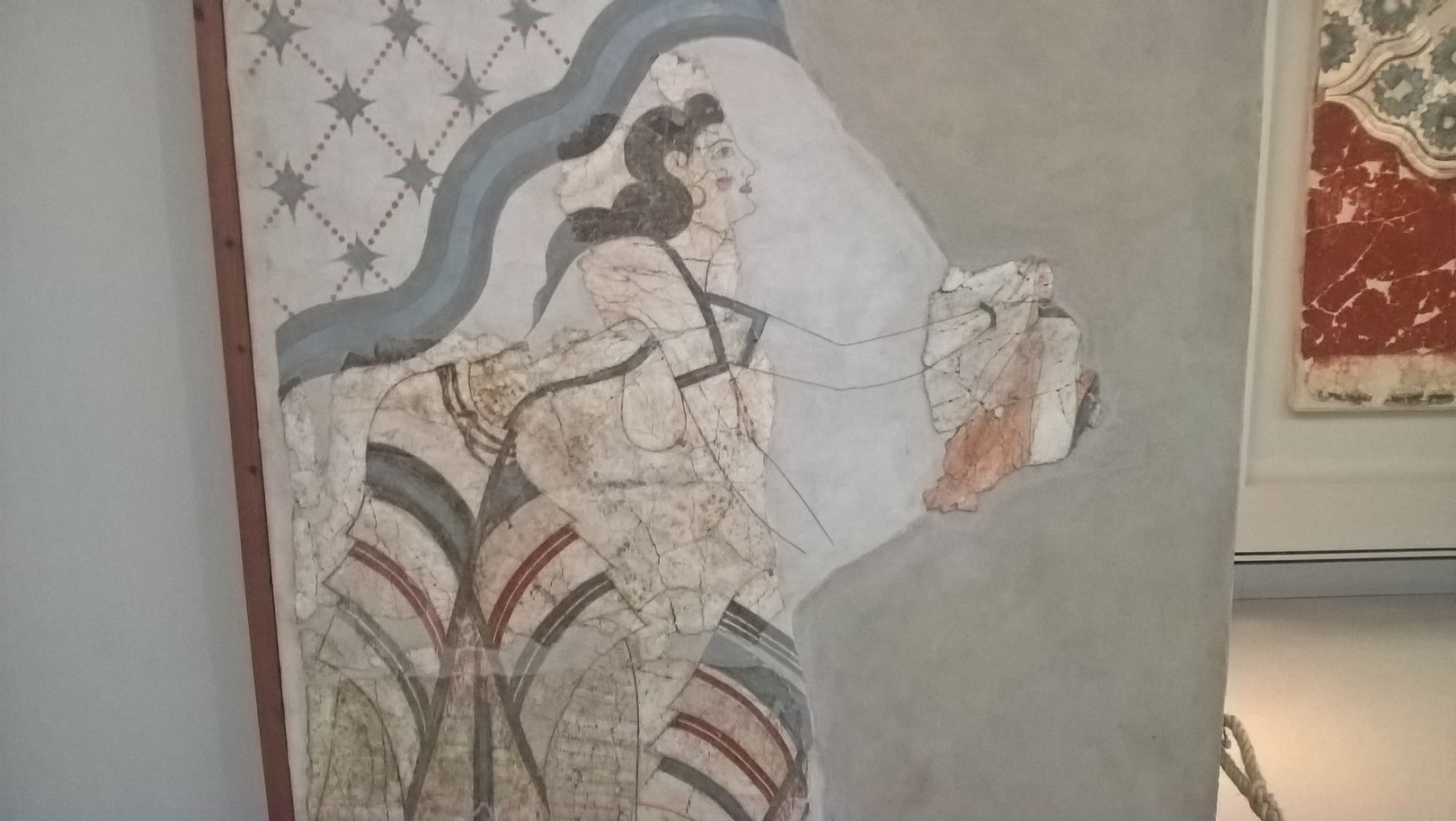 Amphore Cette amphore à anses ouvragées et décor sur la panse provient d'un atelier cycladique. Elle a été découverte en 1956 de manière fortuite dans le secteur nord-est de Sellada à l'occasion de la création de la voie carrossable conduisant à la cité antique de Théra. On y distingue un char antique (quadrige) tiré par des chevaux ailés. Vase avec scène de combat Cratère à volutes avec des figures noires C'est une offrande à Timosthène décédé, comme en témoigne l'inscription (en alphabet de Théra) sur la surface horizontale du bord. Dans la partie décorée du bord, sont représentés à l'intérieur quatre bateaux et à l'extérieur des scènes de combats autour de chars, avec la participation d'Athéna. Le musée préhistorique Figurines en marbre datant de 2800 à 2300 av-JC