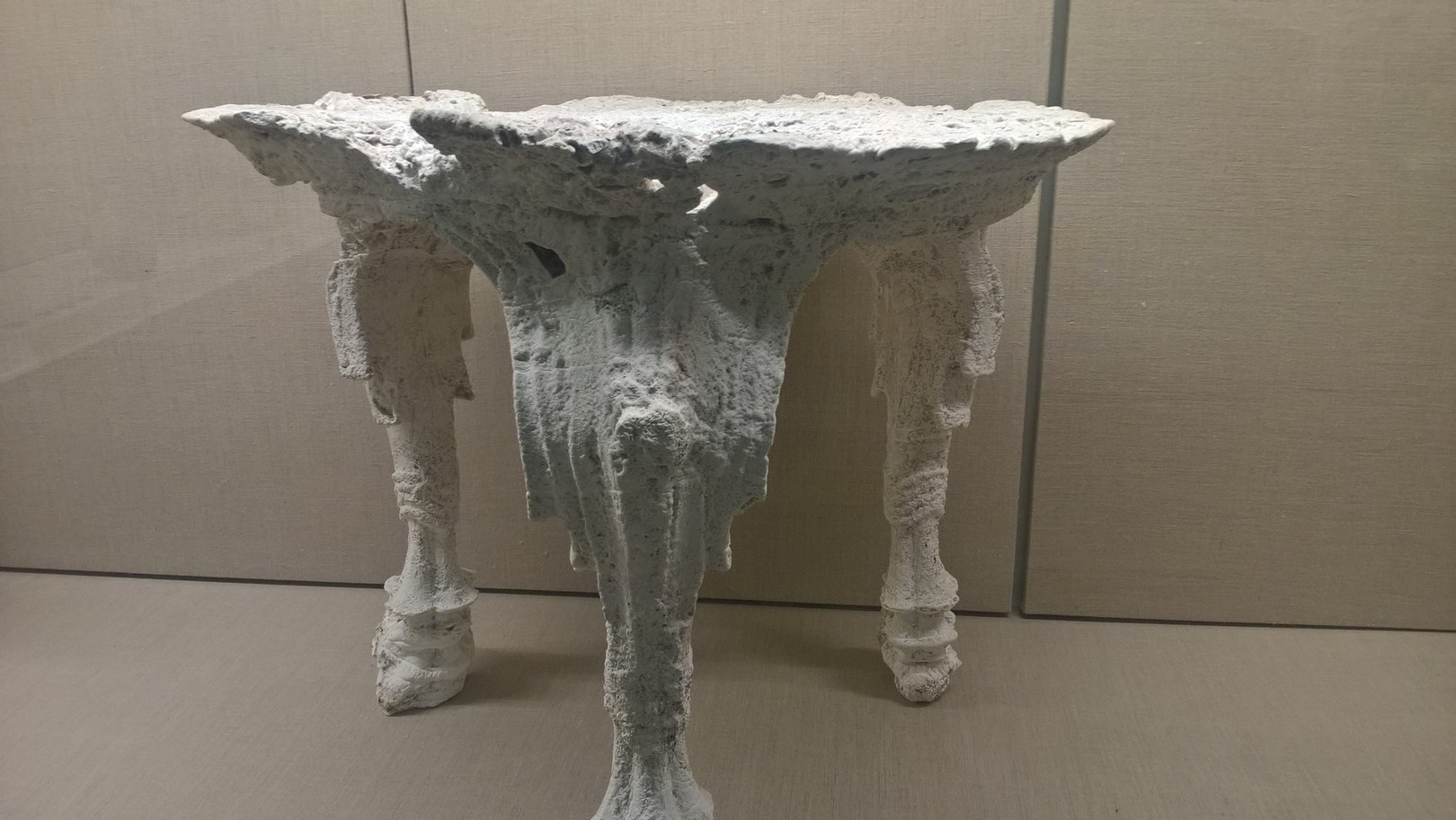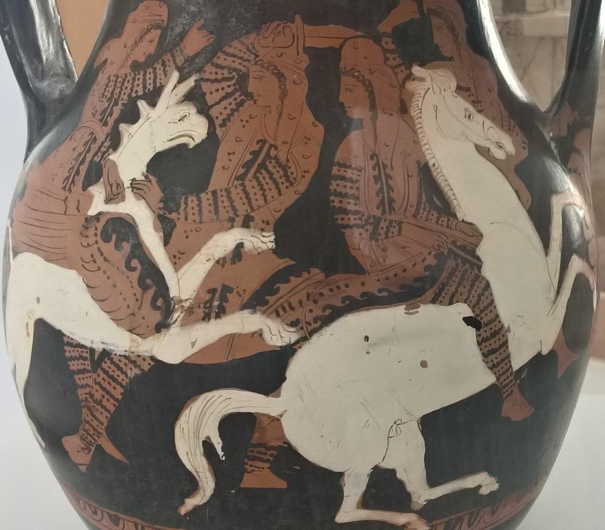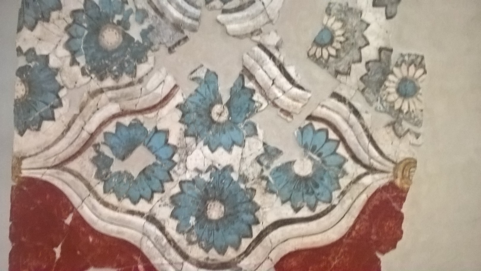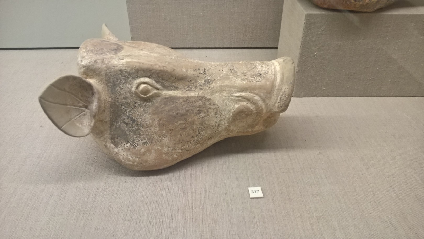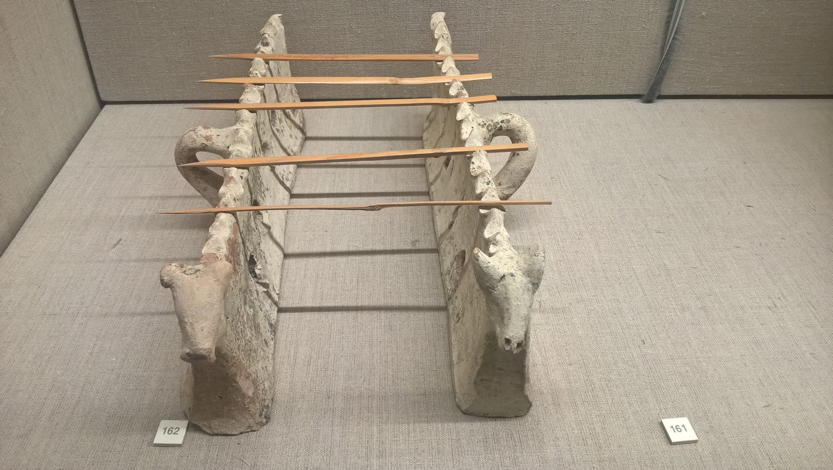 Amphore Cette amphore à anses ouvragées et décor sur la panse provient d'un atelier cycladique. Elle a été découverte en 1956 de manière fortuite dans le secteur nord-est de Sellada à l'occasion de la création de la voie carrossable conduisant à la cité antique de Théra. On y distingue un char antique (quadrige) tiré par des chevaux ailés. Vase avec scène de combat Cratère à volutes avec des figures noires C'est une offrande à Timosthène décédé, comme en témoigne l'inscription (en alphabet de Théra) sur la surface horizontale du bord. Dans la partie décorée du bord, sont représentés à l'intérieur quatre bateaux et à l'extérieur des scènes de combats autour de chars, avec la participation d'Athéna. Le musée préhistorique Figurines en marbre datant de 2800 à 2300 av-JC