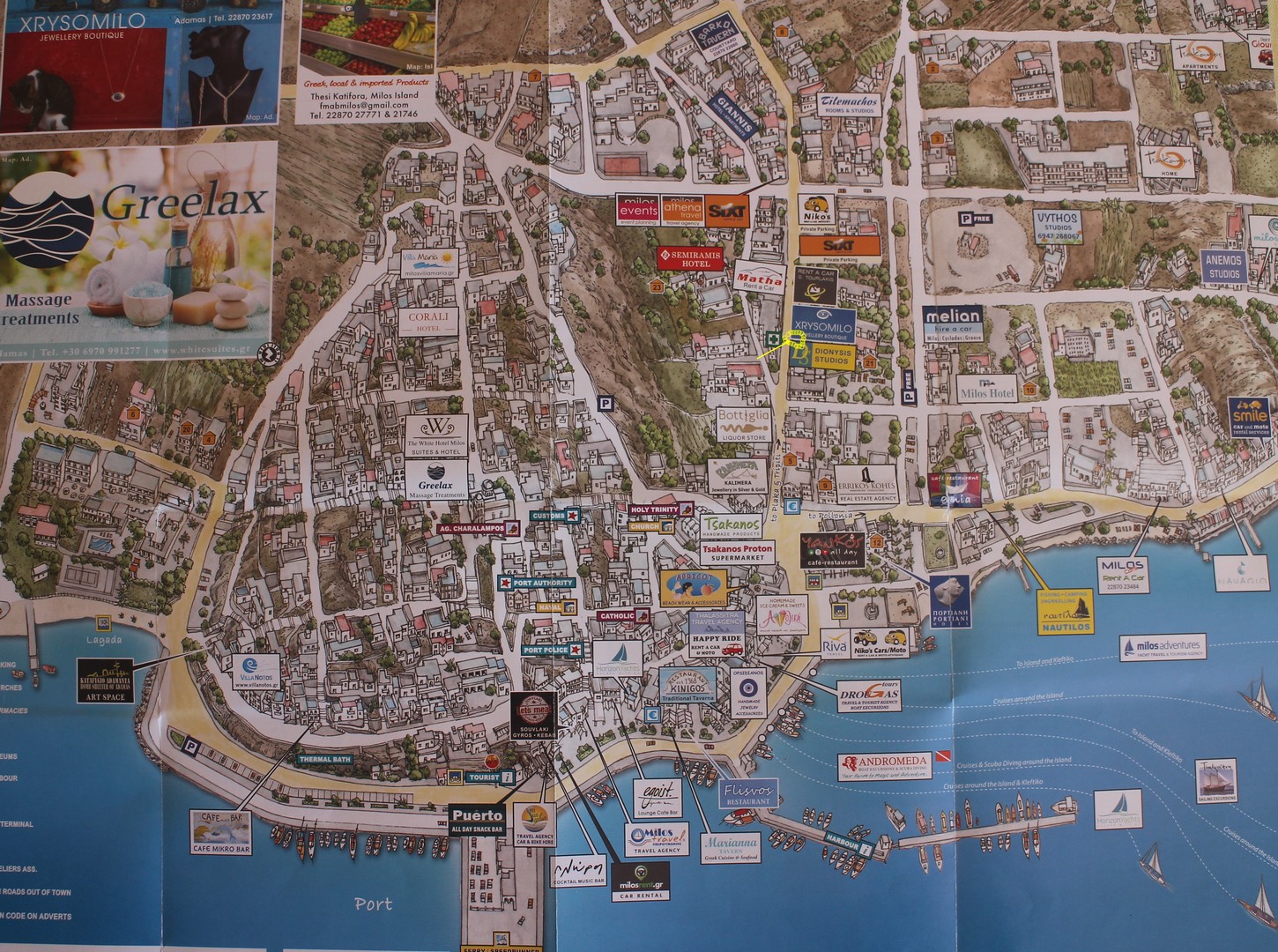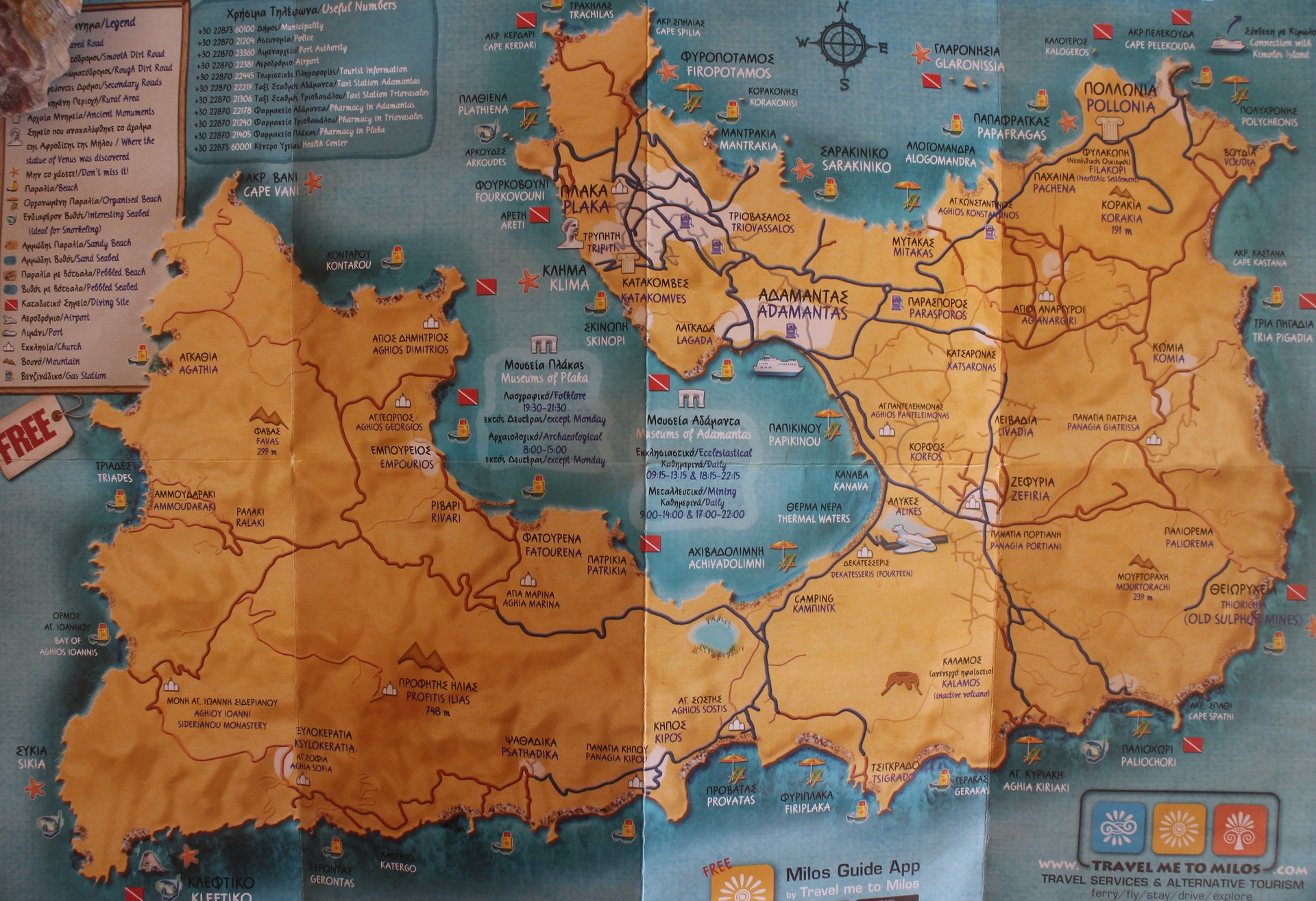 Milos est une île volcanique comme Santorin. Son port, Adamas (Adamantas), est l’un des plus grands ports naturels de la Méditerranée. Plaka est la ville administrative (« capitale ») de l’île. Milos est d’une beauté incomparable. Beaucoup de plages et de criques magnifiques. Avec ses incroyables formations rocheuses et ses villages perchés sur des falaises colorées, Milos est l’île la plus étonnante des Cyclades Elle prospéra sous les Minoens et les Mycéniens grâce au commerce d’obsidienne avant d’être colonisée par les Athéniens au IVe siècle avant J.C. Elle fut revendiquée par les Ottomans en 1580. Aujourd’hui, malgré le tourisme, les ressources minières sont sa principale richesse. |