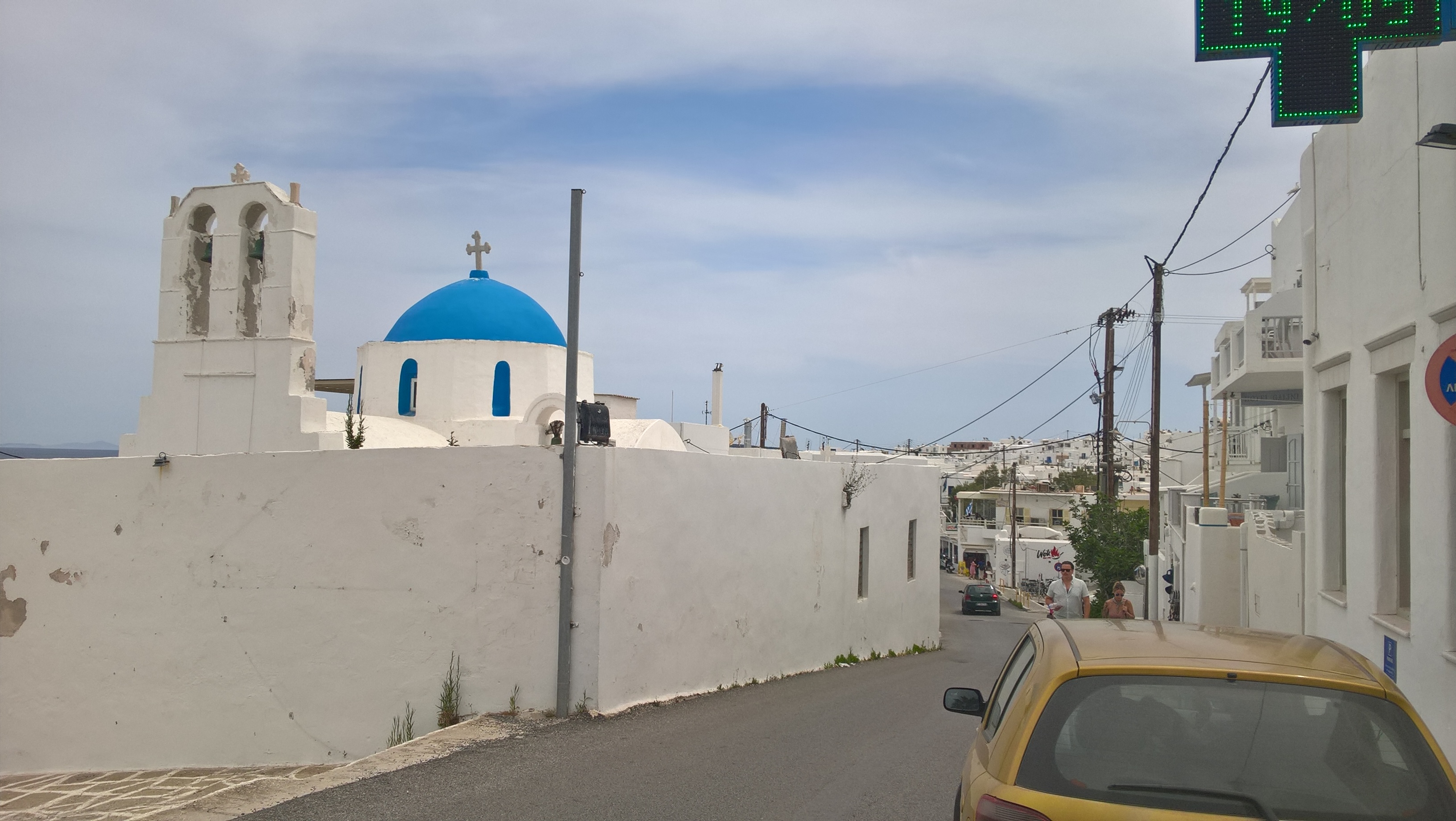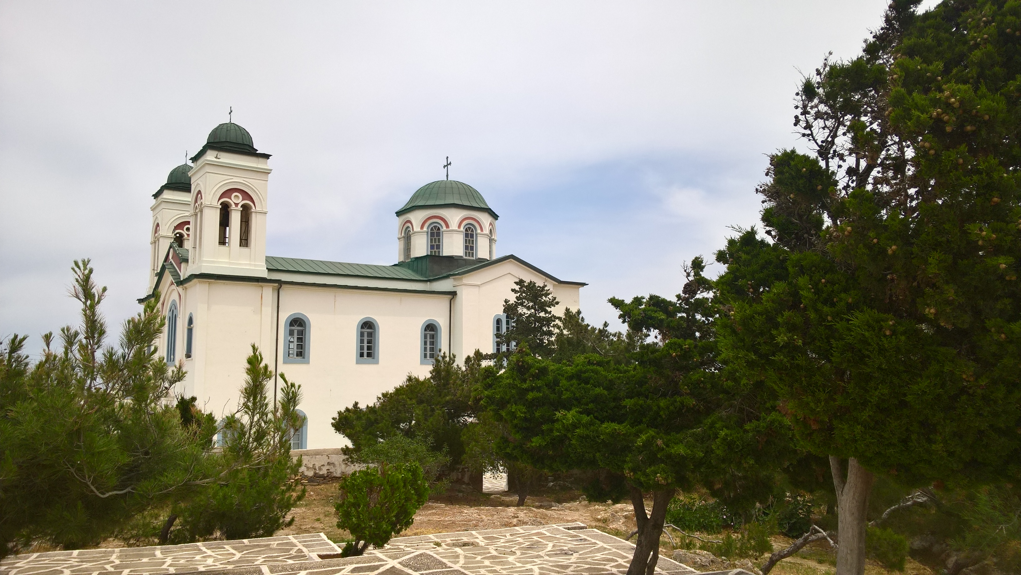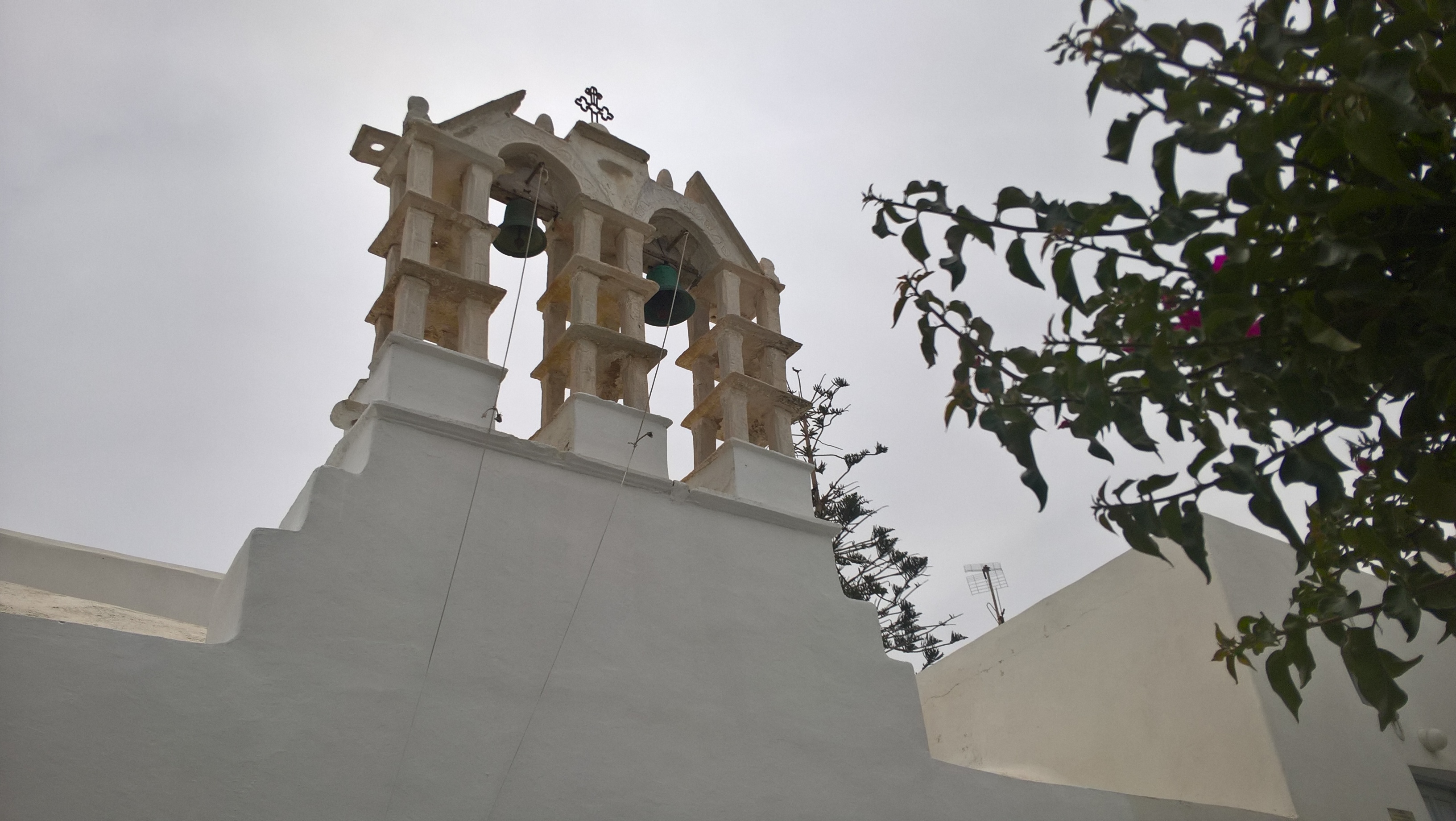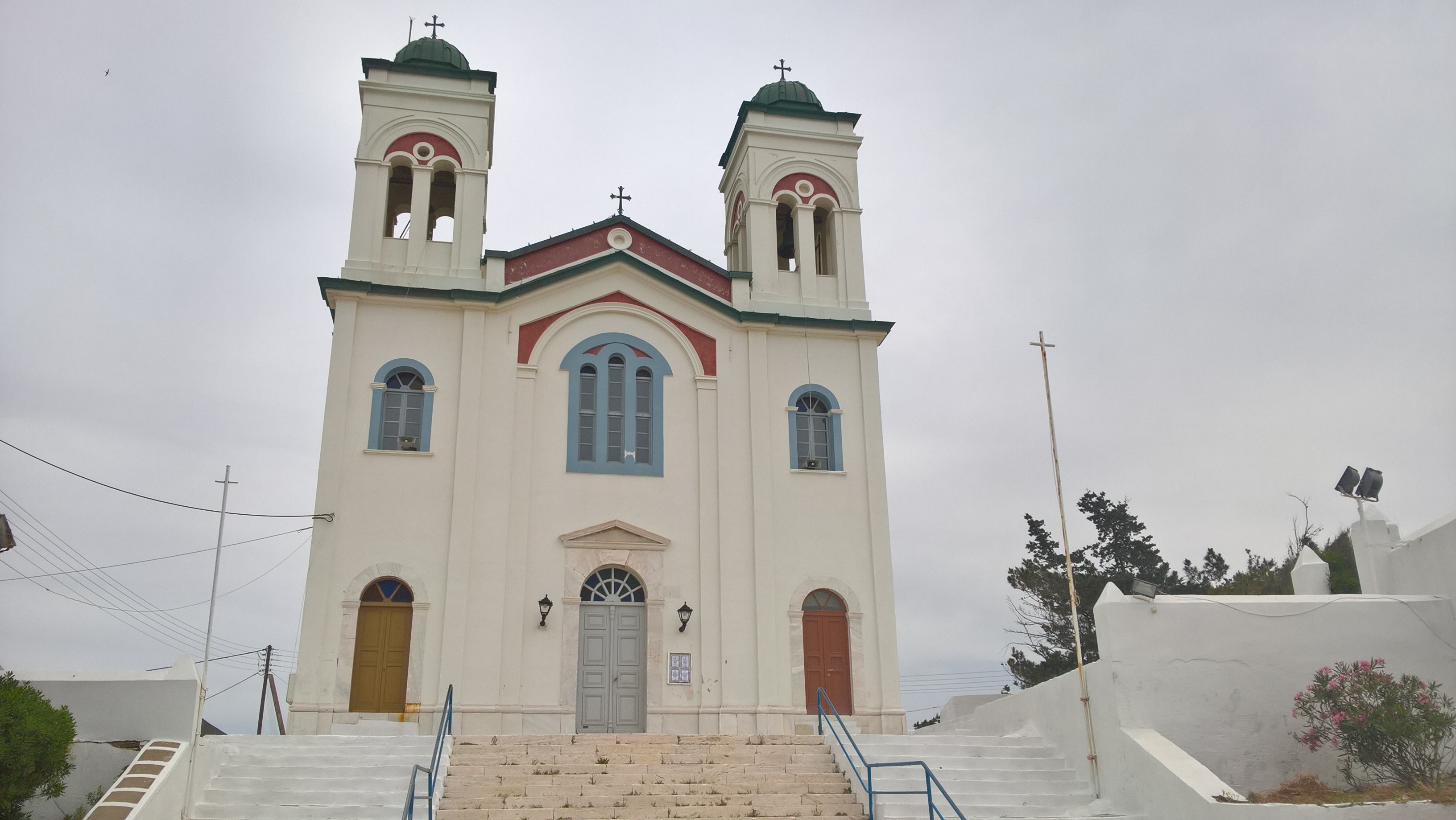 La Sainte Église de la Dormition de la Vierge de Naoussa Il s’agit, en ordre de rang, de la troisième plus grande église de Paros. C’est l’église métropolite de Naousa. Bâtie sur une hauteur dominant la petite ville et offrant une jolie vue, elle se distingue par ses deux grands clochers intégrés et son fronton au-dessus du portail central. C’est une basilique à nef unique, avec une coupole couverte de tuiles et un petit narthex qui fut construit au XIXème siècle, là où préexistait une église plus ancienne. Elle possède une grande cour plantée de pins et seize marches de marbre mènent vers le portail central. On peut voir à l'intérieur l’iconostase en marbre ciselé, œuvre de Dimitrios Lyritis, sculpteur sur marbre originaire de l’île de Tinos, et les icônes revêtues d’argent de la Sainte-Vierge et de la Dormition de la Vierge.