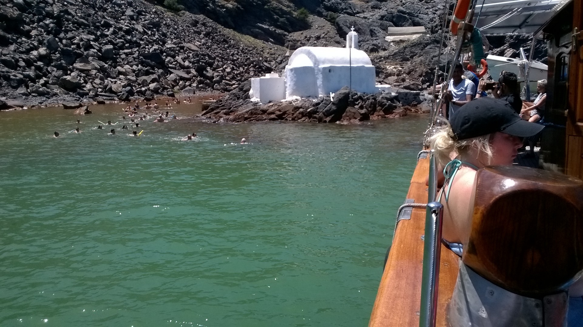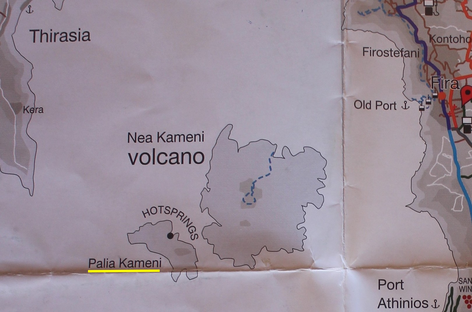 Palia Kameni est une toute petite île, à côté de Vulcanos, connue pour ses bains d'eau chaude. La température de l’eau varie entre 30 et 35 degrés Celsius. L’eau est un peu rougeâtre et sent aussi le souffre. |
