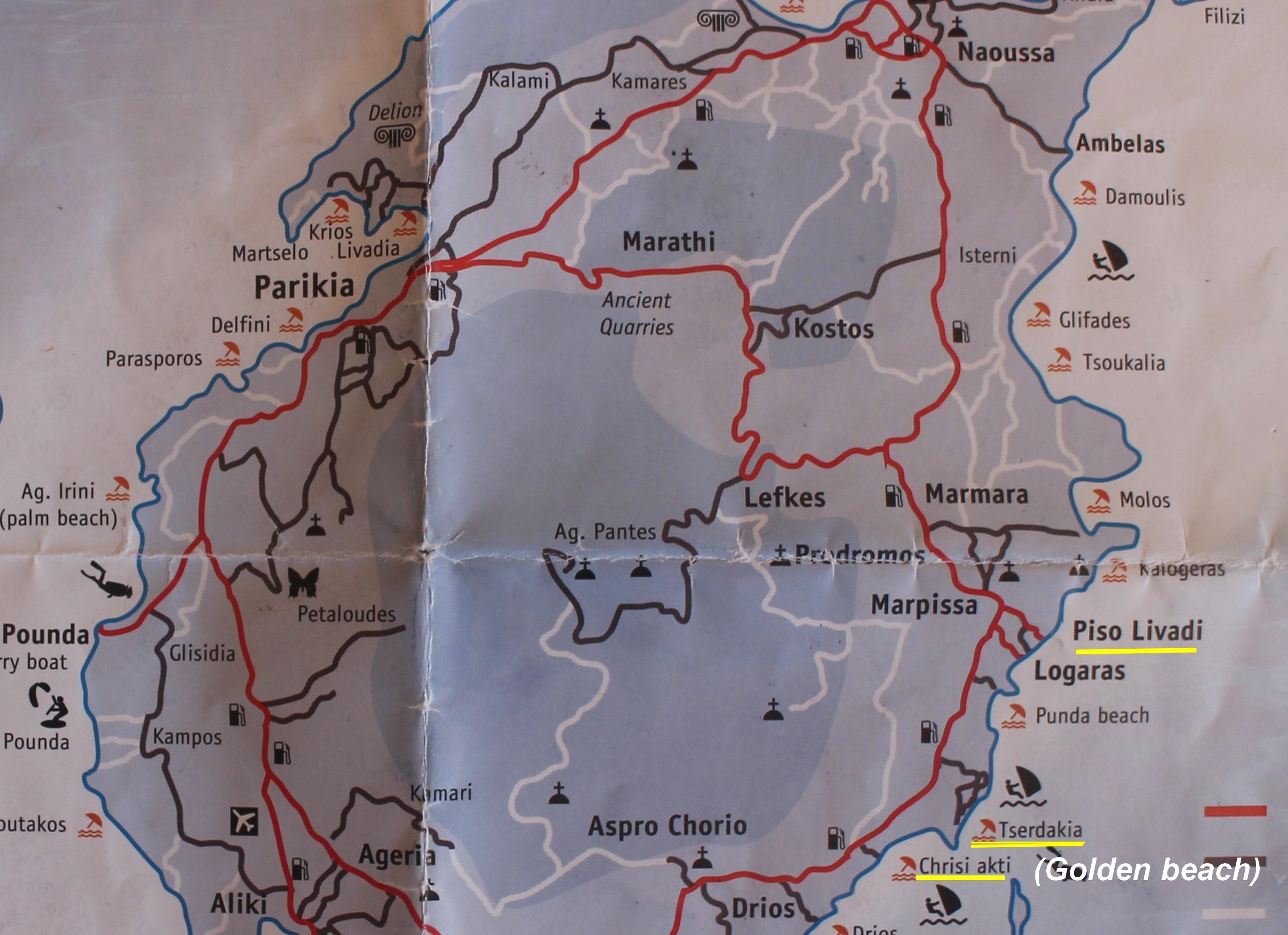 La route des plages du Sud-Est : - Piso Livadi - Logaras - Punda beach - Tserdakia - Chrisi akti (Golden beach) Piso Livadi Piso Livadi mélange plage , petit port et restaurant dans une ambiance calme et décontractée loin des villes majeures qui brassent un peu plus de touristes. En plein centre de la ville, belle petite plage de sable bordée de pins.