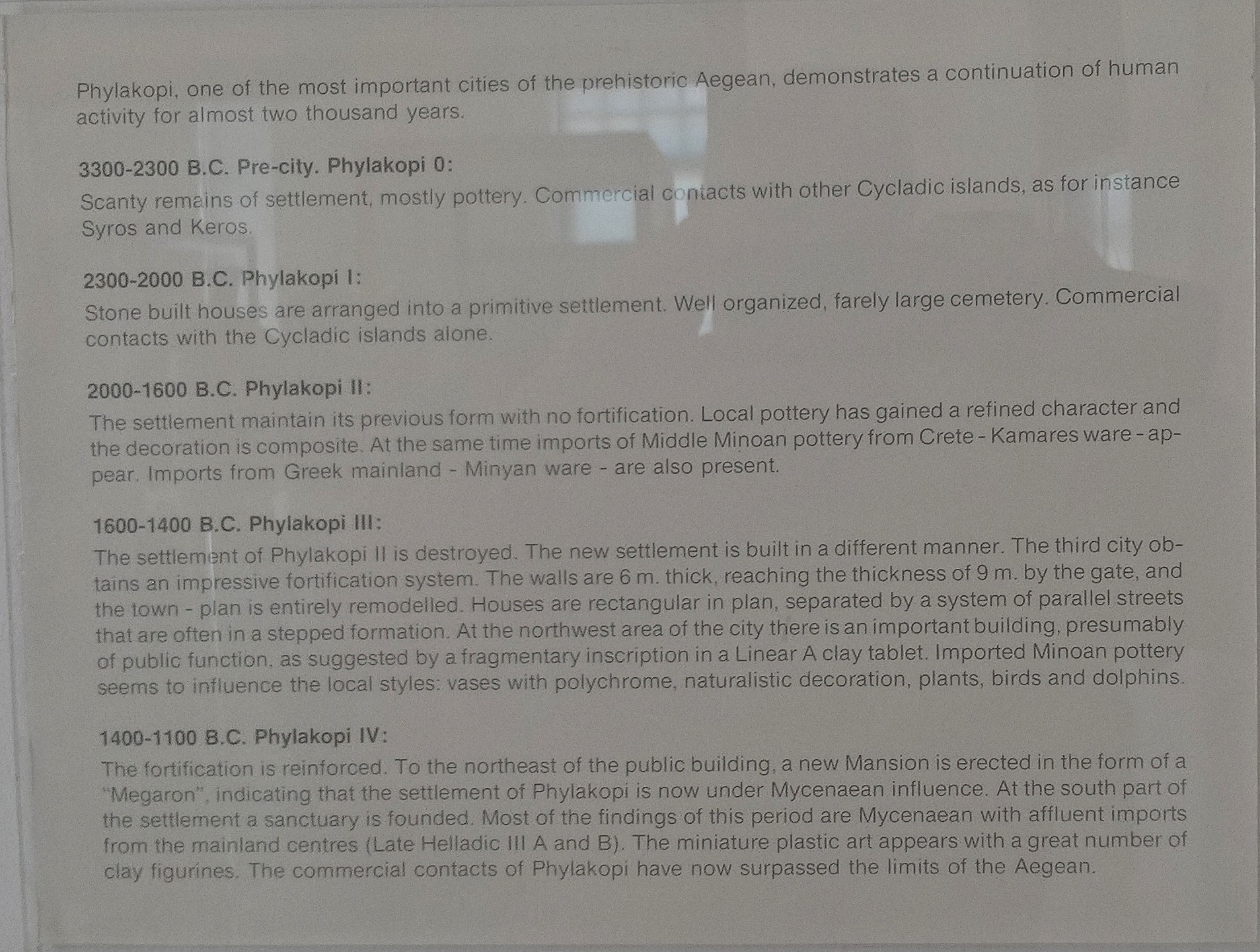 L'intérieur du muséePhylakopi est un site archéologique de l'île de Milos, dans l'archipel des Cyclades. Il est l'un des plus importants du monde égéen pour la période du Bronze ancien (civilisation des Cyclades).
