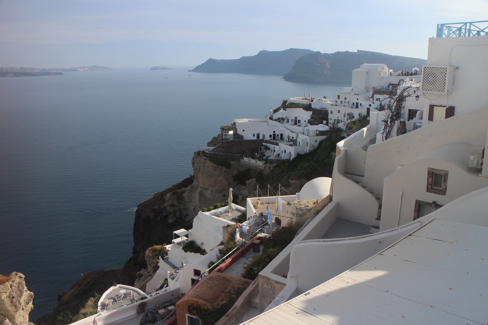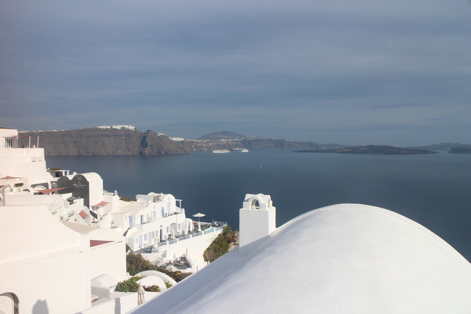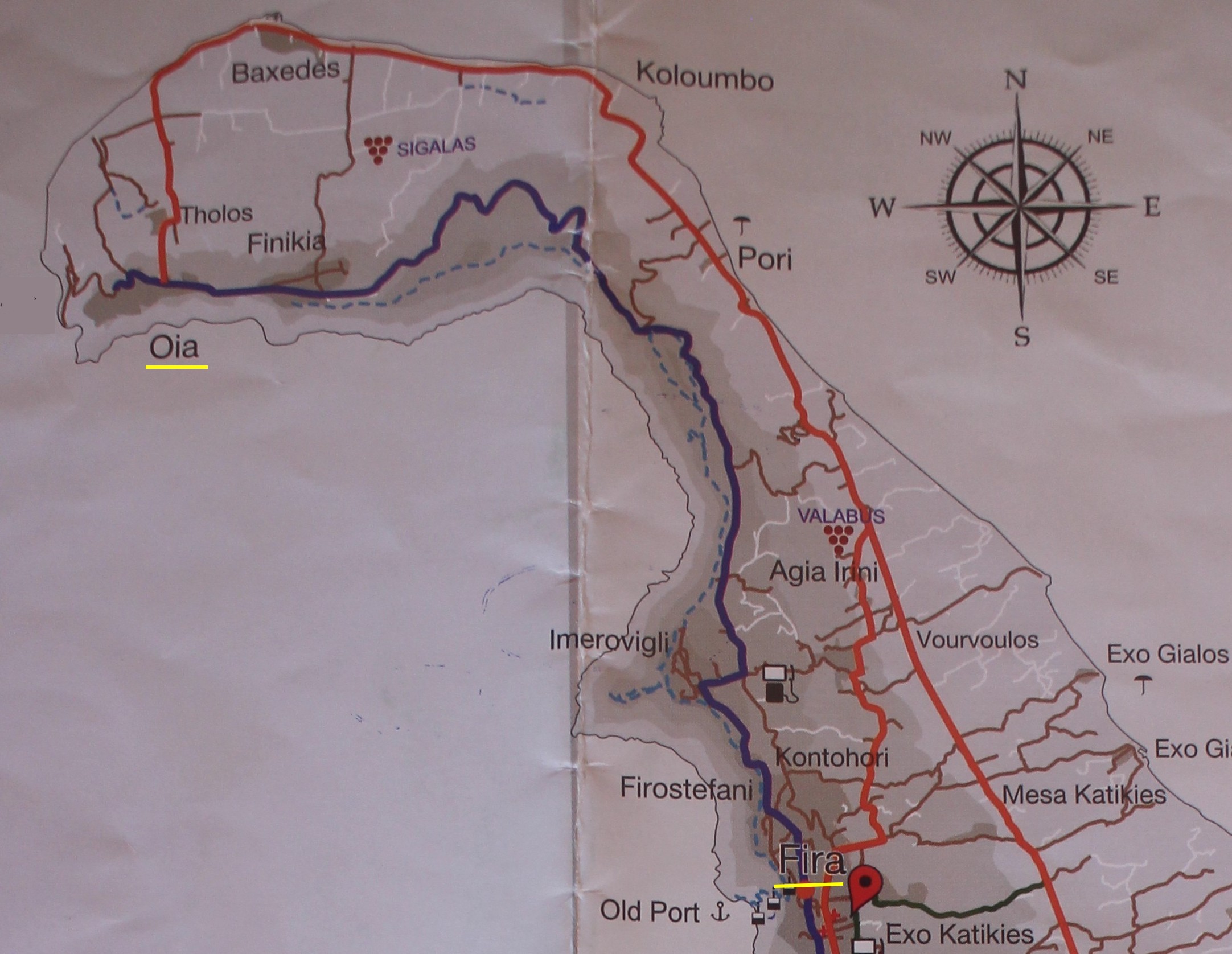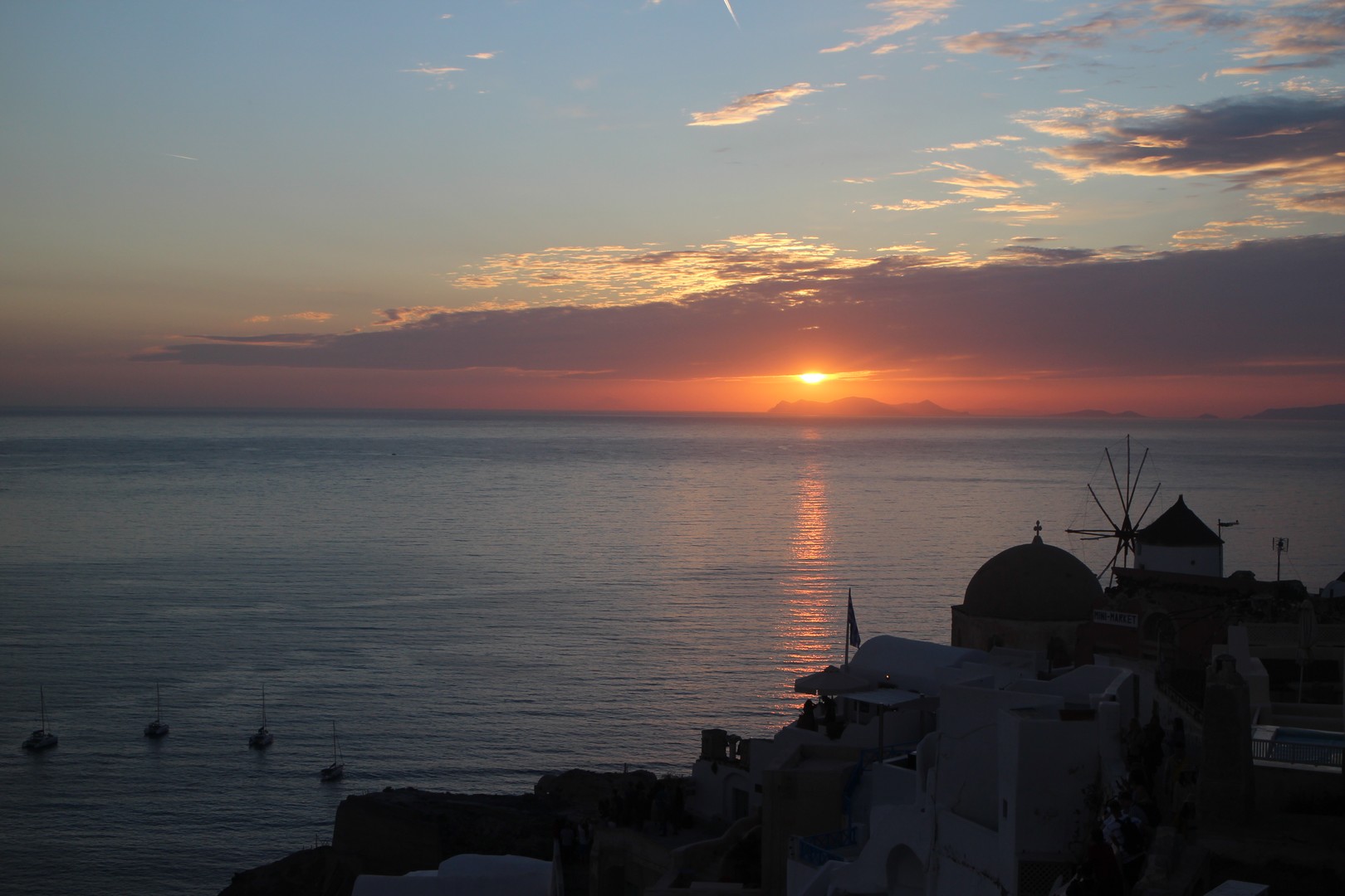 Oia est une petite ville au nord de l'île de Santorin réputée pour ses belles maisons blanches agglutinées à flanc de falaise et surplombant la mer Égée et pour son coucher de soleil au-dessus de l'eau. |