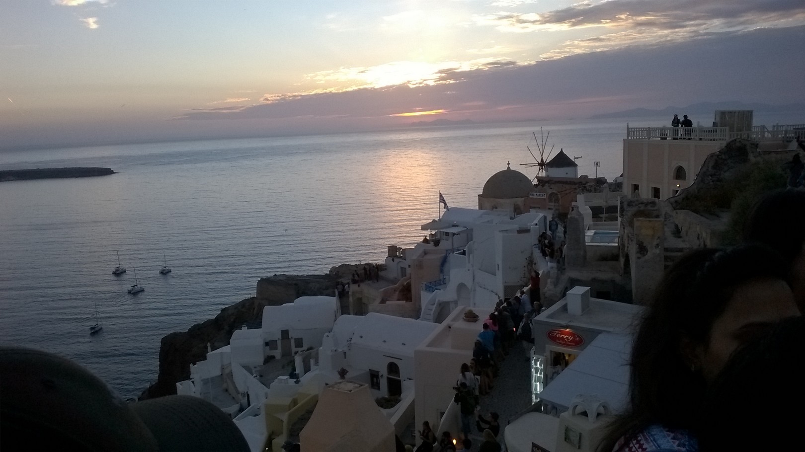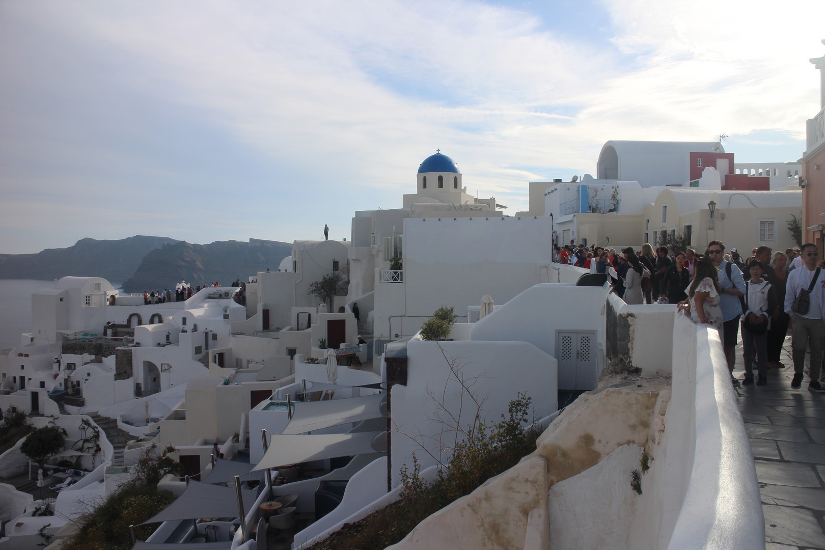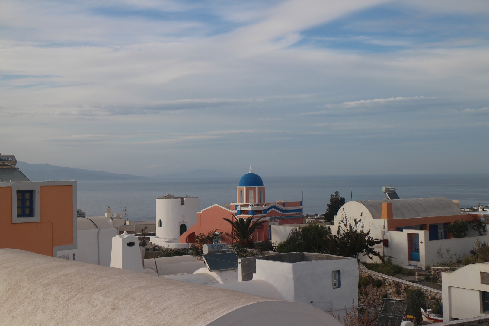 Oia est une petite ville au nord de l'île de Santorin réputée pour ses belles maisons blanches agglutinées à flanc de falaise et surplombant la mer Égée et pour son coucher de soleil au-dessus de l'eau. |