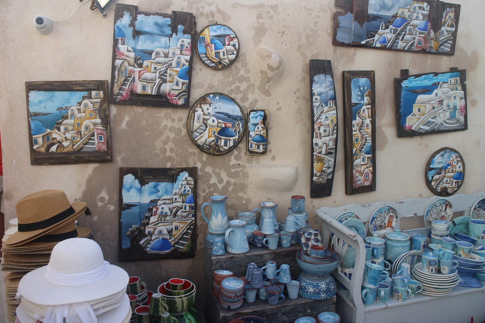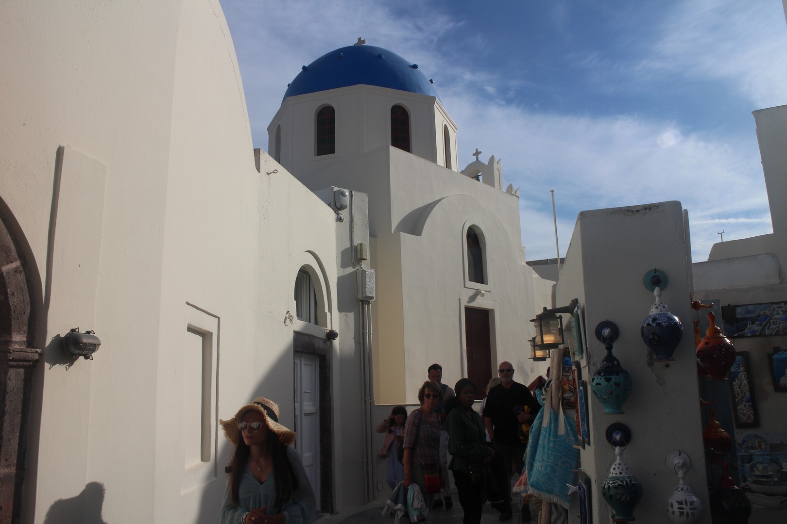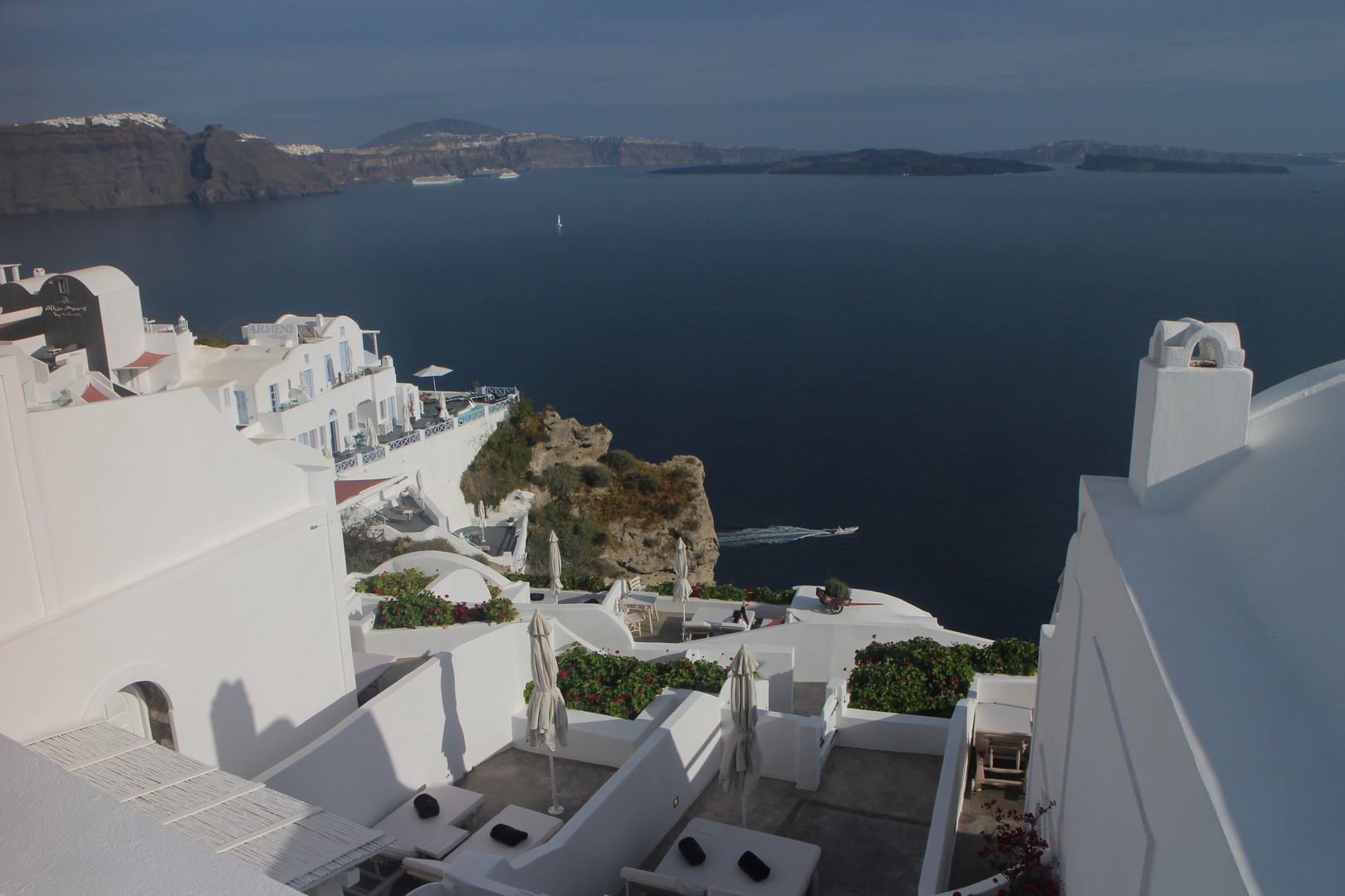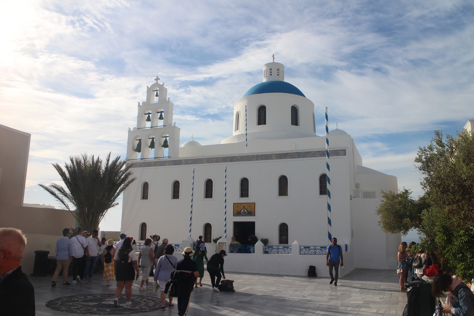 Oia est une petite ville au nord de l'île de Santorin réputée pour ses belles maisons blanches agglutinées à flanc de falaise et surplombant la mer Égée et pour son coucher de soleil au-dessus de l'eau. |