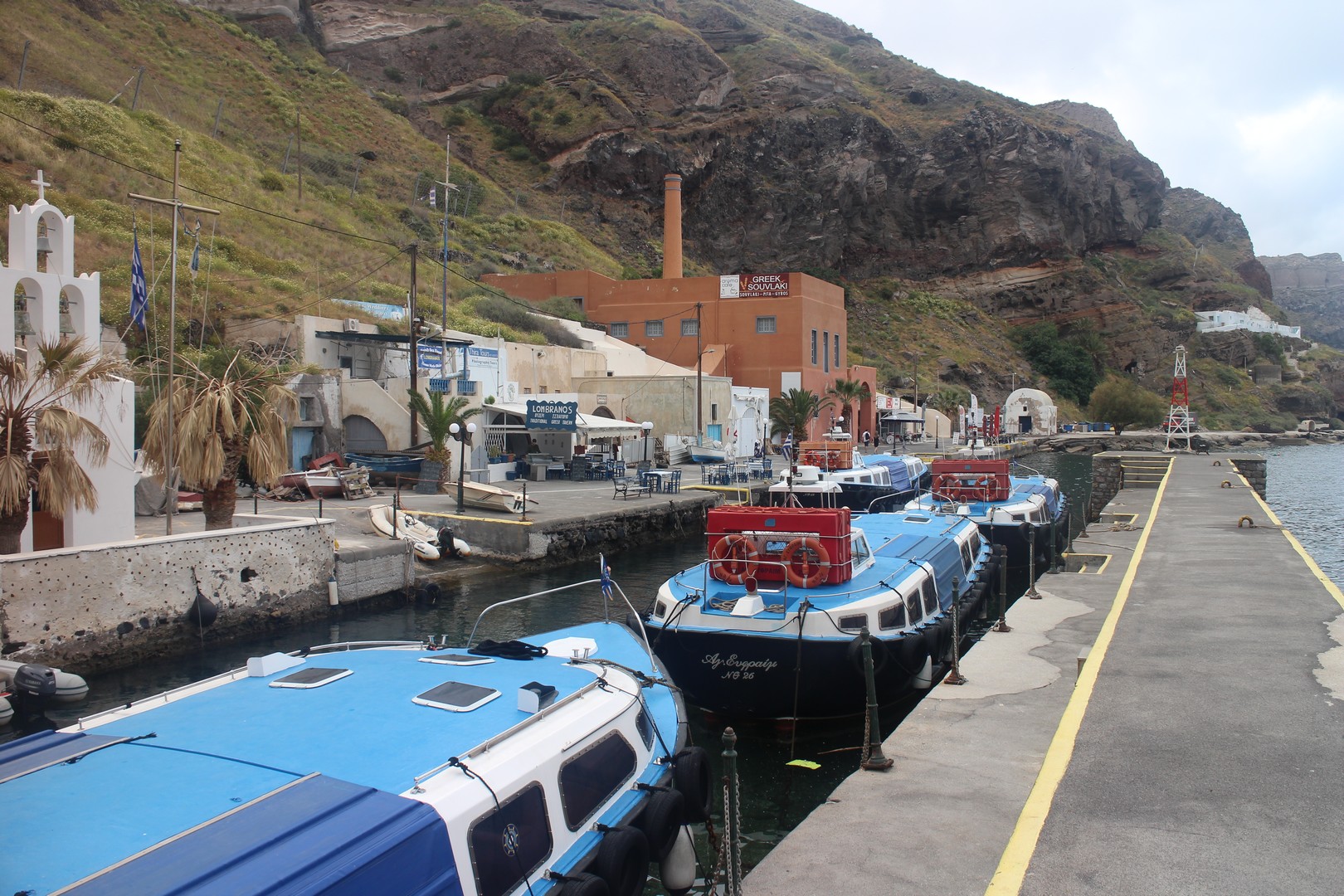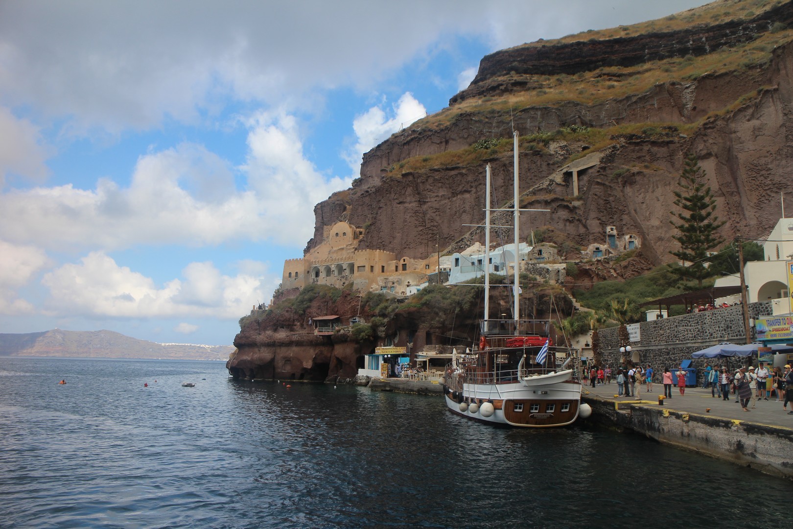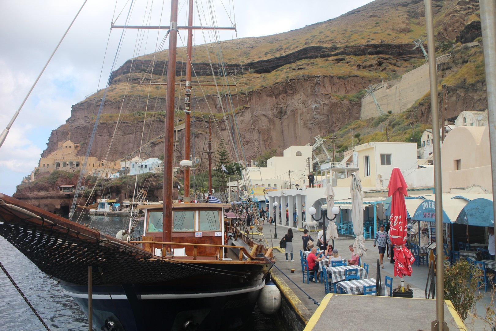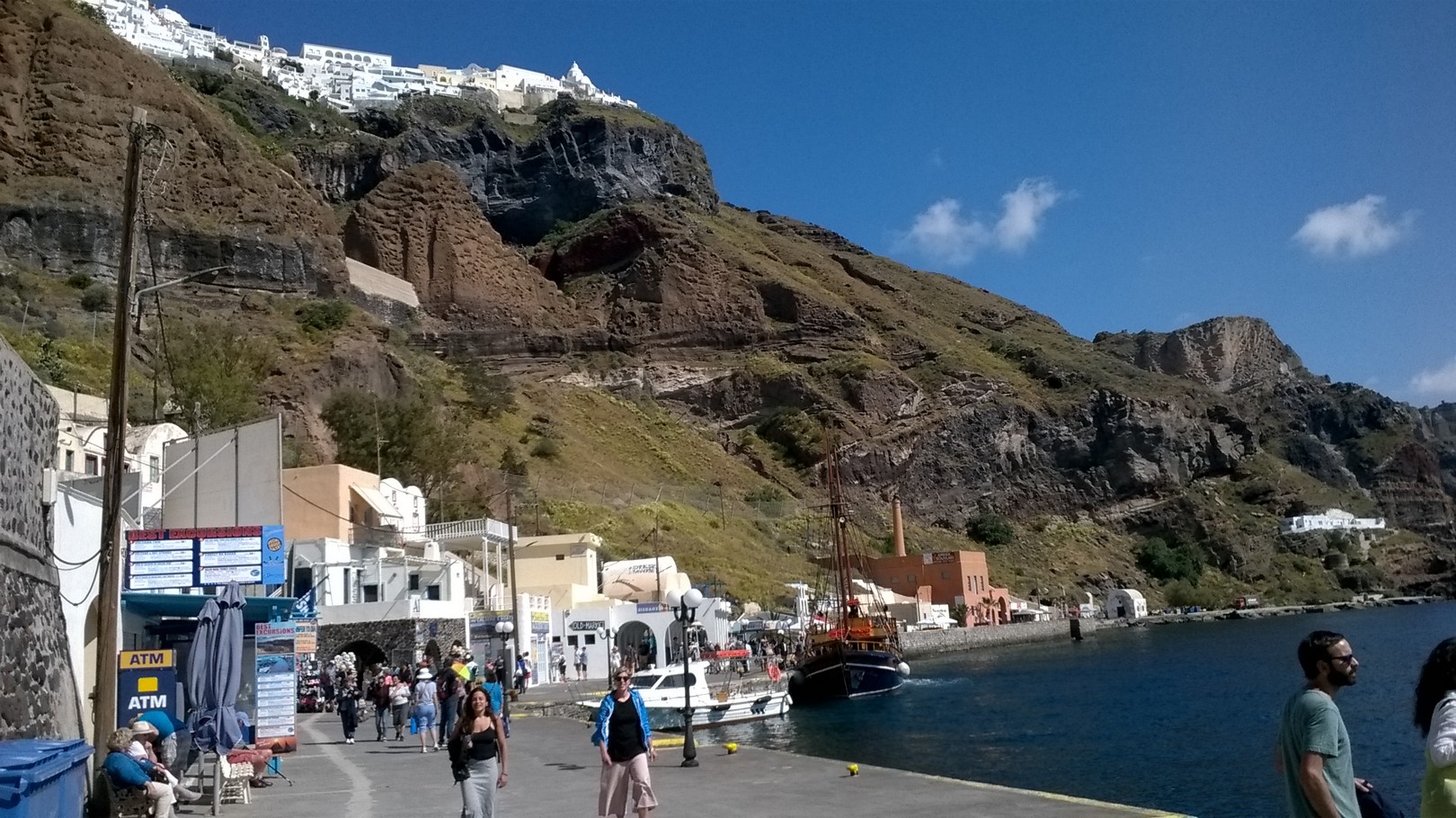Le vieux port est isolé de la ville de Fira par la falaise. On s'y rend soit par un chemin muletier soit par téléphérique. |
