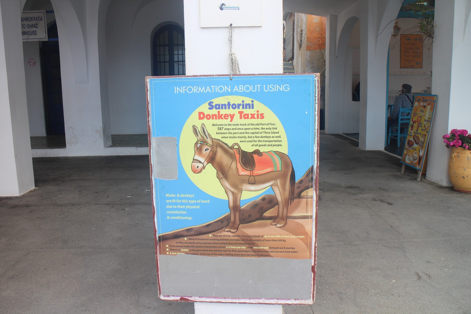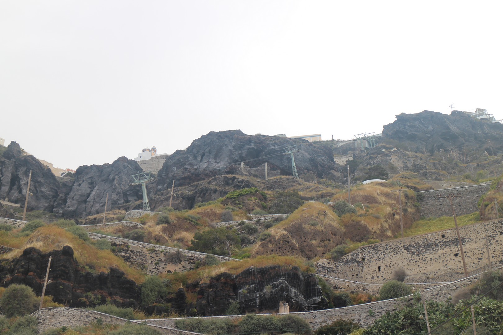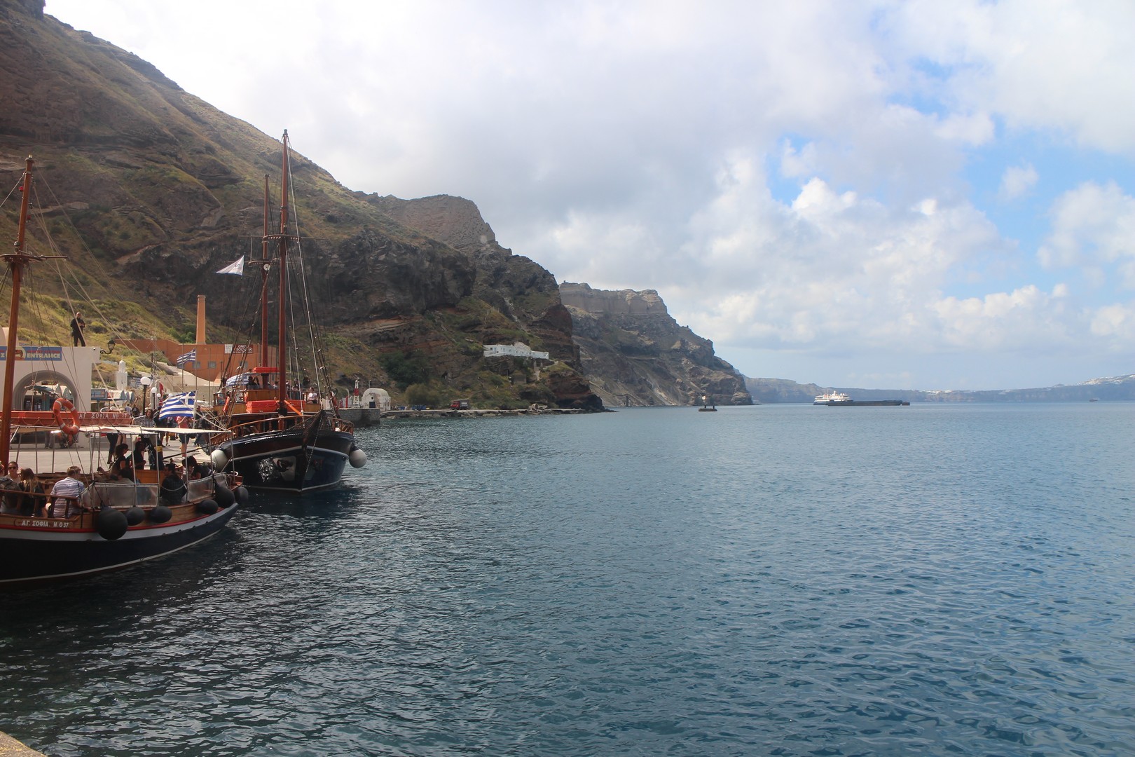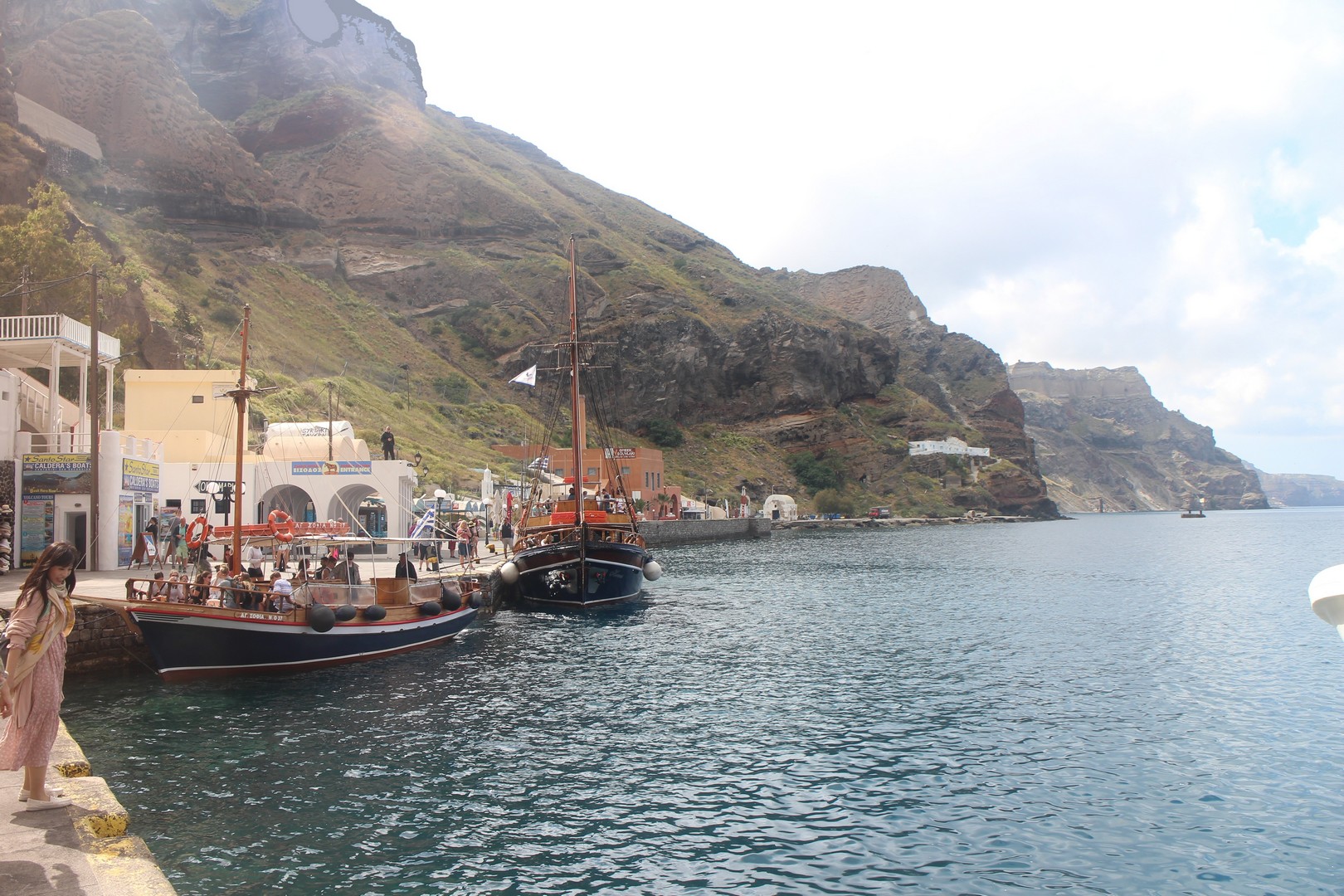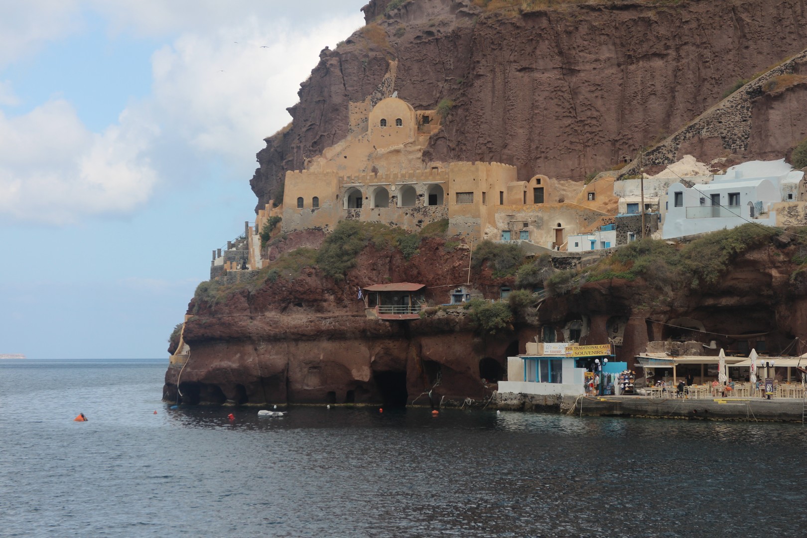 Le vieux port est isolé de la ville de Fira par la falaise. On s'y rend soit par un chemin muletier soit par téléphérique. |