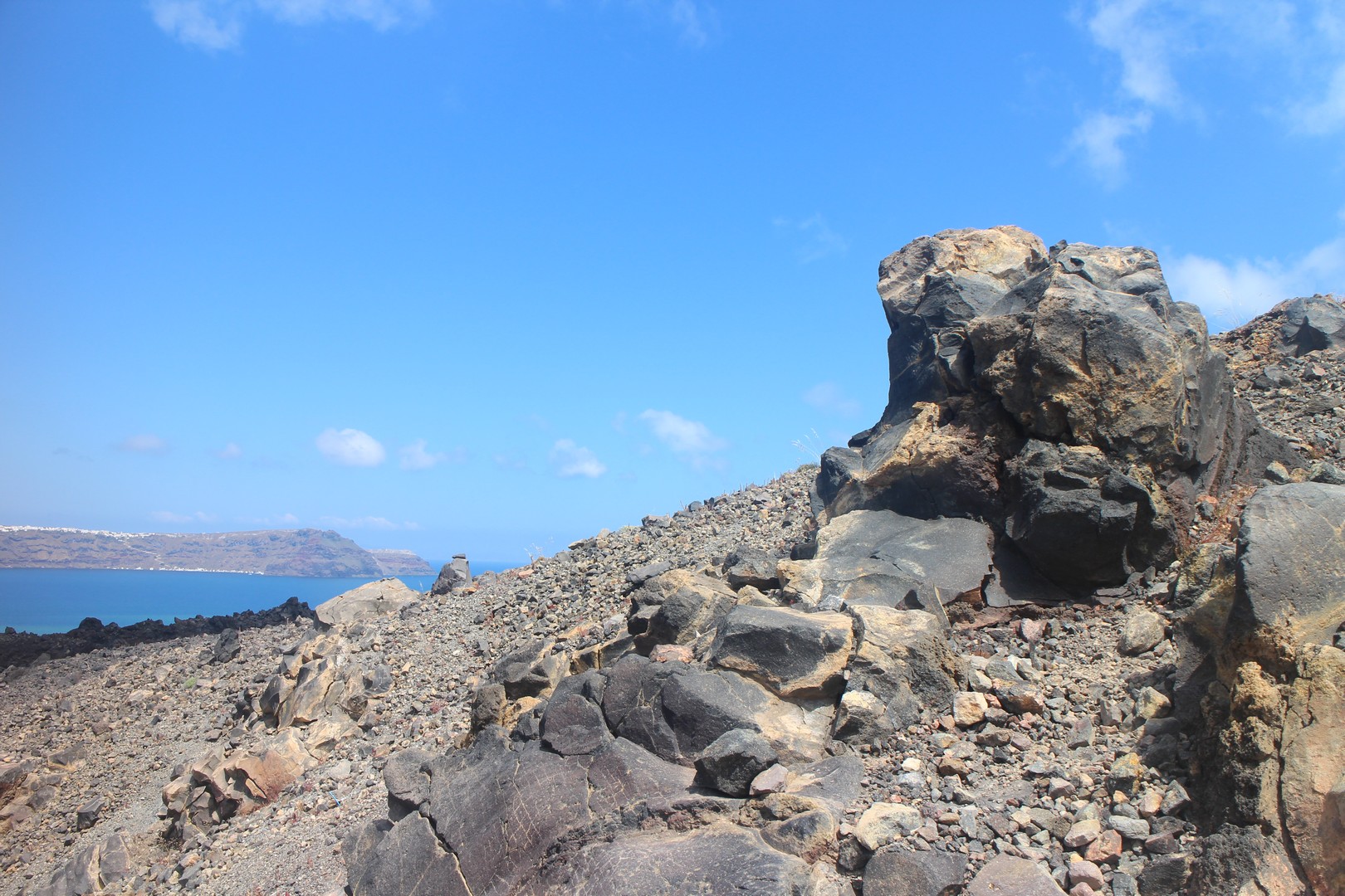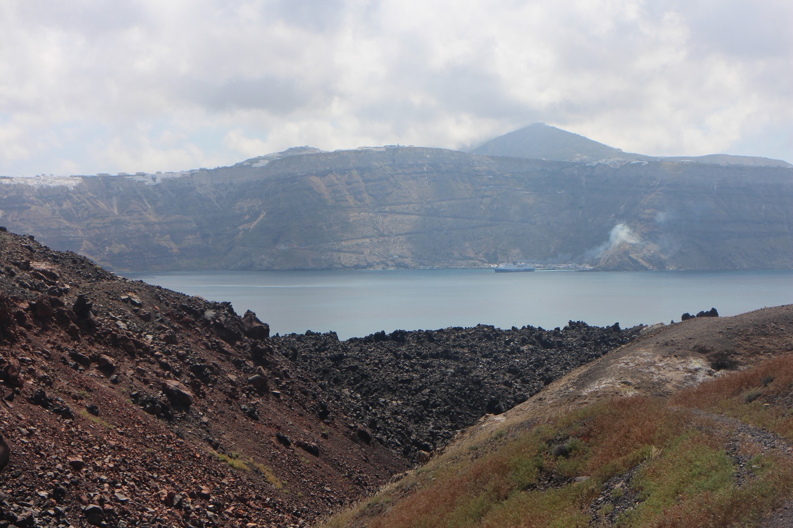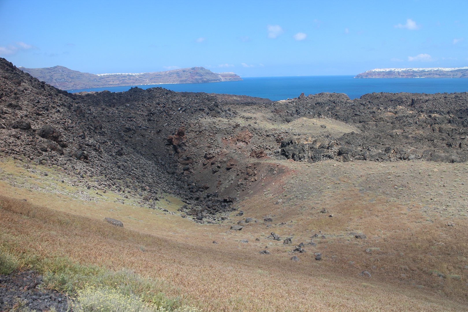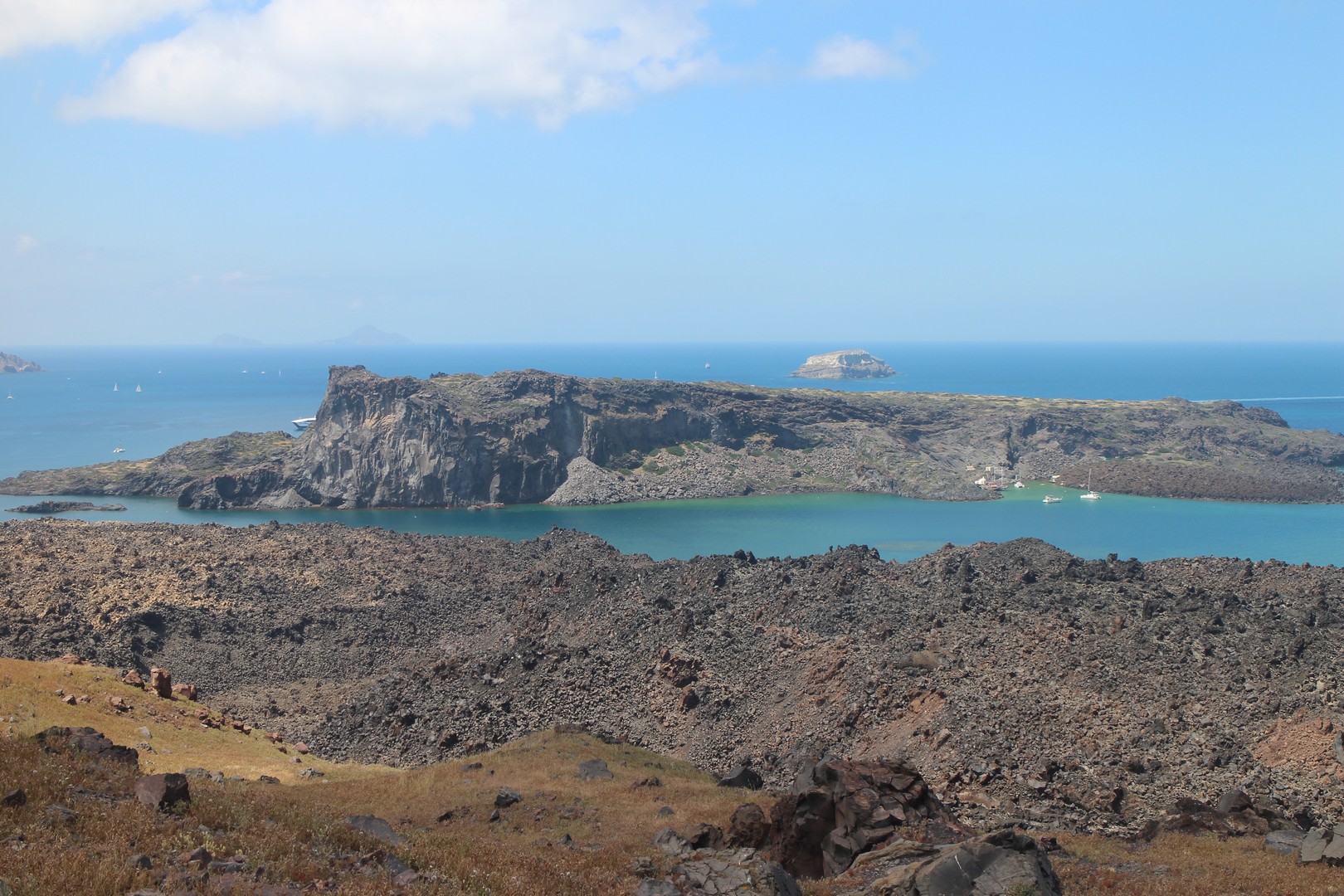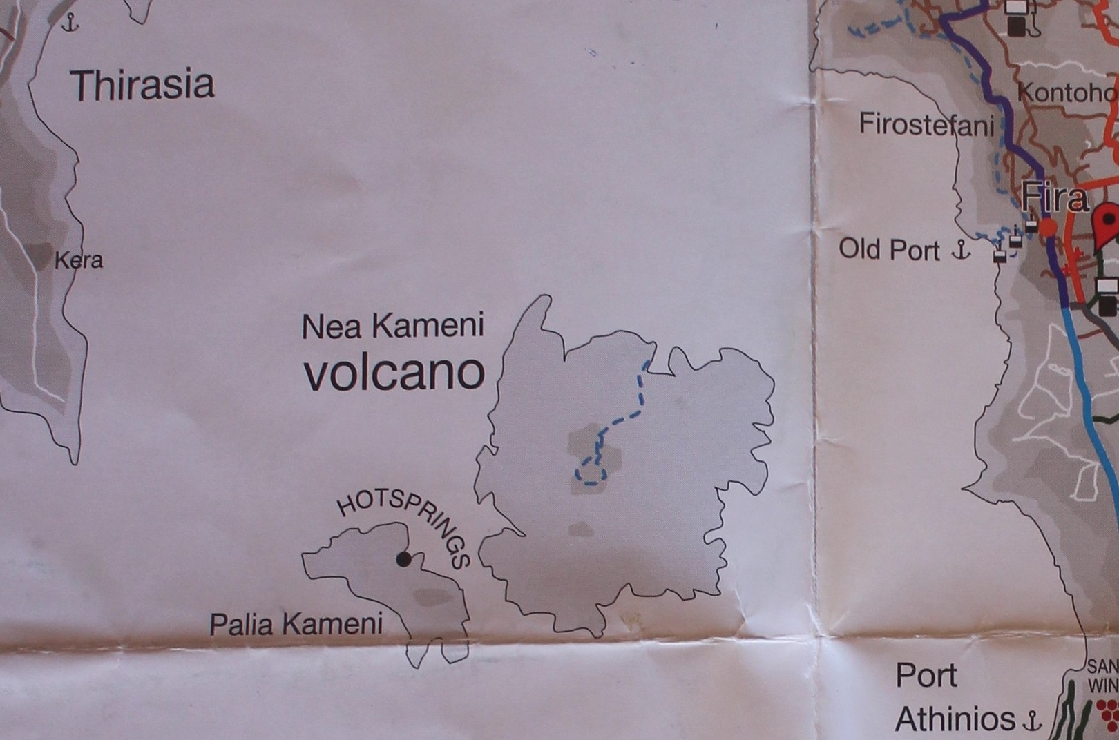 Vulcanos (Néa Kaméni) est, comme son nom l'indique, une île volcanique à l'ouest de Santorin. Néa Kaméni se situe au coeur de l’archipel. On le considère comme le volcan de Santorin car il a donné naissance aux différentes îles de l’archipel. Le volcan est actif même s’il n’est pas en éruption. On peut notamment le voir avec les fumerolles visibles notamment au niveau du cratère. Il n'y pas d'habitation sur l'île, on peut s'y rendre en bateau par exemple par le tour des îles proposé à partir du vieux port de Fira. Son point culminant est à 150 mètres au dessus du niveau de la mer.
