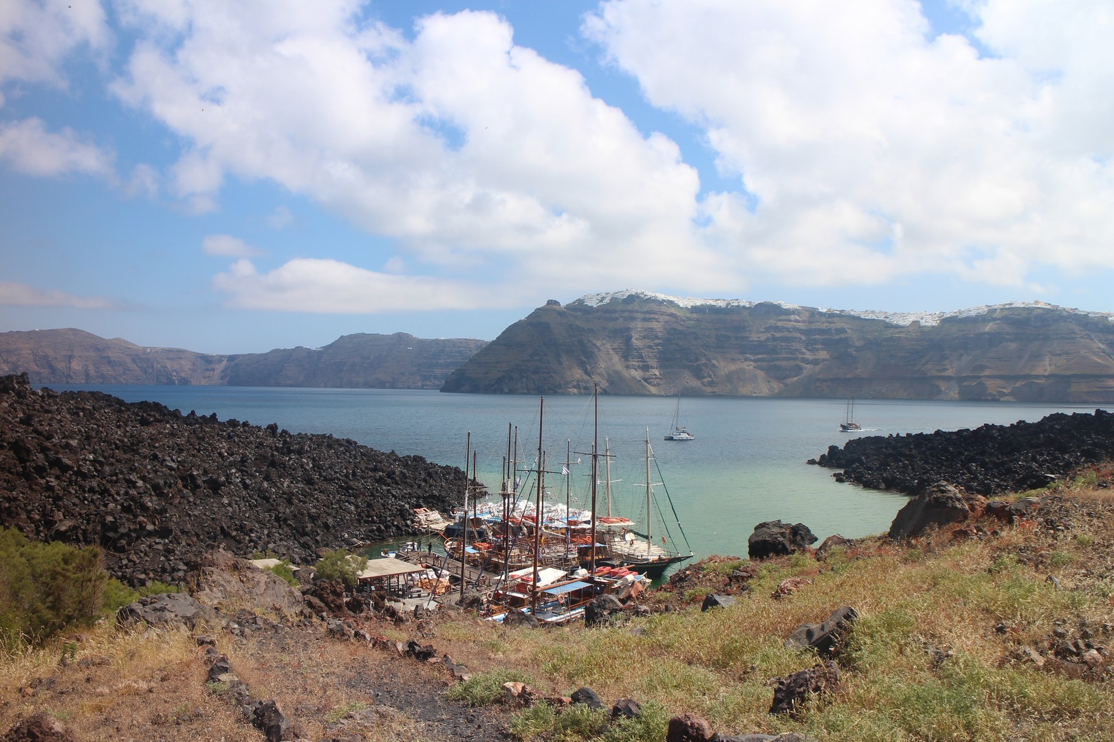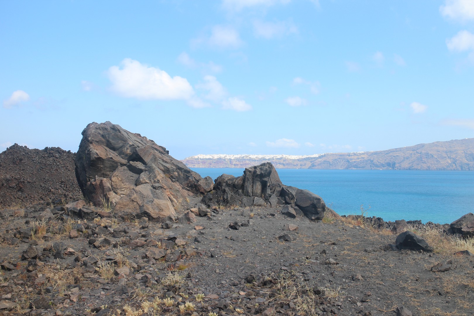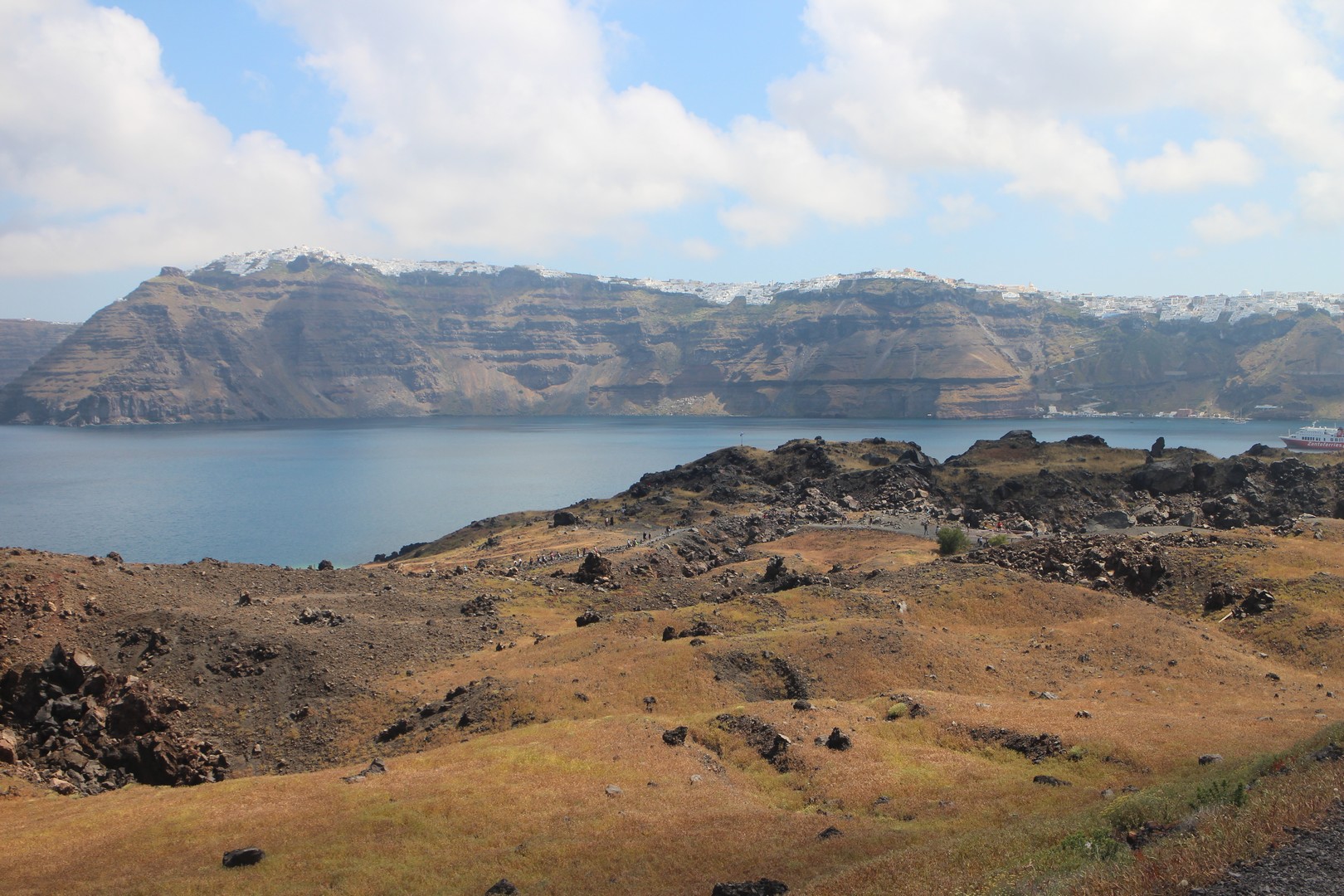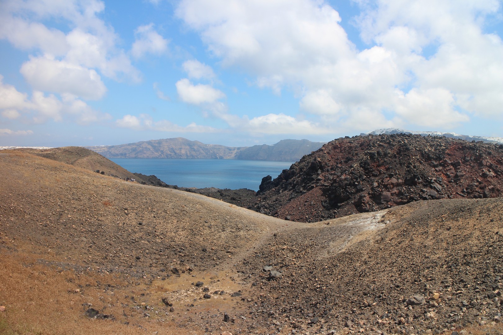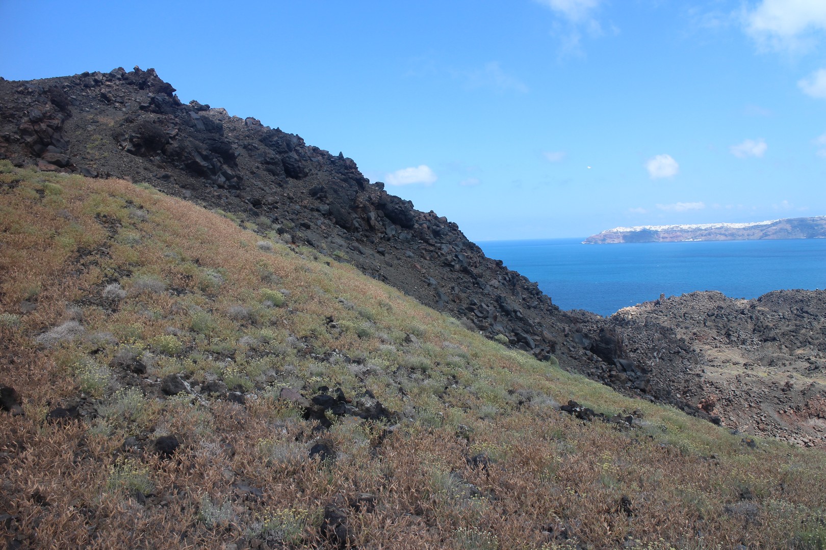 Vulcanos (Néa Kaméni) est, comme son nom l'indique, une île volcanique à l'ouest de Santorin. Néa Kaméni se situe au coeur de l’archipel. On le considère comme le volcan de Santorin car il a donné naissance aux différentes îles de l’archipel. Le volcan est actif même s’il n’est pas en éruption. On peut notamment le voir avec les fumerolles visibles notamment au niveau du cratère. Il n'y pas d'habitation sur l'île, on peut s'y rendre en bateau par exemple par le tour des îles proposé à partir du vieux port de Fira. Son point culminant est à 150 mètres au dessus du niveau de la mer.