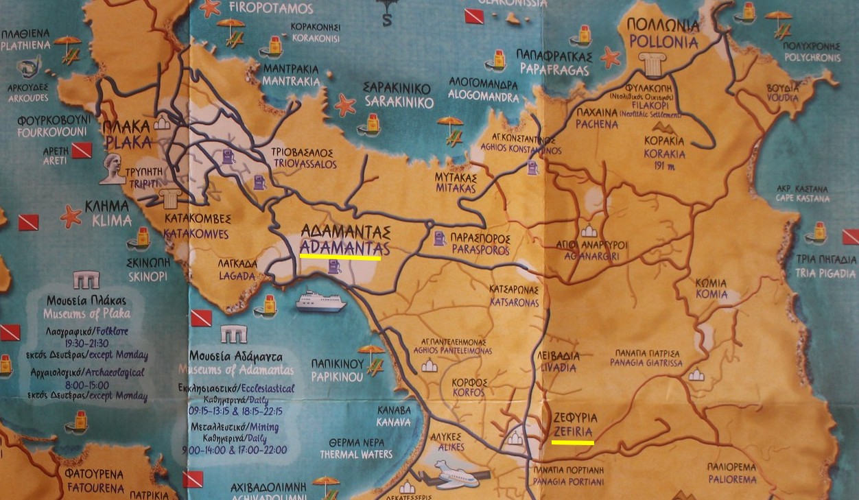 Zefiia (ou Zefyria) est située dans la partie centre-est de l’île de Milos. Le village n’est pas très connu des touristes car il est loin du bord de mer et des autres villages. Le village est vieux et a une belle église au centre. Il y a aussi une taverne et des chambres à louer..