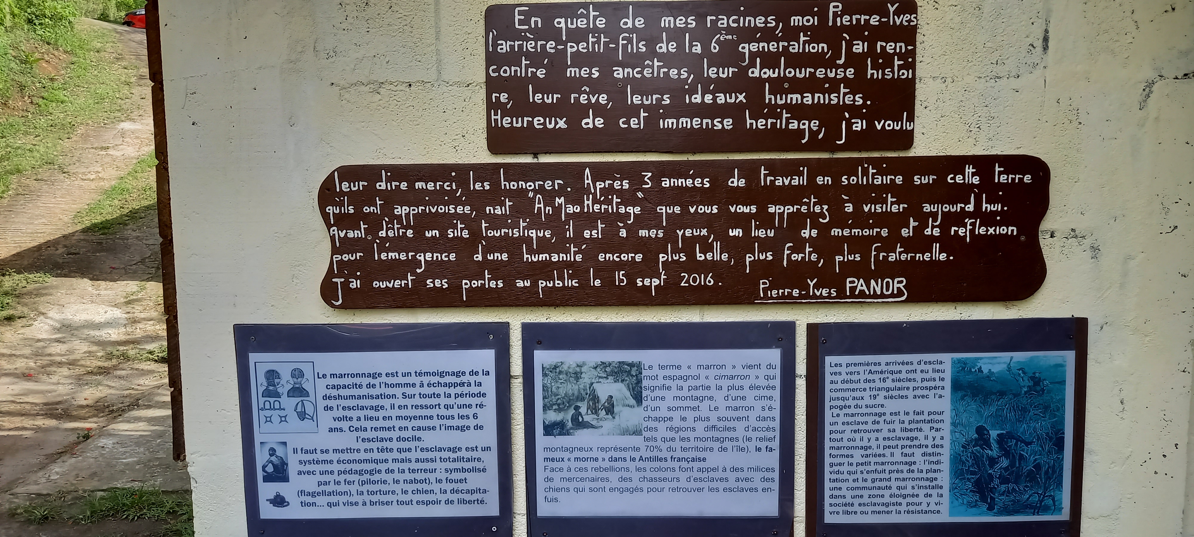 An Mao est un jardin paysagé et historique en Martinique, créé par Pierre-Yves Panor pour honorer ses ancêtres et promouvoir la culture martiniquaise. An Mao est situé sur les hauteurs du Morne Gommier, dans la commune du Marin. Ce jardin unique est un hommage aux ancêtres de Pierre-Yves Panor, qui ont vécu dans cette région après l'abolition de l'esclavage. Le jardin met en lumière les savoirs ancestraux, les plantes médicinales, et le rôle des arbres et des légendes dans le développement socioculturel de la Martinique. Ce jardin a été conçu pour raconter l'histoire des esclaves marrons et leur lutte pour la liberté. Pierre-Yves Panor, poète et militant, a créé cet espace non seulement comme un lieu touristique, mais aussi comme un espace de mémoire et de partage culturel. Il vise à enrichir l'humanité en honorant les idéaux de paix, de liberté et de fraternité transmis par ses ancêtres. Les visiteurs peuvent participer à des visites guidées de deux heures, où Pierre-Yves partage ses connaissances sur l'histoire de la Martinique, la médecine traditionnelle, et les plantes qui ont joué un rôle crucial dans la vie des ancêtres. Les visites sont souvent décrites comme émouvantes et enrichissantes, offrant une perspective unique sur la culture martiniquaise. |