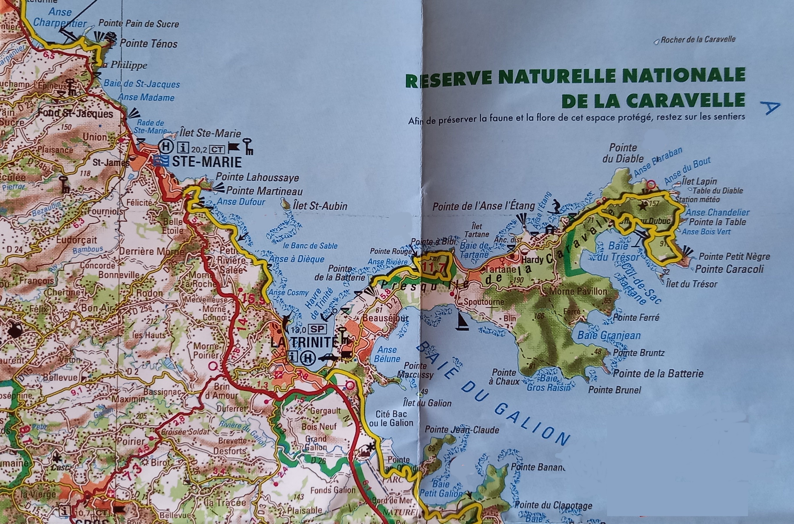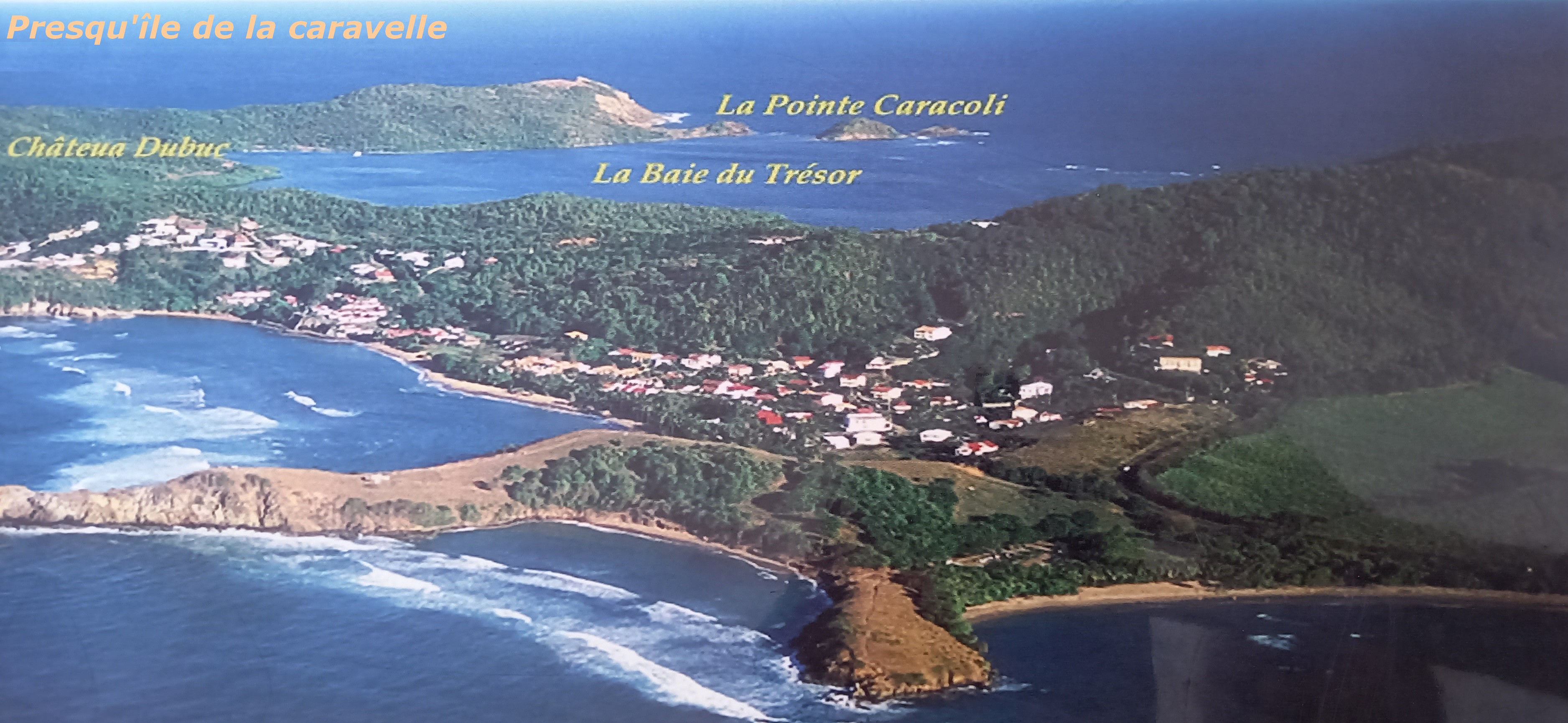 La presqu’île de la caravelle se situe dans la commune de Trinité. On peut faire une randonnée soit celle du grand sentier (3 h 30 pour voir le phare de la Caravelle, la station météo, la pointe Caracoli, la baie du trésor) ou du petit sentier (1 h 30 pour passer dans la forêt et dans la mangrove). Pour rejoindre le début de la randonnée, il faut suivre les panneaux pour arriver à Trinité, puis suivre ceux qui emmènent aux ruines du château Dubuc ou à la réserve naturelle de la presqu’île de la Caravelle.