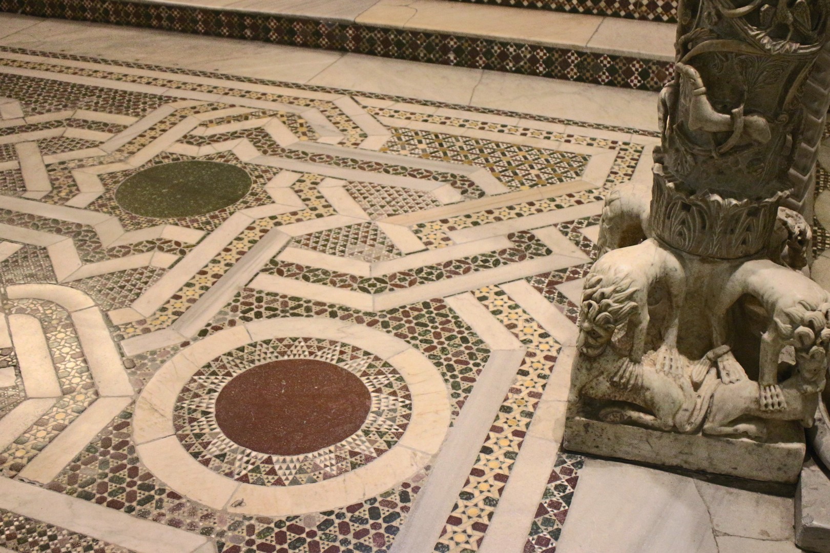 Très beaux chandeliers de marbre très hauts de toute beauté. Plafond à "muqarnas" en bois avec des formes hexagonales ou octogonales.