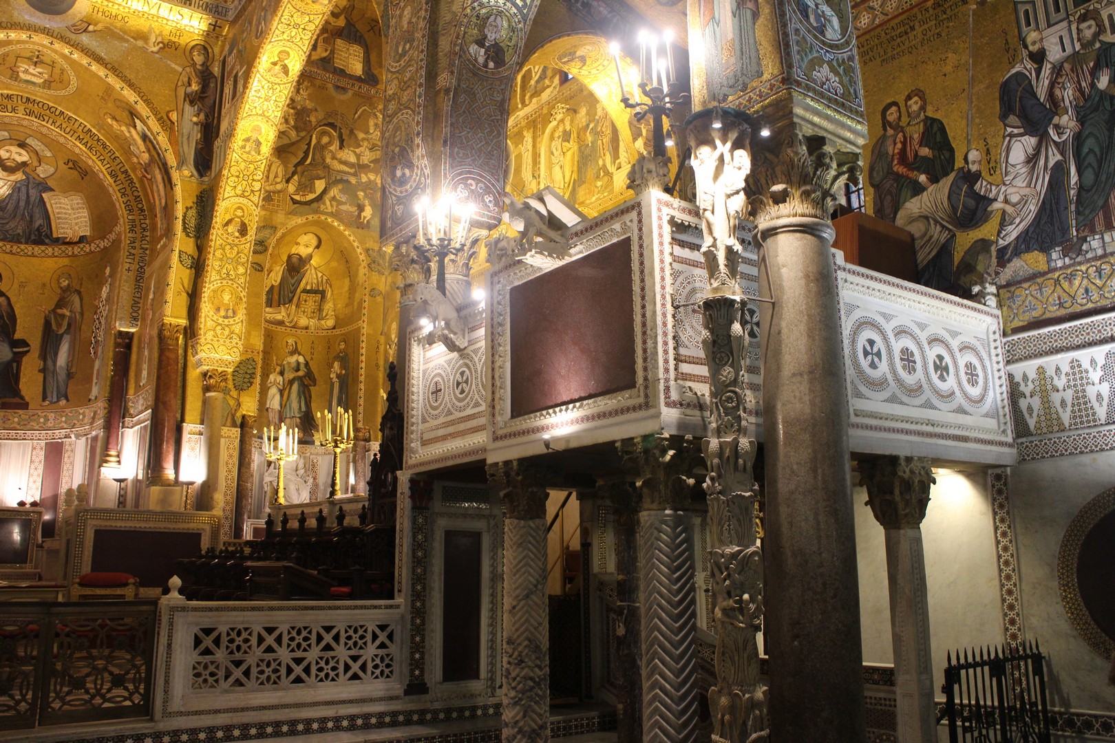 La chapelle Palatine est située au premier étage du Palais des Normands. C’est peut-être la plus belle merveille de Palerme avec sa décoration en mosaïques hors du commun. Elle mélange plusieurs styles dus à des inspirations latines, byzantine et musulmanes. Cette basilique à trois nefs dédiée aux saints Pierre et Paul fut édifiée à la demande de Roger II entre 1130 et 1132, pour devenir l’église de la famille royale.