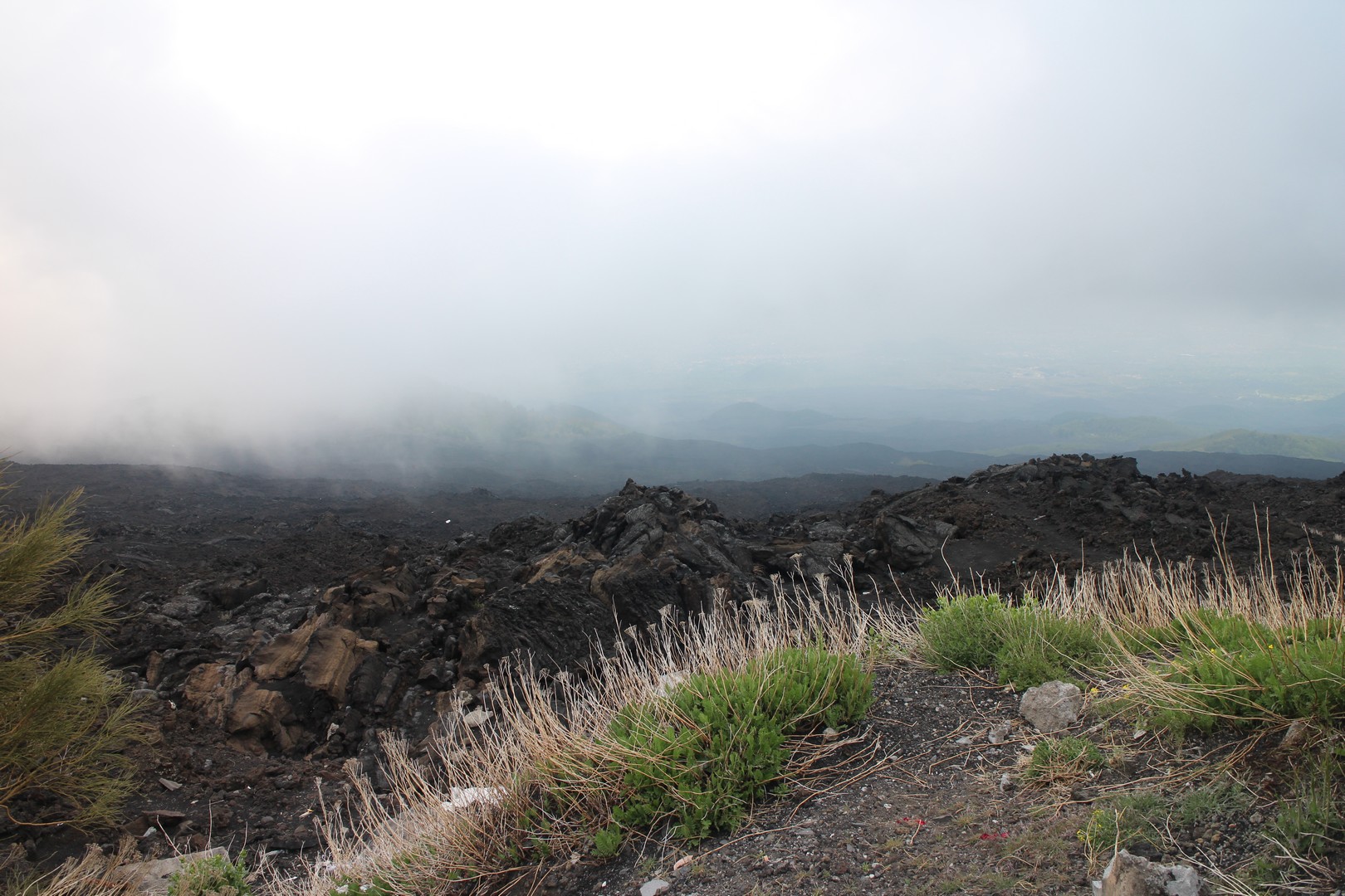 Un peu avant Sapienza visite du Crateri Silvestri (paysage lunaire mais un peu dans les nuages). Un peu plus loin, on peut prendre le téléphérique qui conduit à 1923 mètres pour commencer l'ascension vers le volcan.