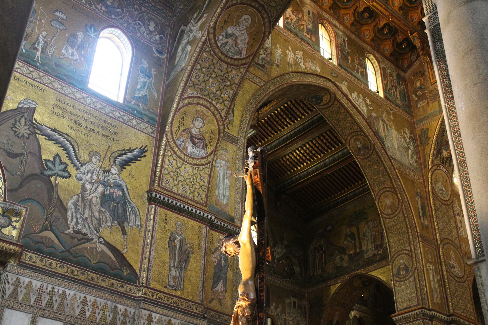 L'intérieur de la cathédrale est unique. Son plan est celui des basiliques à croix latines et les nefs sont séparées par 2 rangs de 9 colonnes, qui proviennent toutes d’édifices romains antiques. Sur leurs chapiteaux, on remarque des arcs brisés de type arabisant. Le chœur est presque un édifice à part, surélevé et flanqué de 3 absides orientées au levant, suivant la tradition byzantine. Mais le joyau reste le cycle de mosaïques à fond doré, d’une beauté spectaculaire, qui se déroule le long des parois supérieures. Avec ses 6 340 m², c’est le plus vaste d’Italie, et il fut réalisé entre 1180 et 1190 en un temps record. Dans les différents cadres sont représentés des épisodes extraits de la Bible et du Nouveau Testament, accompagnés d’inscriptions en grec et en latin. Les scènes de la Genèse, dans la nef centrale, sont particulièrement belles, tandis que le majestueux Christ Pantocrator achève idéalement tout le cycle.