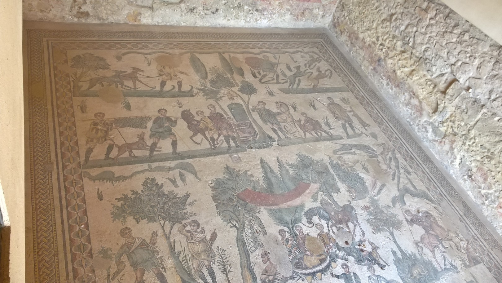 La salle de la petite chasse La chasse semble se dérouler dans une réserve. Vétus d'une robe courte, un manteau sur les épaules, et chaussé de jambières, les chasseurs sont en pleine battue de chasse, se servant d'armes ou de filets suivant le gibier recherché. La mosaïque, réalisé en cinq parties semble un grand tableau encadré (7,30 m x 5,90 m) représente différents épisodes d'une partie de chasse, commençant par le départ des chasseurs avec leurs chiens, l'invocation à Diane, la capture de lièvres, un banquet au centre et un épisode sanglant avec un sanglier.