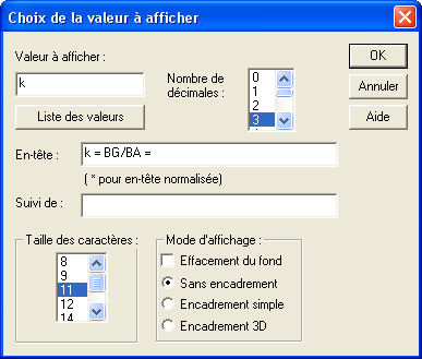 Dans cette boîte, taper k pour la valeur à afficher et 3 pour le nombre de décimales. Dans le champ En-tête, taper : k = BG/BA =. En validant, on obtient la figure (ici animée par l'applet) :