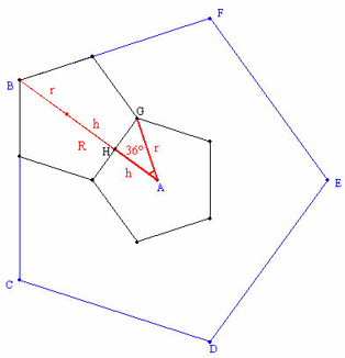Créer un nouveau document par l'icône Nouvelle figure et placer deux points A et B. Construire le pentagone de centre A et dont un sommet est le point B comme au I) Définir un nouveau calcul par le menu Calculs, Calcul algébrique dans R, Nouveau calcul. Dans la boîte de dialogue obtenue, taper k pour le nom du calcul et (3 - rac(5))/2 pour la formule puis valider. On utilise ensuite les homothéties de centre A et B et de rapport k pour obtenir les petits pentagones et on applique une rotation de centre A et d'angle 36° au petit pentagone centré en A. Enfin on effectue les rotations successives de centre A et d'angle 72° pour obtenir les autres petits pentagones :