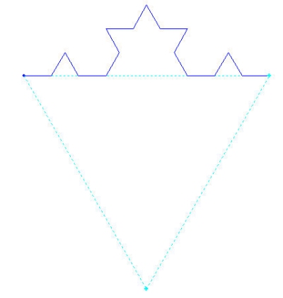 La courbe de Von Koch est donnée à son étape 2. Il faut construire cette même courbe sur les deux autres côtés du triangle équilatéral tracé en pointillés pour obtenir ce que l'on appelle le flocon de Von Koch. Il faut utiliser une rotation, en trouver le centre et l'angle et construire le flocon.