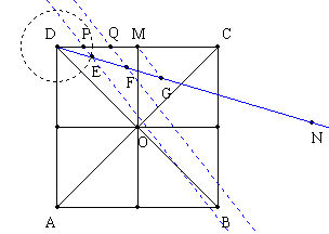 I) Création de ce motif de base Le carré étant donné, la création du motif de base utilise la propriété de Thalès pour partager un segment en trois parties égales. On trace une droite (DN) et on construit trois segments de même longueur (en construisant des cercles de même rayon). On obtient ainsi les points P et Q sur le côté [DC] et de même les points sur la diagonale [DB]. Les autres points sont obtenus par report de longueur (cercle) ou par intersection (perpendiculaires).