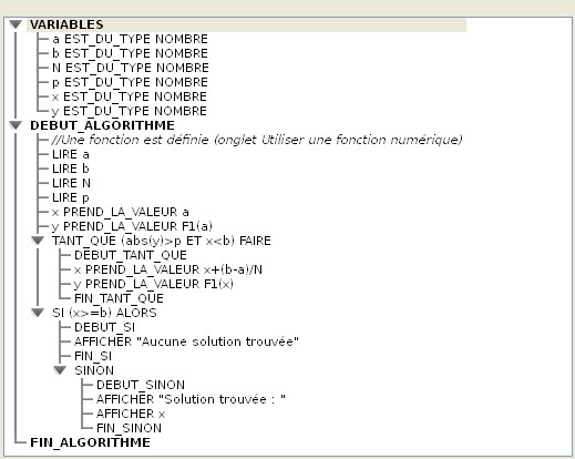 Dans cet intervalle {a ; b], on recherche une solution, si elle existe, de l'équation : f(x) = 0. Recherche par balayage On peut diviser l'intervalle [a ; b] en N intervalles de même longueur et parcourir [a ; b] par pas de longueur ces intervalles en calculant l'image par f de l'extrémité de chacun des N intervalles. ![]() On trouve une solution de l'équation f(x) = 0 dès que la valeur absolue d'une image est plus petite qu'une valeur p donnée (1/10, 1/100, 1/1000 ...). La précision d'une solution dépend de la fonction f, du nombre p ainsi que du nombre N d'intervalles (que l'on peut prendre grand). Algorithme avec Algobox Voici un exemple d'algorithme (qui utilise la structure TANT QUE ... FAIRE pour le traitement et une structure SI .. ALORS pour l'affichage) et qui arrête le balayage dès qu'une solution a été trouvée ou que la valeur testée est supérieure à b. La définition de la fonction doit se faire dans l'onglet Utiliser une fonction numérique en bas de la fenêtre du logiciel en cochant la case Utiliser une fonction. On écrira l'expression de la fonction en utilisant la syntaxe d'Algobox, par exemple pour définir la fonction f telle que f(x) = x3 + x² -3x - 1, on écrira : pow(x,3)+pow(x,2)-3*x-1. Le nom de la fonction est F1 et dans le programme, l'image d'un nombre a par la fonction F1 s'écrira : F1(a). ![]() Télécharger le fichier Algobox de ce premier exemple. Remarques Dans cet algorithme, si le nombre d'intervalles est trop petit, la précision sera limitée, s'il est trop grand la durée du traitement peut être importante. Ce nombre N d'intervalles peut être fixé dans l'algorithme au lieu de le faire saisir. Par exemple, avec f(x) = x3 + x² - 3x - 1 et en prenant le nombre d'intervalles égal à 100000, on peut avoir une solution x0 sur l'intervalle [0 ; 2] telle que |f(x0)| < 0.0001 en quelques secondes. La précision sur la valeur de la solution x0 trouvée est de l'ordre de 0.00001. Cet algorithme n'est pas très performant. En revanche il ne produit pas d'erreur si la fonction donnée ne s'annule pas sur l'intervalle donné [a ; b]. |