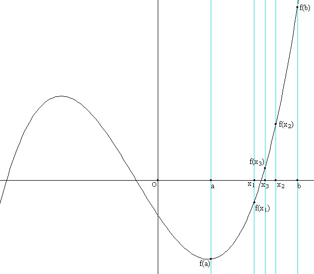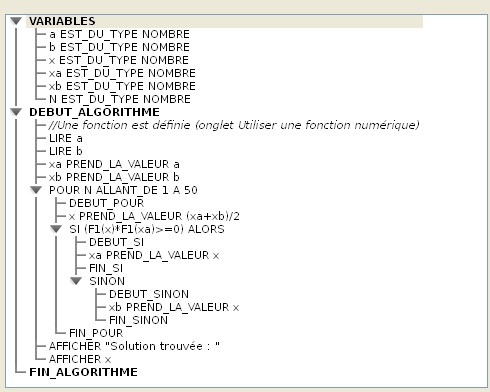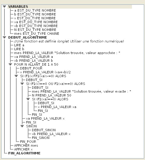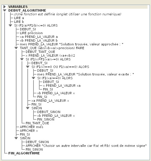 Dans cet intervalle {a ; b], on recherche une solution, si elle existe, de l'équation : f(x) = 0. Recherche par dichotomie Dans l'exemple ci-dessous, [a ; b] est l'intervalle où se trouve la solution cherchée. ![]() x1 milieu de |a ; b] est tel que f(x1) et f(a) sont de même signe donc [x1 ; b] est l'intervalle où se situe la solution. x2 milieu de [x1 ; b] est tel que f(x2) et f(x1) sont de signe contraire donc [x1 ; x2] est l'intervalle où se trouve la solution. x3 milieu de [x1 ; x2] est tel que f(x3) et f(x1) sont de signe contraire donc x1 ; x3] est l'intervalle où se situe la solution, etc. Sur cet exemple, la fonction est croissante : on peut vérifier que la méthode de sélection des intervalles successifs est la même lorsque la fonction est décroissante. Algorithme simple avec Algobox Dans ce premier algorithme une structure SI ... ALORS ... SINON emboîtée dans une simple boucle avec compteur permet de trouver une solution lorsqu'il y en a une. 50 itérations sont suffisantes pour avoir une précision supérieure ou égale à d/250 où d est l'amplitude de l'intervalle [a ; b]. En effet, on divise par deux à chaque itération l'amplitude de l'intervalle où se trouve la solution. Une structure SI ... ALORS interne à la boucle permet de choisir la bonne extrémité pour l'intervalle suivant. La définition de la fonction doit se faire dans l'onglet Utiliser une fonction numérique en bas de la fenêtre du logiciel en cochant la case Utiliser une fonction. On écrira l'expression de la fonction en utilisant la syntaxe d'Algobox, par exemple pour définir la fonction f telle que f(x) = x3 + x2 -3x - 1, on écrira : pow(x,3)+pow(x,2)-3*x-1. Le nom de la fonction est F1 et dans le programme, l'image d'un nombre a par la fonction F1 s'écrira : F1(a). ![]() Télécharger le fichier Algobox de ce premier exemple. Remarques Dans cet algorithme, si la fonction f ne s'annule pas dans l'intervalle donné ou que f(a) et f(b) ne sont pas de signe contraire, le programme donne une solution erronée. En effet, l'algorithme est fondé sur cette hypothèse. Par exemple, sur l'intervalle [-1 ; 1] l'équation : 1 + x² = 0 donnera une solution alors qu'il n'en existe pas et l'équation -1 + x² = 0 donnera une solution erronée sur l'intervalle [-2 ; 2] et la bonne solution sur l'intervalle [0.5 ; 2]. Mais d'autres erreurs sont engendrées par la comparaison des signes de f(x) et f(a) à chaque itération. En effet, dans la condition (F1(x)*F1(a)>=0) de la structure Si ... ALORS, les cas F1(x) = 0 et F1(a) = 0 ne sont pas traités. Par exemple, les équations suivantes n'auront pas de solution valide sur [0 ; 1] : x² = 0 |x| = 0 ici, bien que ces deux équations possèdent une solution et que les fonctions définies par f(x) = x² et g(x) = |x| soient croissantes sur cet intervalle, on a ici le cas où f(0)=0 et g(0) = 0. F1(x) = 0 est le cas où le milieu d'un intervalle est exactement une solution. Par exemple si on cherche une solution de l'équation : -1 + x² sur l'intervalle [0 ; 2], une solution est justement x = 1 (le milieu de l'intervalle) et l'algorithme précédent continue le traitement avec des intervalles qui ne contiennent plus la solution. On doit donc vérifier au préalable l'allure de la courbe représentative de la fonction choisie par exemple avec un logiciel traceur de courbe et déterminer judicieusement l'intervalle approprié. Le logiciel libre MathGraph32 (téléchargement gratuit) est un logiciel de géométrie dynamique qui est aussi un excellent traceur de courbe qui apporte une aide précieuse. Algorithme amélioré Cet algorithme gère les cas où f(x) = 0 et f(a) = 0. Il précise aussi si la solution trouvée est exacte ou approchée.. ![]() Télécharger le fichier Algobox de ce premier exemple. Remarque Avec cet algorithme, on doit toujours veiller à ce que la fonction s'annule dans l'intervalle donné et que f(a) et f(b) soient de signe contraire. Algorithme permettant de choisir la précision avec Algobox Voici un exemple d'algorithme qui remplace la boucle avec compteur par une structure TANT QUE ... FAIRE. On arrête le traitement quand l'intervalle contenant la solution a une amplitude inférieure à une précision donnée (1/10, 1:100, 1/1000 ...), ce qui assure d'avoir une solution de l'équation f(x) = 0 avec au moins cette précision. ![]() Télécharger le fichier Algobox de ce deuxième exemple. Remarques Comme dans les exemples précédents, si la fonction n'a pas de zéro dans l'intervalle [a ; b] ou que f(a) et f(b) ne sont pas de signe contraire, le programme donne une solution erronée. En revanche, si ces conditions sont vérifiées, cet algorithme est très performant. Pour s'en rendre compte on peut ajouter une variable, par exemple N, permettant de compter le nombre d'itérations nécessaires pour une précision donnée. Il faut donc ajouter une variable : N EST DU_TYPE NOMBRE Puis ajouter une ligne en première ou dernière position dans la structure TANT QUE ... FAIRE : N PREND_LA_VALEUR N+1 Et enfin faire afficher la variable N en fin d'algorithme (ajouter un retour à la ligne dans l'affichage de x) : AFFICHER N Avec la fonction f telle que f(x) = x3 + x2 -3x - 1, une recherche d'une solution de l'équation f(x) = 0 sur l'intervalle [0 ; 2] se fait en 15 itérations pour une précision de 0.0001. Télécharger le fichier Algobox de l'exemple modifié comme ci-dessus. Algorithme plus complet avec Algobox Il s'agit de modifier l'algorithme précédent en tentant de remédier au cas où l'utilisateur rentre des données non appropriées. On peut, par exemple, vérifier pour un intervalle [a ; b] donné que f(a) et f(b) sont de signe contraire et ne lancer le traitement que dans ce cas. On ajoute une structure SI ... ALORS ... SINON et on y introduit tout le traitement précédent à partir de la structure TANT QUE ... FAIRE. ![]() Télécharger le fichier Algobox de ce nouvel exemple. Remarque On peut également faire cette v