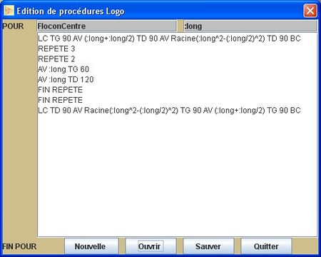 Il faut maintenant ajouter des instructions pour ramener la tortue au point de départ (c'est à dire au centre du flocon qui ne sera pas toujours l'origine du repère) et dans sa position initiale: LC TG 90 AV 30+30/2 TD 90 AV Racine(30^2-(30/2)^2) TD 90 BC REPETE 3 REPETE 2 AV 30 TG 60 AV 30 TD 120 FIN REPETE FIN REPETE LC TD 90 AV Racine(30^2-(30/2)^2) TG 90 AV 30+30/2 TG 90 CT Le but est maintenant de faire de ce tracé une procédure réutilisable en paramétrant la longueur du côté. Copier le code précédant (CTRL + C) puis cliquer sur le bouton Procédures puis sur Nouvelle procédure et coller le code (CTRL + V). Pour le nom de la procédure, taper : FLOCONCENTRE. Si on veut passer la valeur du côté dans la procédure, il faut le préciser en indiquant le nom de la variable représentant la longueur du côté. Choisissons la variable long. Une variable dans LOGO doit être précédée de deux points (:long). Le nom de la procédure doit immédiatement être suivi des variables utilisées dans la procédure précédées d'un espace, ce qui donne donc ici : FLOCONCENTRE :long Il faut ensuite remplacer dans la code, chaque occurence de la longueur du côté (30) par :long. La fenêtre de la procédure est donc : ![]() Pour essayer cette procédure, il suffit de taper dans la partie Editeur, le code suivant : FloconCentre :30 CT Cliquer ensuite sur le bouton Ajouter puis sur le bouton Exécuter : le flocon de côté 30 se dessine à l'écran. Ecrire maintenant le programme pour obtenir à l'écran la figure suivante : ![]() |