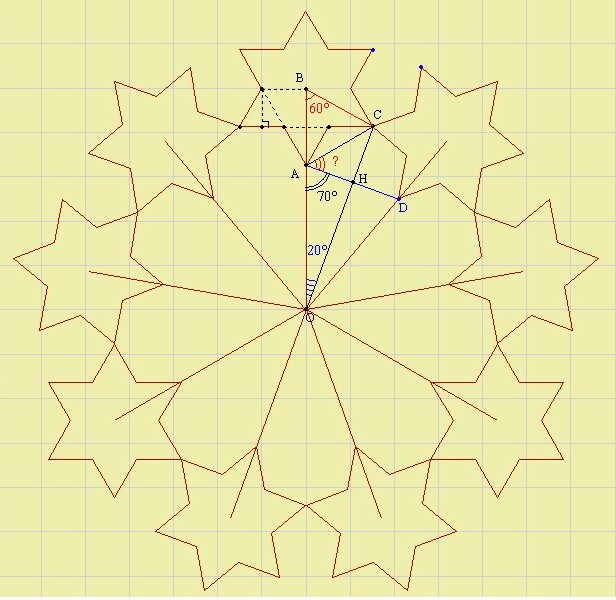On veut obtenir la figure suivante : ![]() On utilise la procédure FloconCentre (voir la partie Initiation, Exemple avec LOGO) après avoir avancé d'une certaine longueur (à calculer) à partir de l'origine du repère de manière à ce que chaque flocon n'aie qu'un seul point commun avec ses voisins. Dans un premier temps on veut dessiner 9 flocons de côté 10 comme ci-dessus. On demande aux élèves d'écrire l'algorithme pour cette figure. ' Position initiale (celle par défaut : l'origine du repère) ' Figure REPETER 9 fois Avancer d'une longueur à calculer Tracer un flocon de côté 10 Reculer de la même longueur que celle avancée Tourner d'un angle égal à 360/9 FIN REPETE Il est nécessaire de faire une étude géométrique pour calculer la longueur entre l'origine du repère et le centre d'un flocon. ![]() Pour 9 flocons de côté 10 :