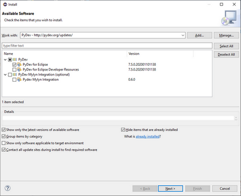 Dans la partie de centrale de cette même fenêtre, s'affichent alors divers composants, cocher PyDev for Eclipse (comme ci-dessus en ayant déroulé le nœud PyDev) puis cliquer sur le bouton Next (en bas).